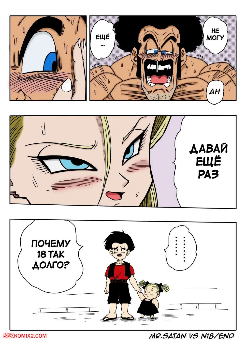 Порно комикс Dragon Ball. Мистера Сатана против Андроид 18. Mr. Satan vs Android 18. yamamoto. После турнира Андроид 18 отправилась к Сатане, чтобы получить деньги за сдачу. Сучка решила убедить мужика по полной и стала сосать его член, после чего раздвинула ножки и дала себя выебать.