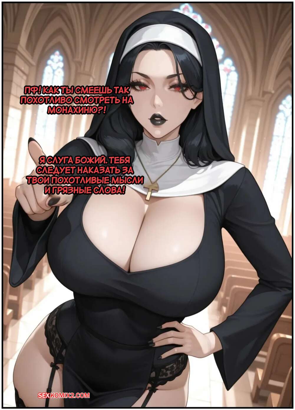 Порно комикс Настоящий грешник. The Real Sinner. Next Waifus. Горячая монашка положила глаз на парня, который пришел в церковь исповедаться. Она встала на колени и отсосала его большой хуй, после чего раздвинула ножки и дала себя трахнуть.