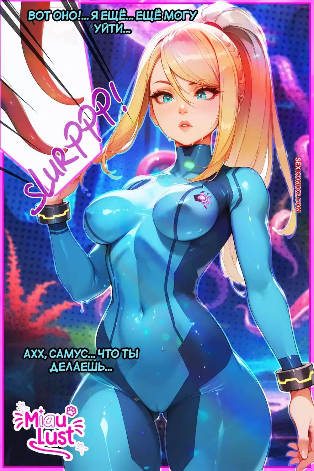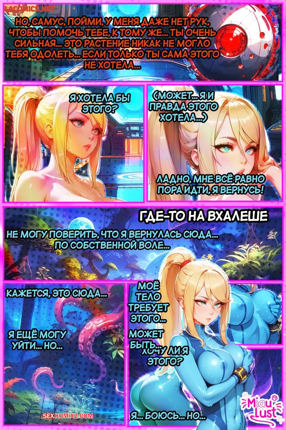 Порно комикс Соблазненная щупальцами. PinkPages. Samus. Miaulust Горячая блондинка Самус была схвачена большими тентаклями. Они сорвали на ней одежду, после чего стали трахать ее пизденку, заставляя ее мощно кончить.