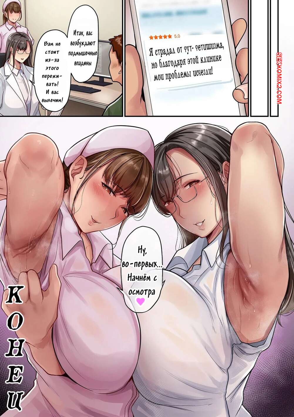 Порно комикс Соблазнительная фетиш ловушка. Bishuu Fetish na Wana. Taba Парнишка пришел в медпункт, где две горячие милфы в чулках решили с ним повеселиться. Они оголили ножки и стали ласкать его хуй, после чего оседлали парня и дали себя трахнуть.