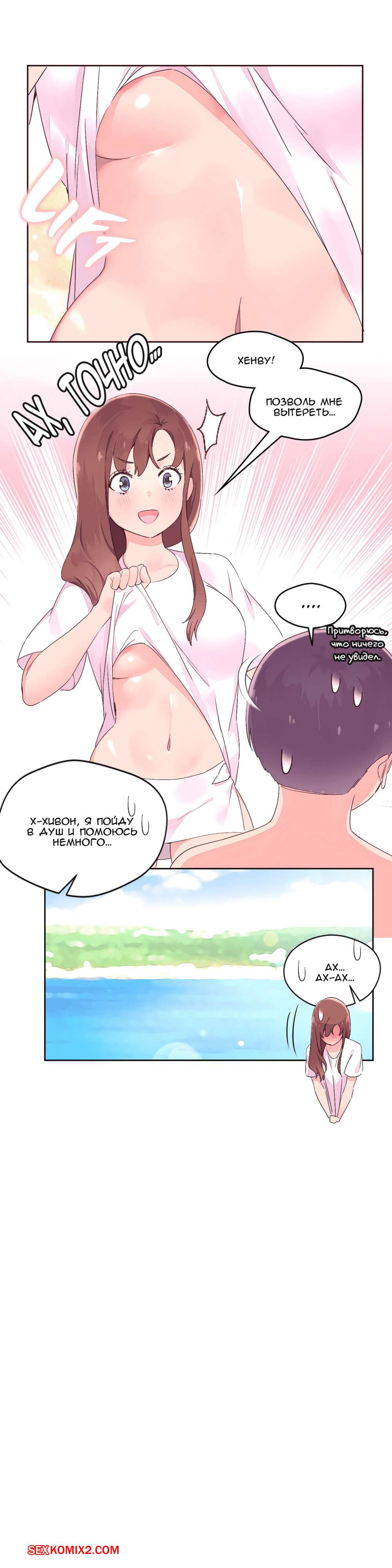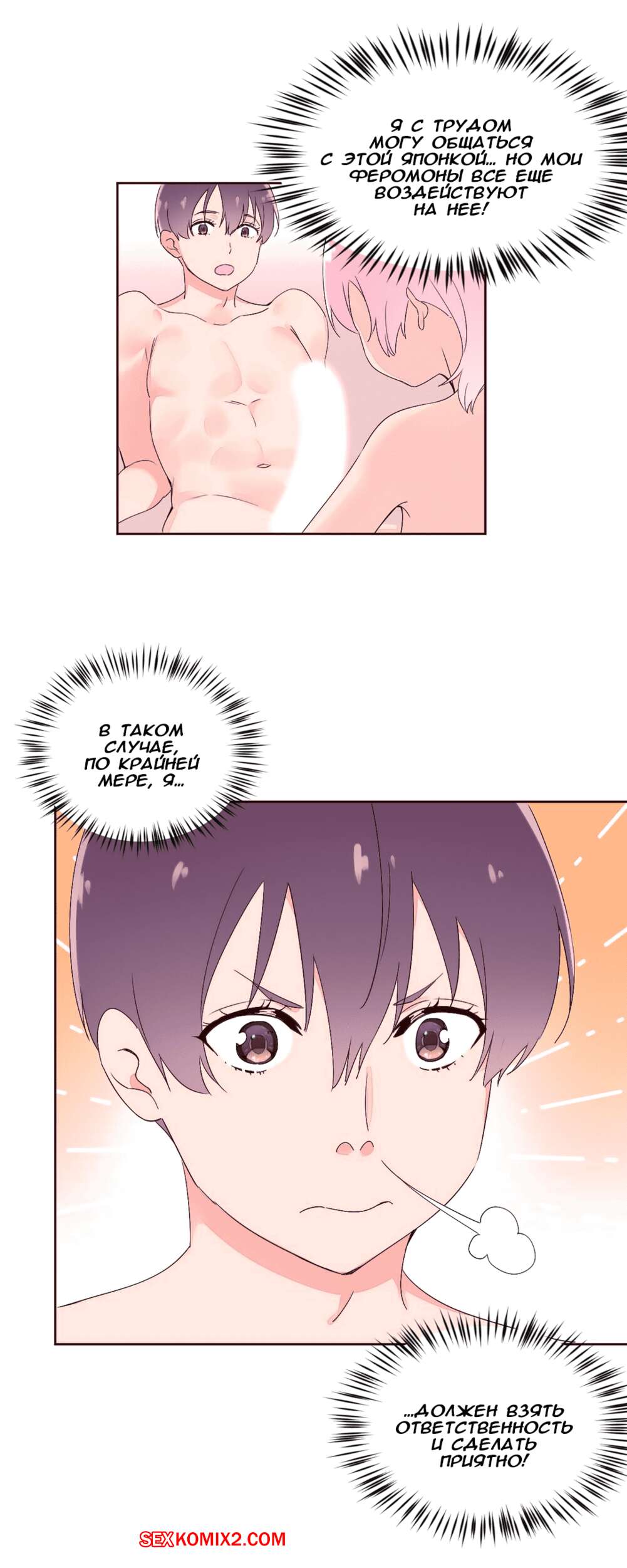 Порно комикс Феромонозависимые. Части 25 и 26 и 27. Парень отправился на море со своими знакомыми. Там его внимания привлекла шикарная японка. Он воздействовал на нее своими феромонами и они вместе отправились в номер, где девушка невероятно сильно его желала, а парень с трудом ее сдерживал.