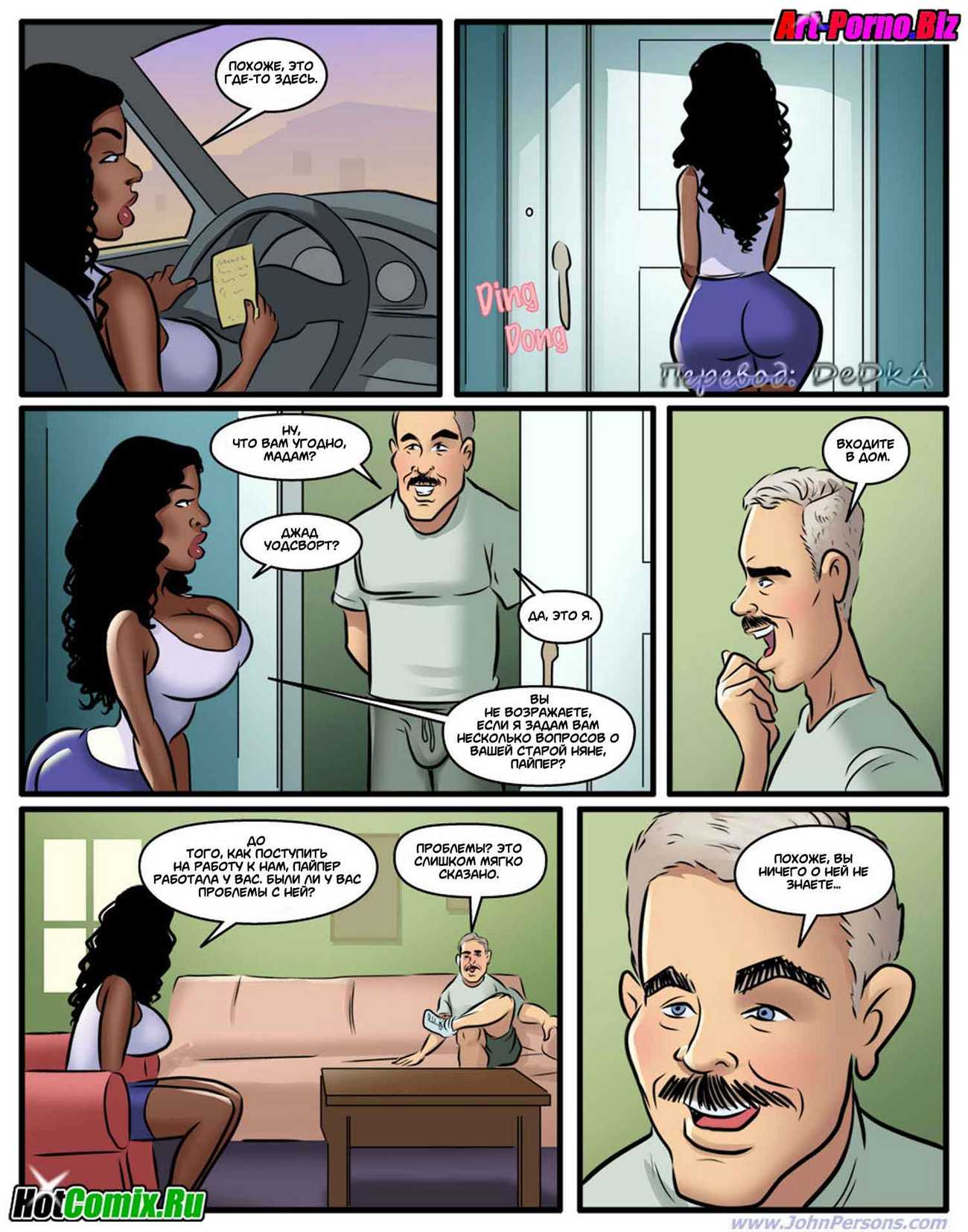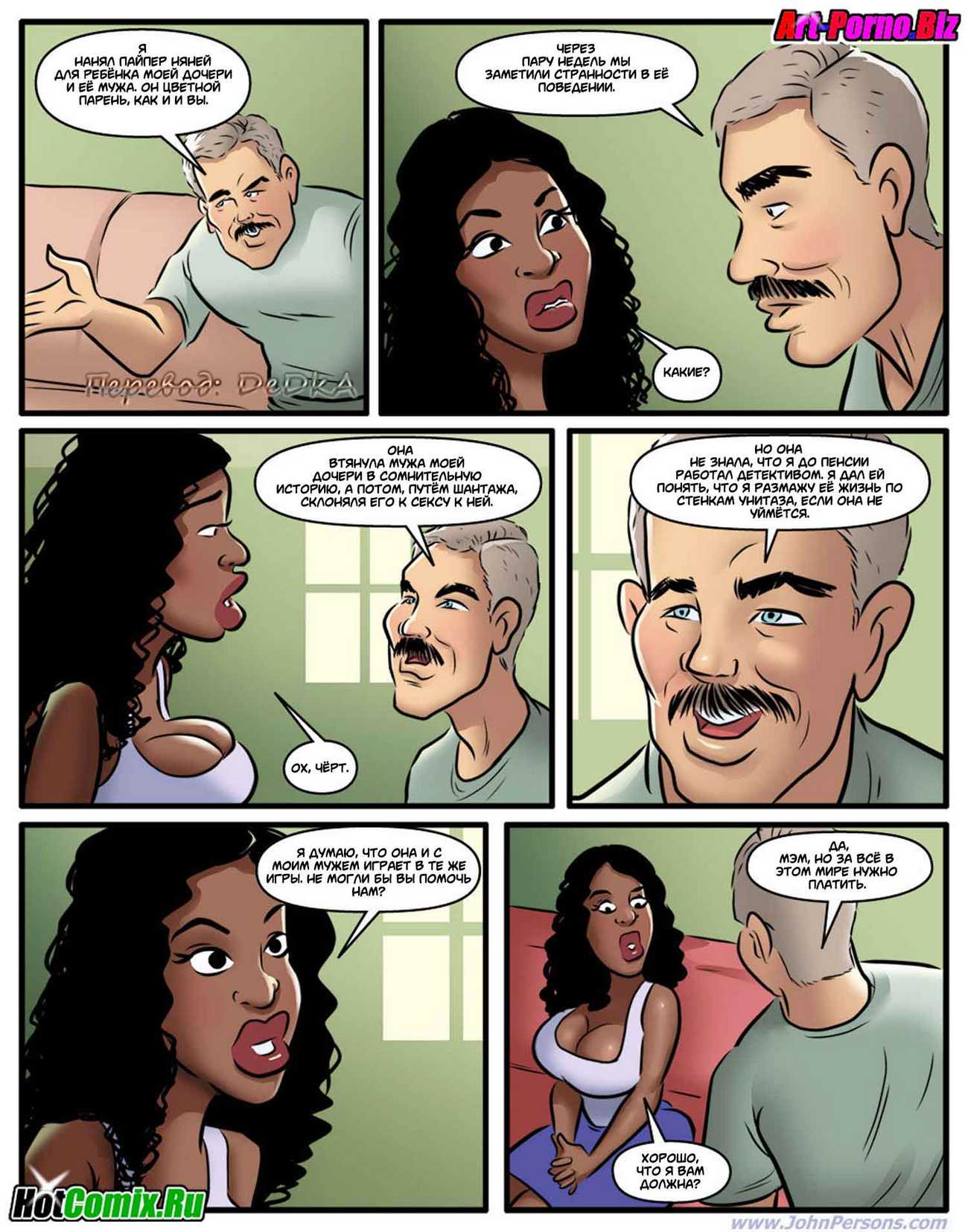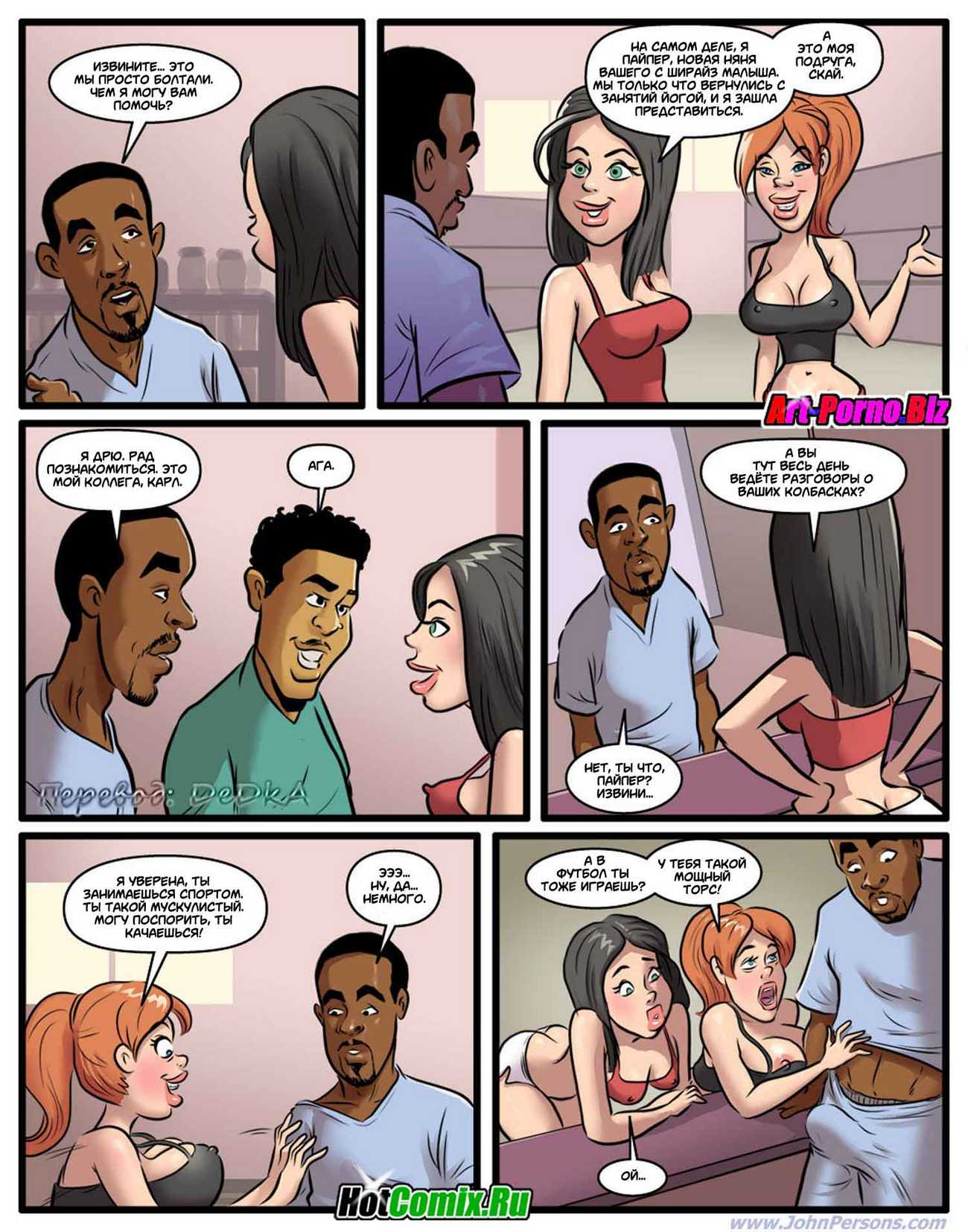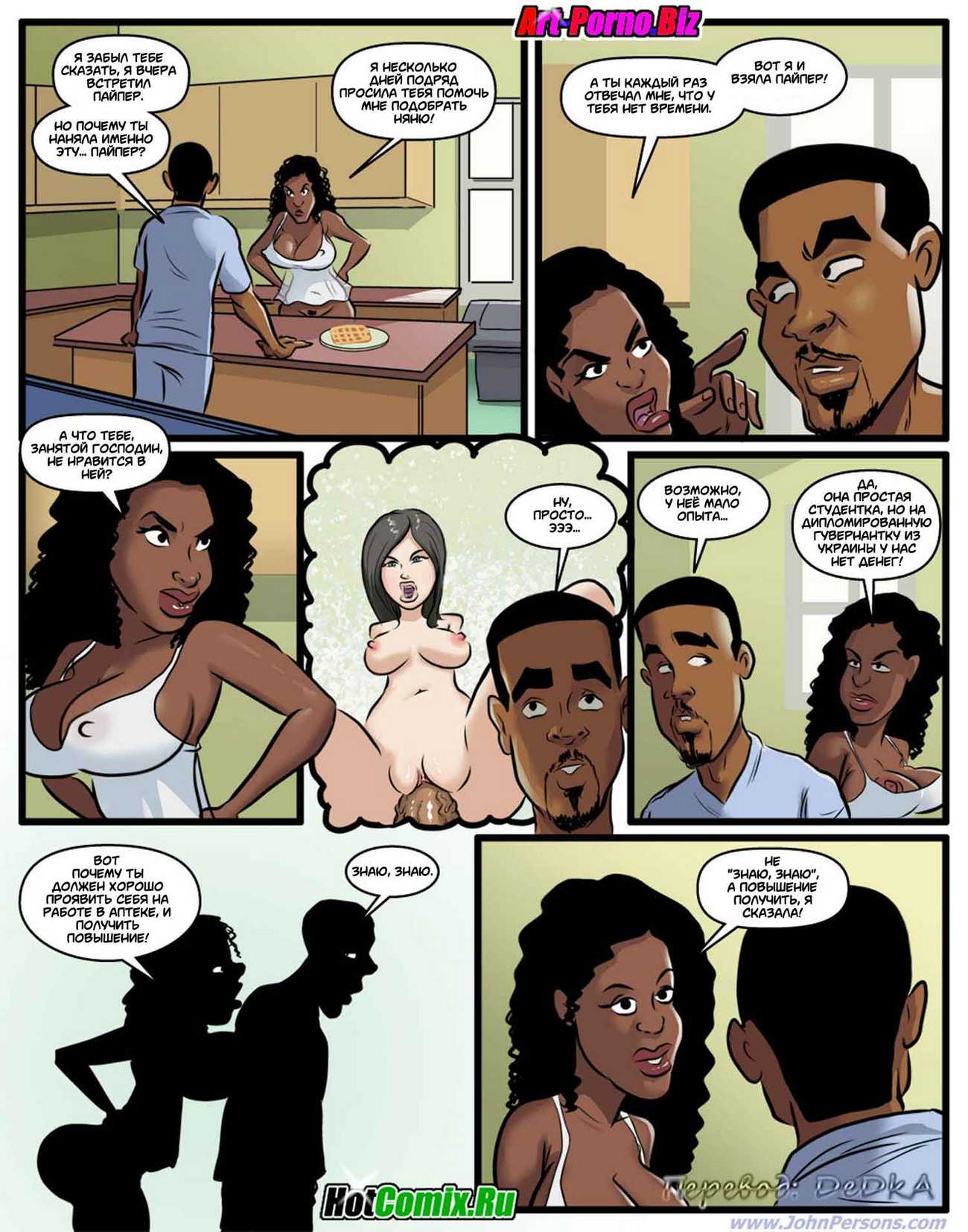 Порно комикс «Похотливая няня». Молодая чернокожая семейная пара, решили нанять няньку для того, чтобы она сидела с их у них дома. Посмотрев объявления они выбрали сексуальную блондиночка на эту роль, после собеседования она им понравилось и они её взяли. Поскольку муж возвращается с работы раньше чем жена, когда он пришёл домой, увидел новую няньку в обтягивающей в спортивной одежде. Она занималась фитнесом у них дома, от того что он увидел мужчина возбудился и захотел трахнуь эту белую цепочку, именно на это она и рассчитывала.