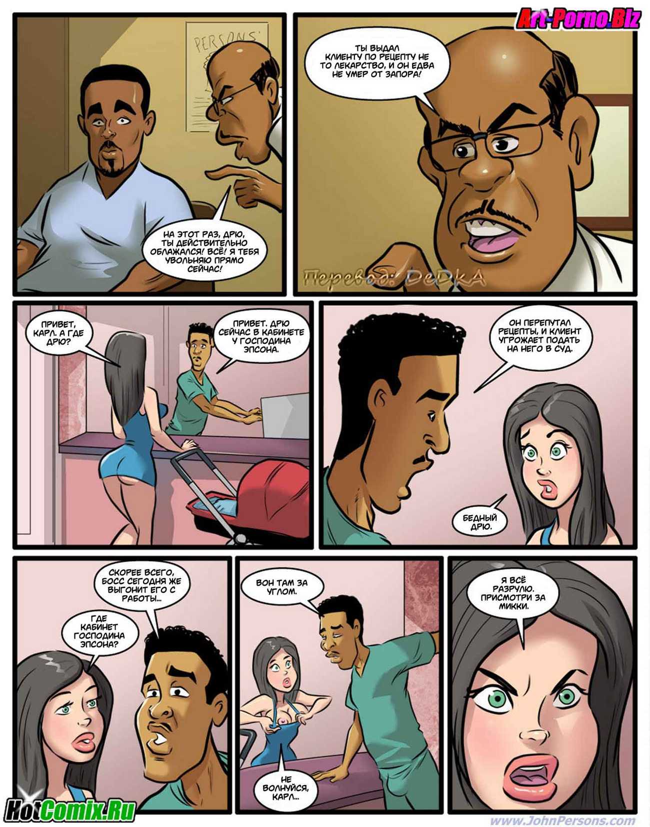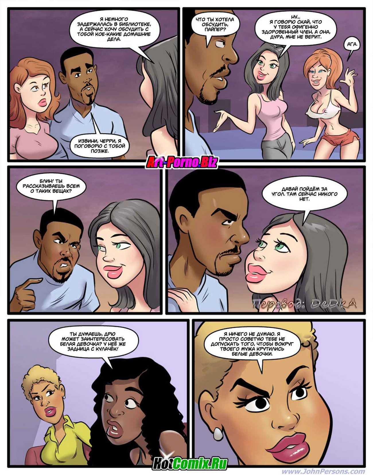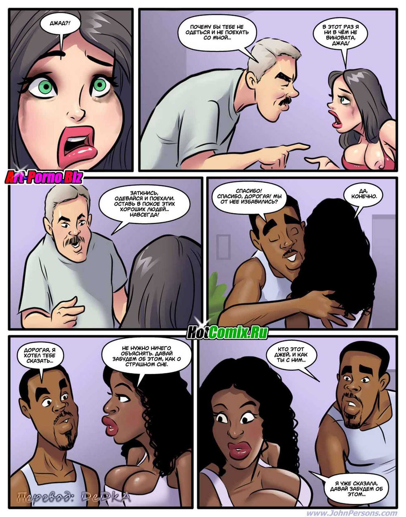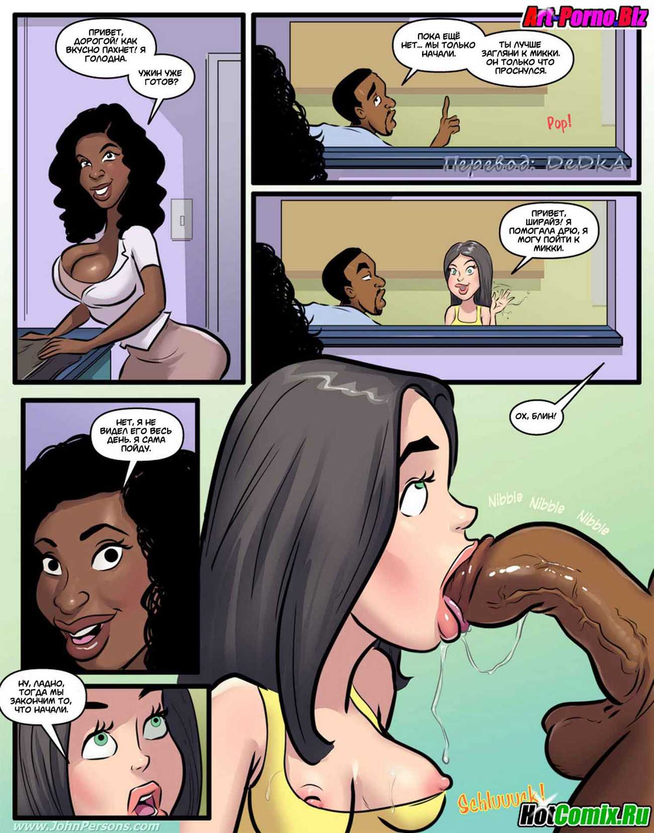 Порно комикс «Похотливая няня». Молодая чернокожая семейная пара, решили нанять няньку для того, чтобы она сидела с их у них дома. Посмотрев объявления они выбрали сексуальную блондиночка на эту роль, после собеседования она им понравилось и они её взяли. Поскольку муж возвращается с работы раньше чем жена, когда он пришёл домой, увидел новую няньку в обтягивающей в спортивной одежде. Она занималась фитнесом у них дома, от того что он увидел мужчина возбудился и захотел трахнуь эту белую цепочку, именно на это она и рассчитывала.