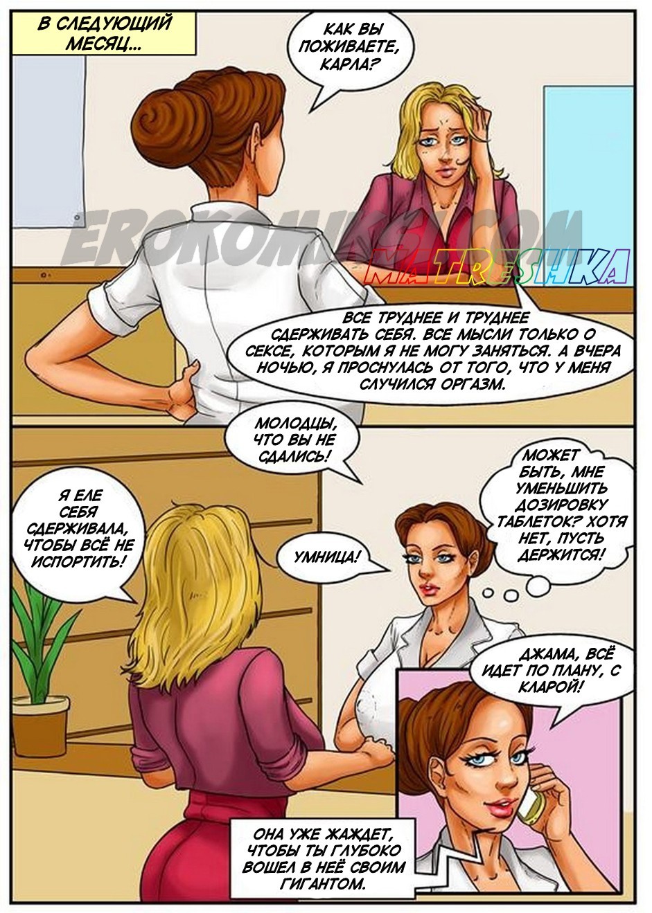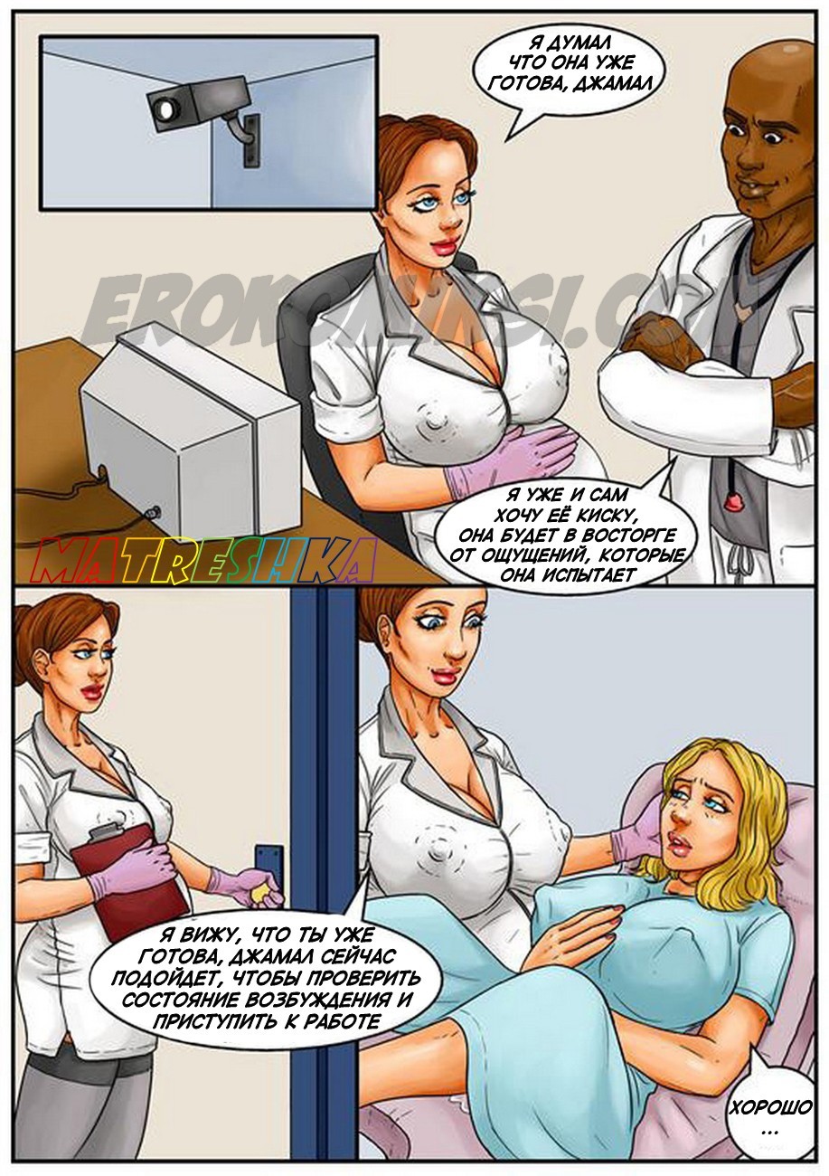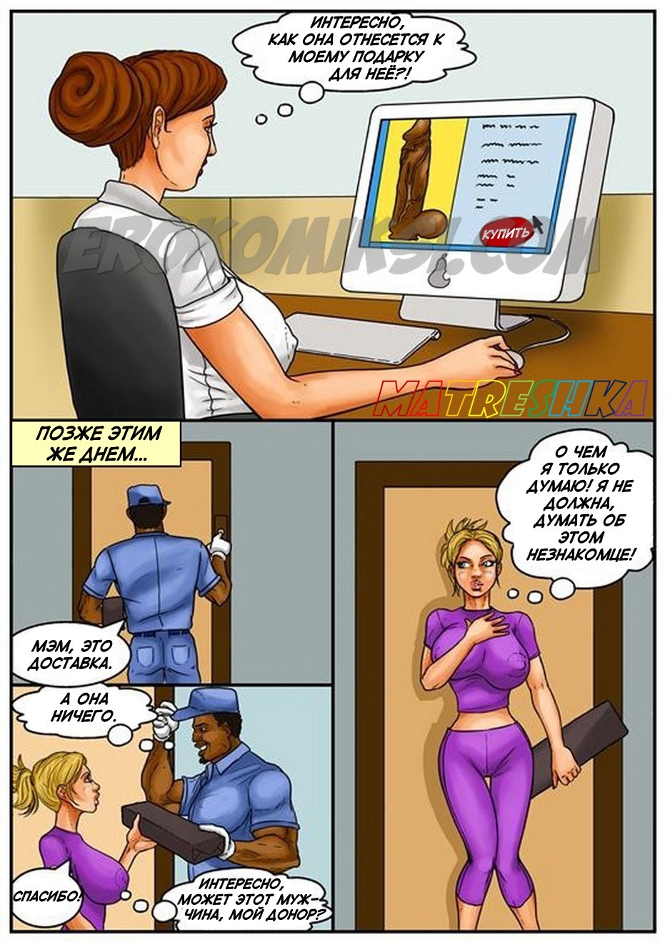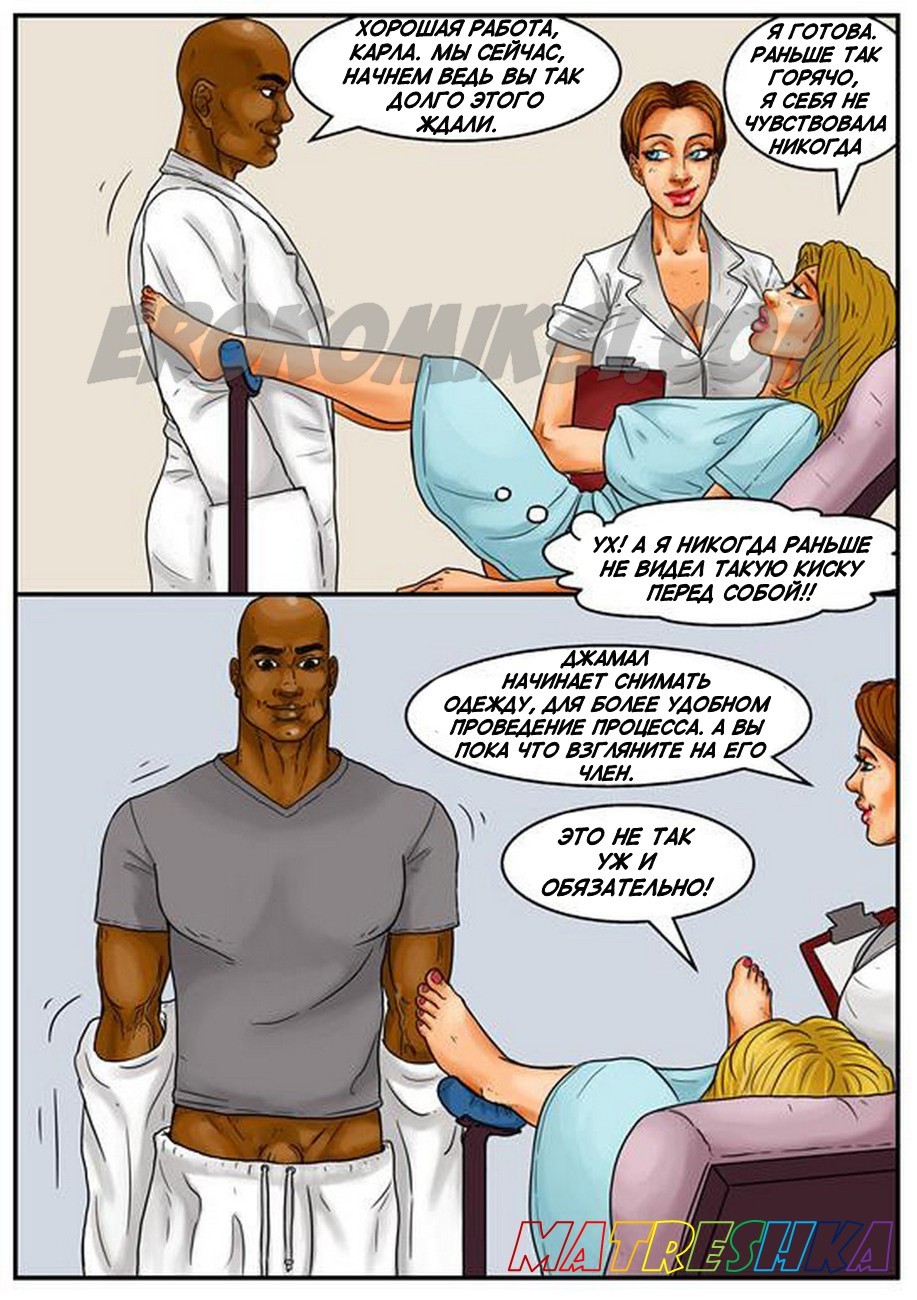 Порно комиксы на русском языке .Банк спермы. Часть 2. В продолжении этого легендарного комикса вы увидите молодого чернокожего парня, который в первой части был обычным пареньком, но теперь он разбогател на том, что сдавал сперму. И вот в банк спермы пришла сексуальная блондинка с большими сиськами и захотела воспользоваться услугами этого заведения. По правилам банка девушка может видеть донора, когда она увидела фотографии чернокожего гиганта, то очень сильно возбудилась, и её захотелось с ним потрахаться. У администратора выяснила адрес и номер телефона этого парня, созвонилась с ним и приехала к нему в гости, чтобы заняться сексом.