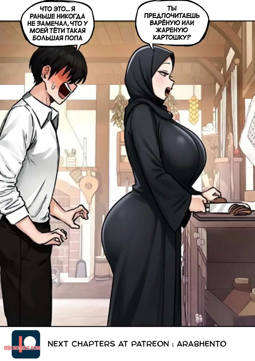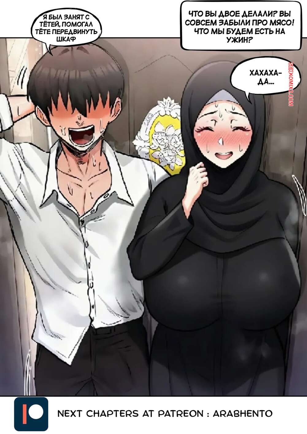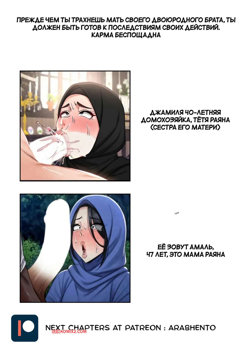 Порно комикс Роман с моей тетей в хиджабе. Часть 1. Affair with my hijab aunt. ArabHento. Парень пришел в гости к своей сексуальной тете и был поражен ее шикарным телом. Он поставил милфу на колени и дал ей отсосать свой твердый хуй, после чего хорошенько выебал ее пизденку.