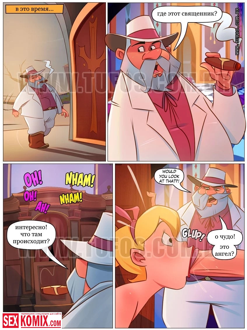 Порно комикс «Деревенская семейка. Часть 24. Исповедь». Сексуальная милфа пошла в церковь, чтобы исповедаться, так как её голову постоянно посещают пошлые мысли о измене своему мужу. Святой отец предложил ей рассказать о своих грехах, но как только она заговорила о своих развратных мыслях, женщина тут же потекла. Сама того не подозревая, начала раздеваться и гладить своё нежное тело. Священник увидел это через решетку и возбудился от горячего женского тела, он уже давно не видел такого. Отец просунул свой член через окошко и предложил отсосать его в искупление грехов. Глупая женщина с радостью отсосала ему, даже не подозревая, что парень её обманул.