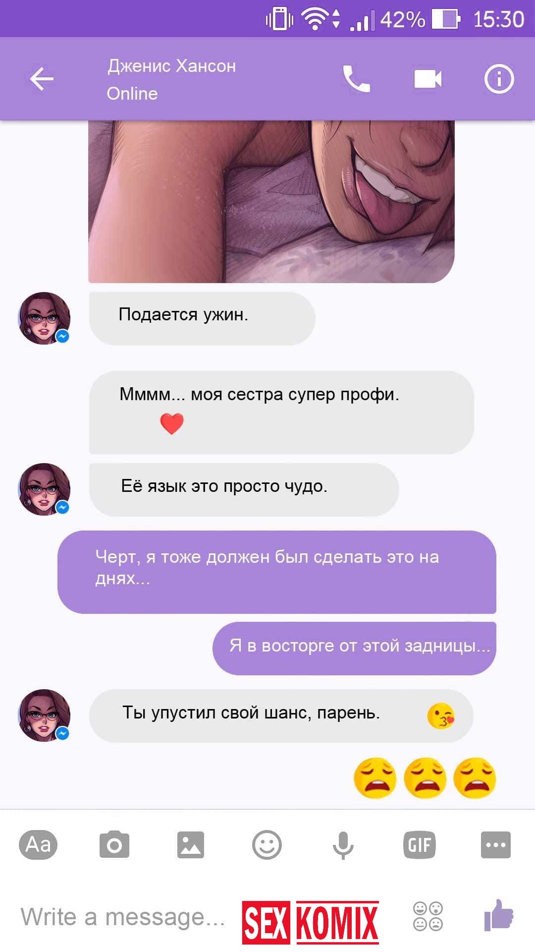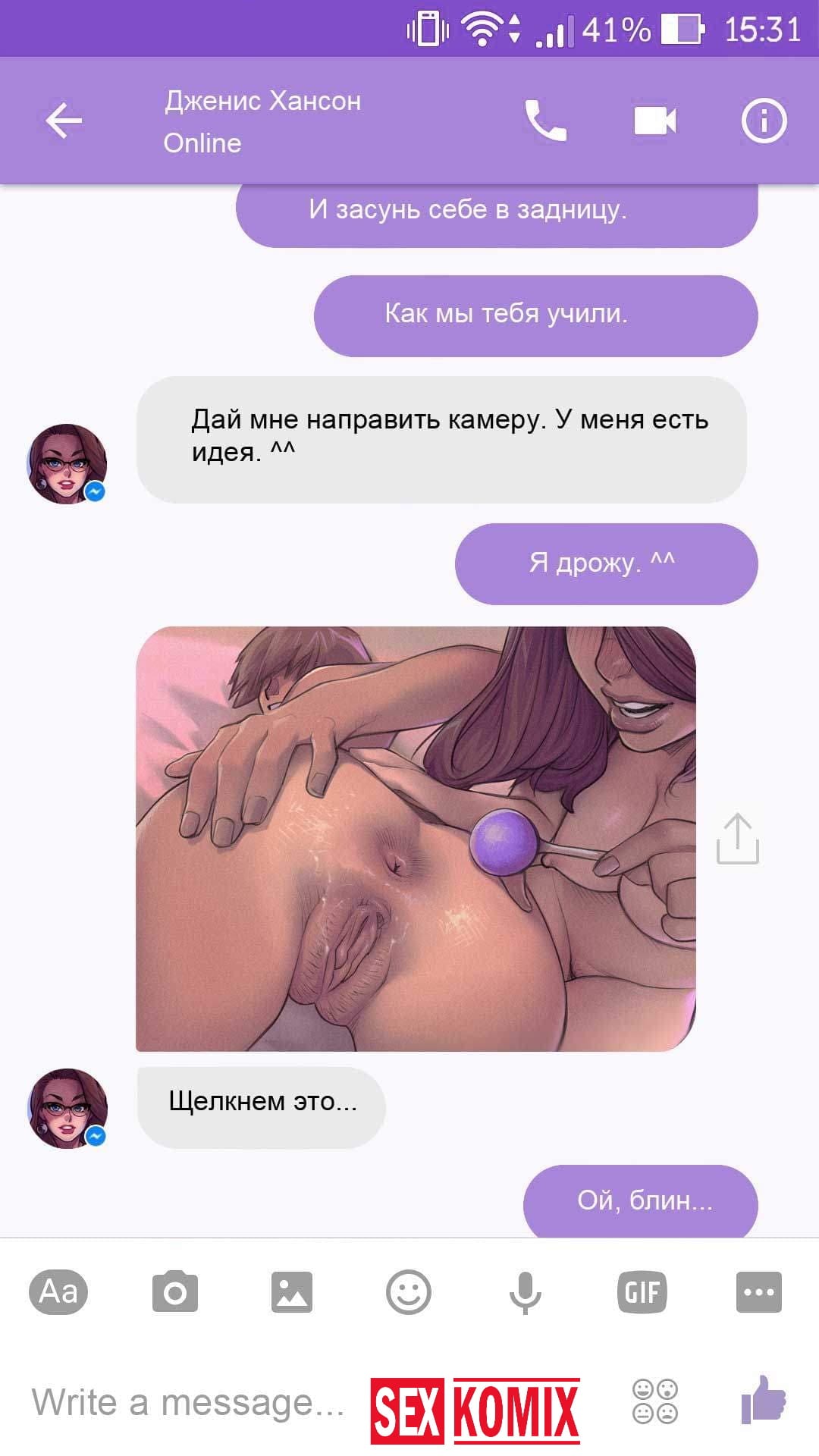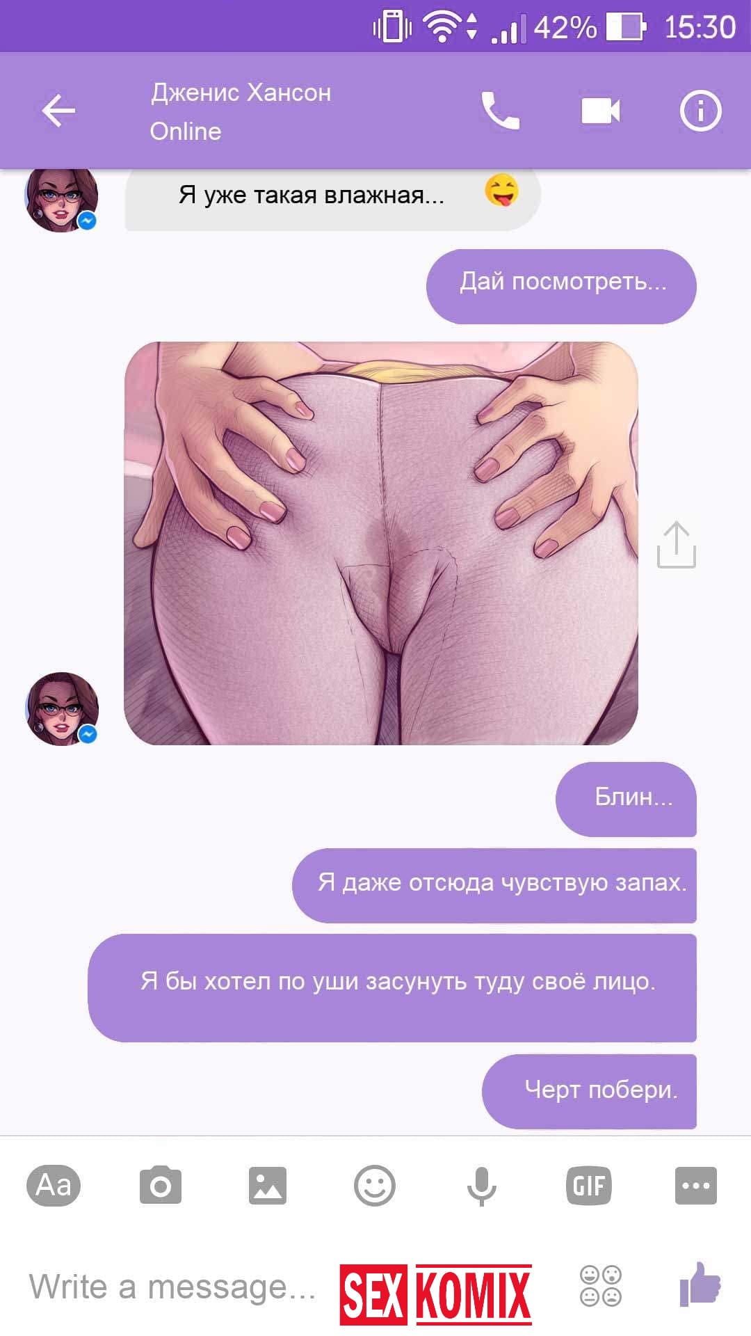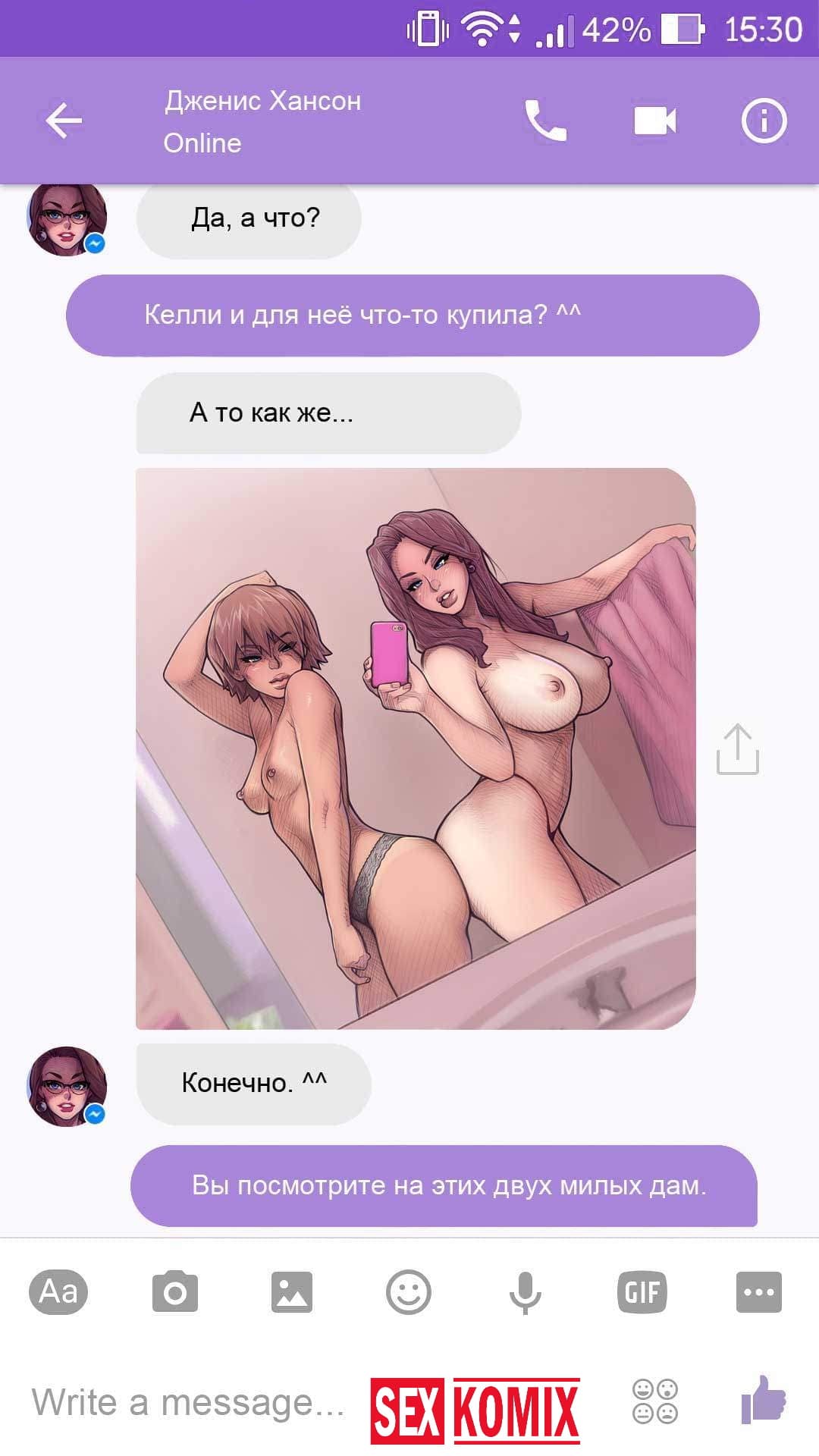 Порно комикс Чат с Дженис. После того как отец Филиппа отлично по развлекся с его женой Дженис и её сестрой, он отправился домой. Из дома переписывается по чату с женой, девушка жалуется на то, что её муж её достал и постоянно раздражает. Чтобы снять напряжение Она решила заняться сексом через чат по фотографиям, она отправляла мужчине свои обнаженные фото, и в самый разгар к ней присоединилась и её сестра. И фото стали ещё горячее, девушки начали разврат гладить друг другу и целовать нежные тела. Мужчина перевозбудился и кончил на их обнаженные фото.