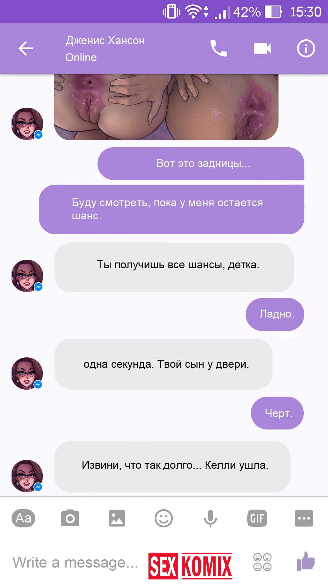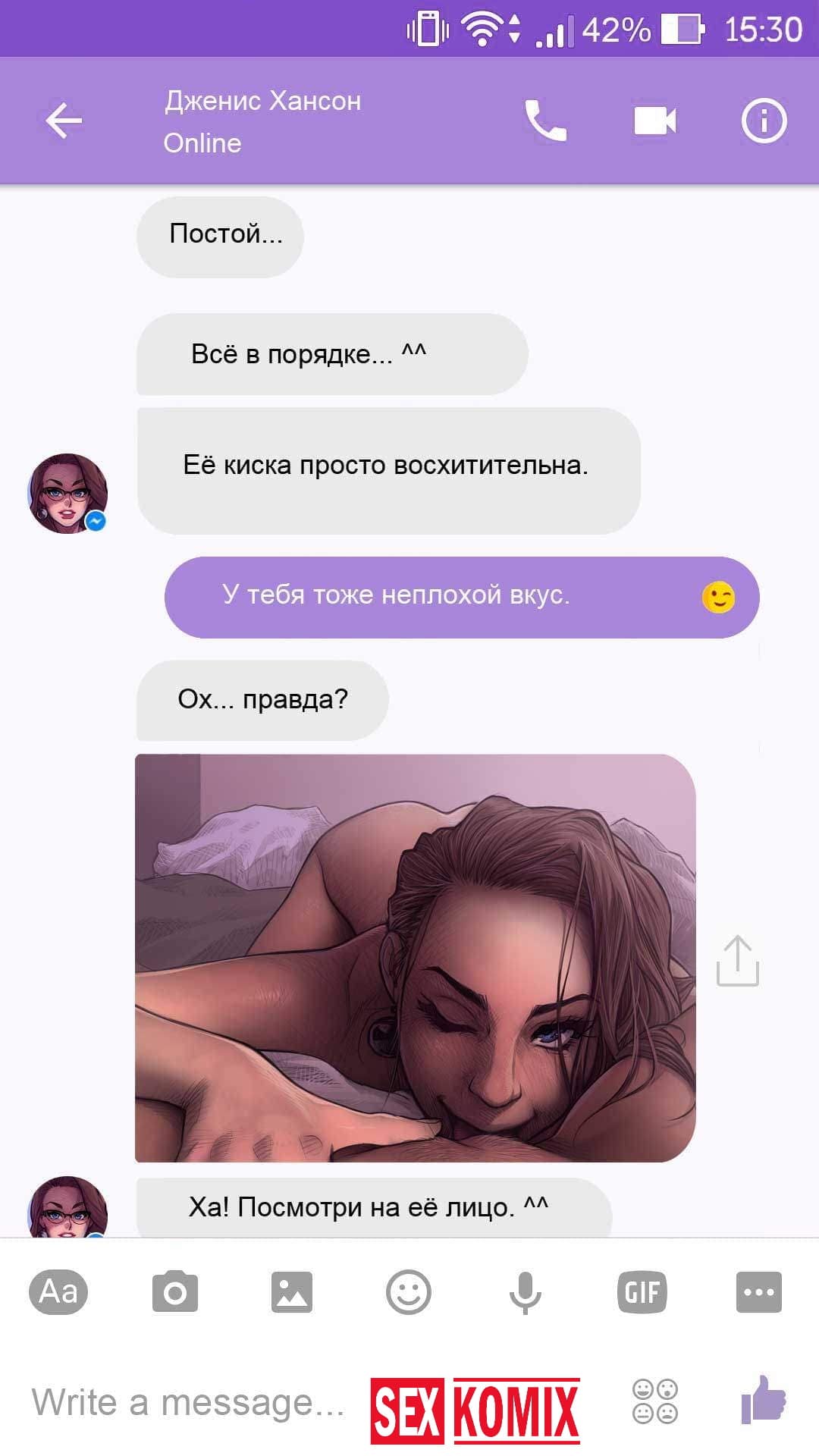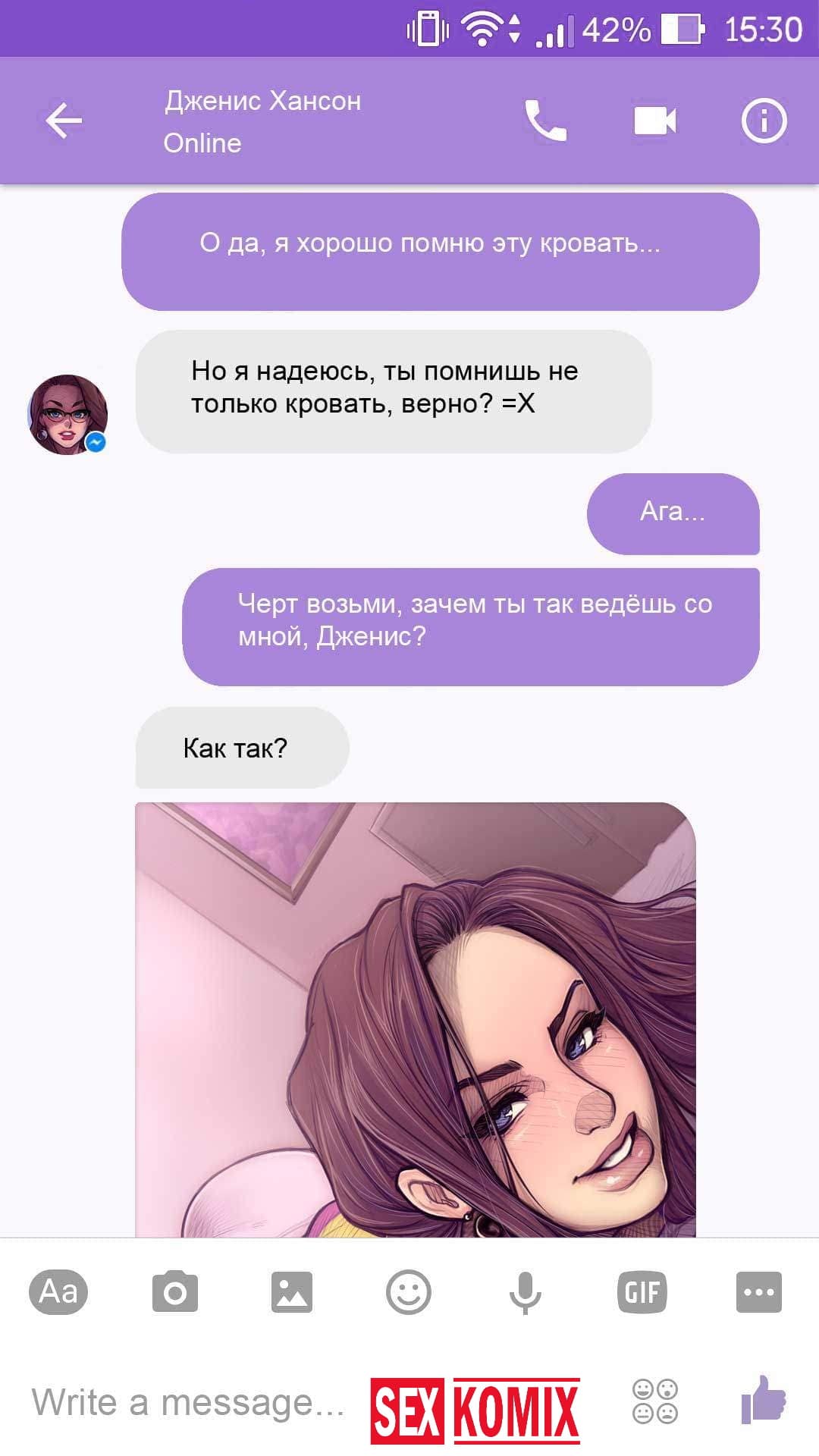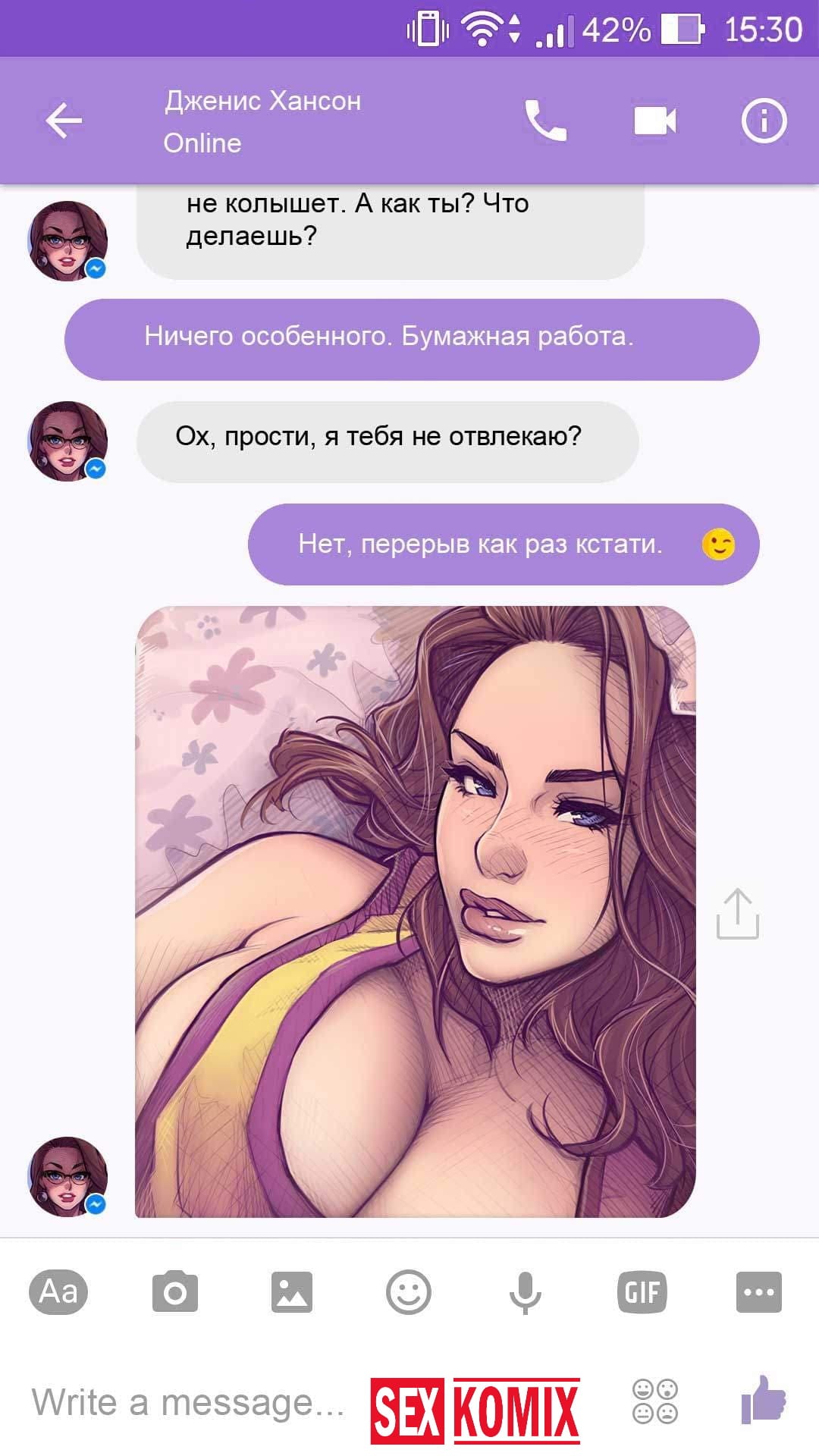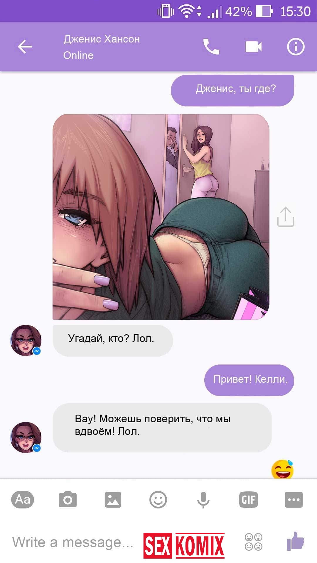 Порно комикс Чат с Дженис. После того как отец Филиппа отлично по развлекся с его женой Дженис и её сестрой, он отправился домой. Из дома переписывается по чату с женой, девушка жалуется на то, что её муж её достал и постоянно раздражает. Чтобы снять напряжение Она решила заняться сексом через чат по фотографиям, она отправляла мужчине свои обнаженные фото, и в самый разгар к ней присоединилась и её сестра. И фото стали ещё горячее, девушки начали разврат гладить друг другу и целовать нежные тела. Мужчина перевозбудился и кончил на их обнаженные фото.