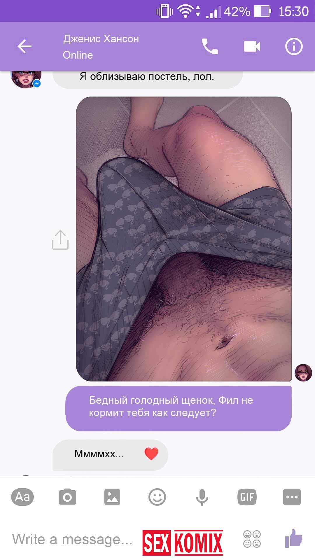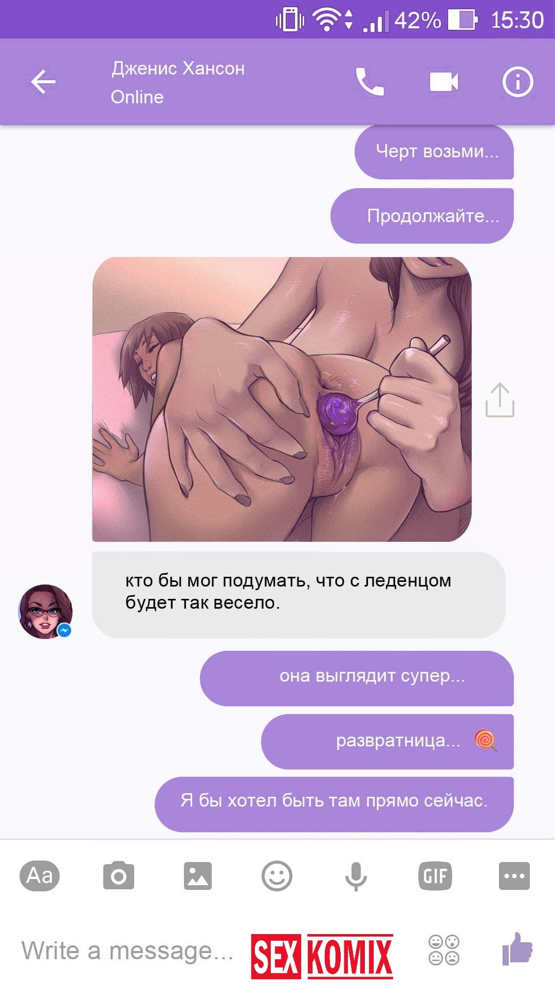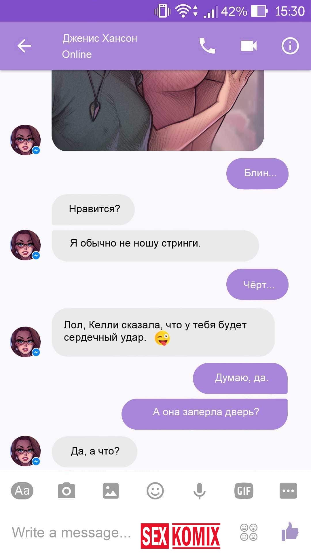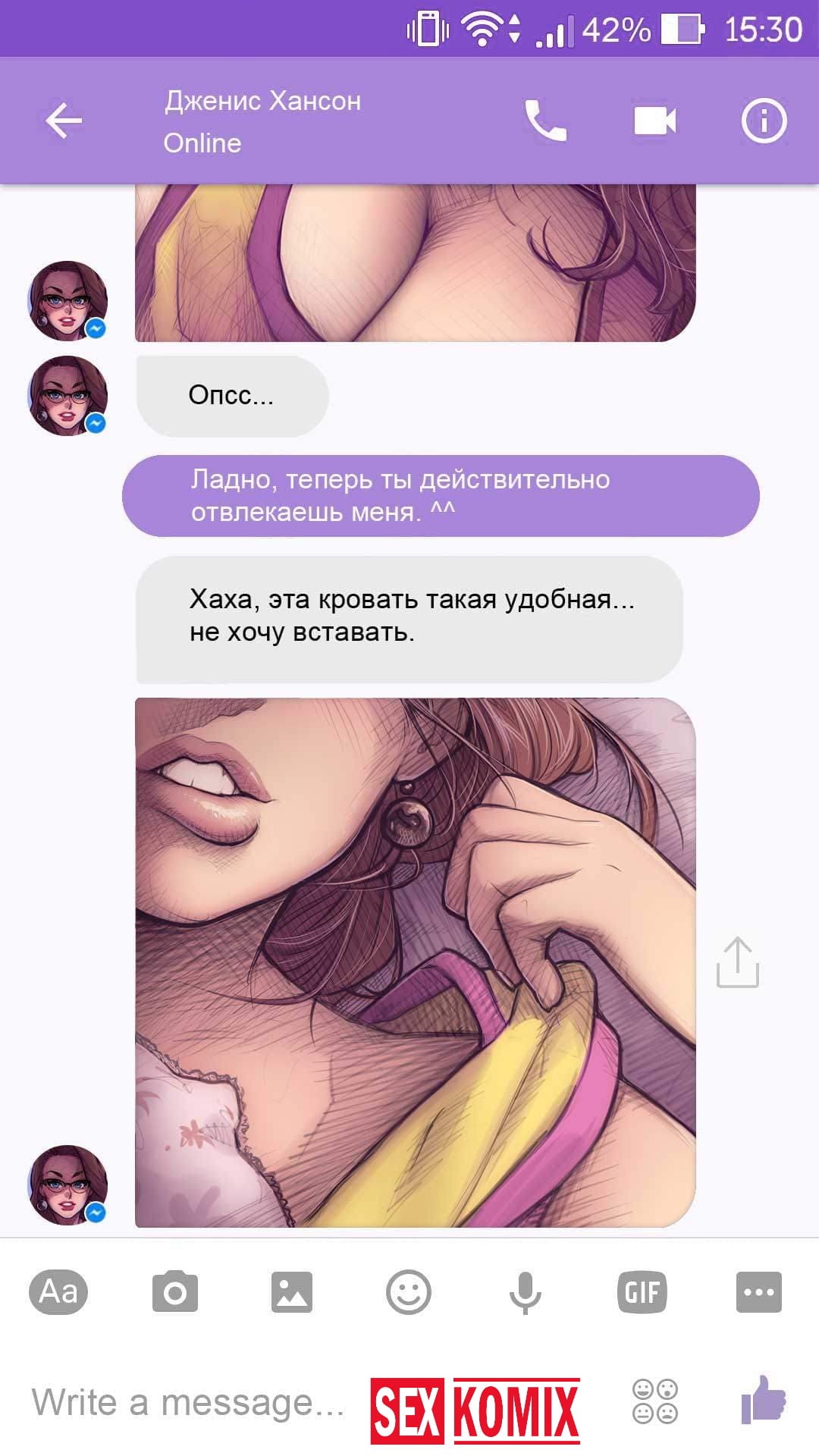 Порно комикс Чат с Дженис. После того как отец Филиппа отлично по развлекся с его женой Дженис и её сестрой, он отправился домой. Из дома переписывается по чату с женой, девушка жалуется на то, что её муж её достал и постоянно раздражает. Чтобы снять напряжение Она решила заняться сексом через чат по фотографиям, она отправляла мужчине свои обнаженные фото, и в самый разгар к ней присоединилась и её сестра. И фото стали ещё горячее, девушки начали разврат гладить друг другу и целовать нежные тела. Мужчина перевозбудился и кончил на их обнаженные фото.