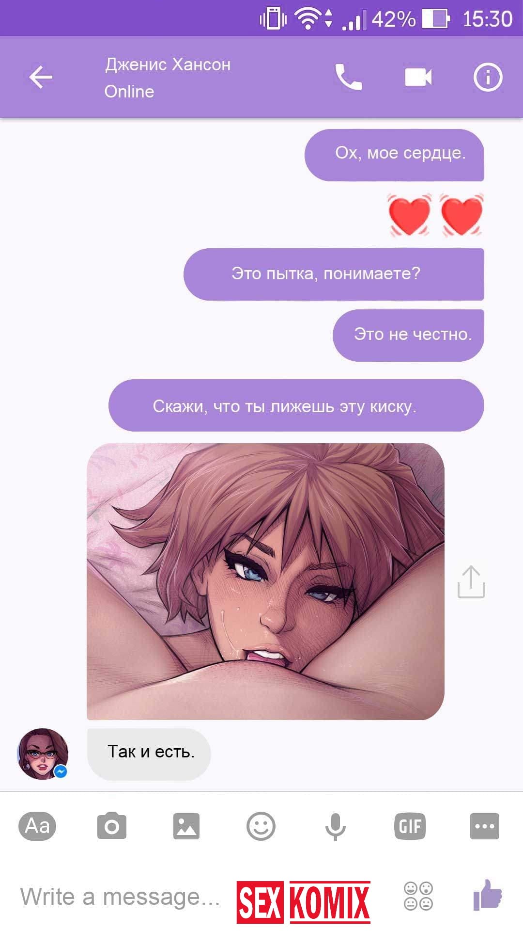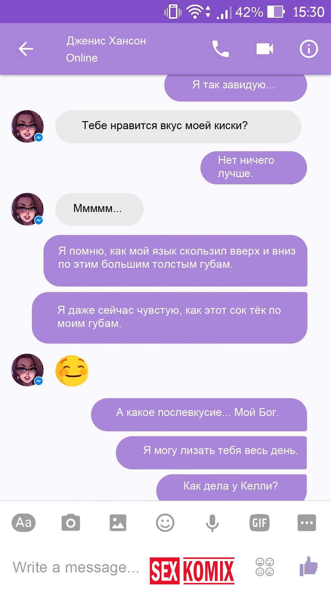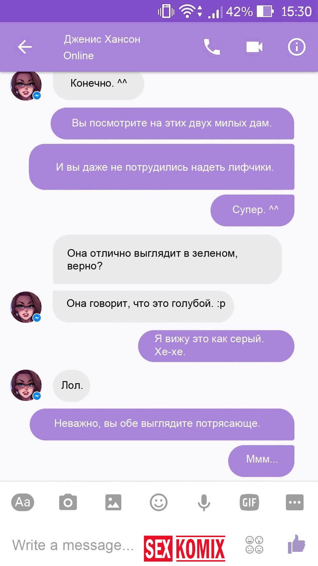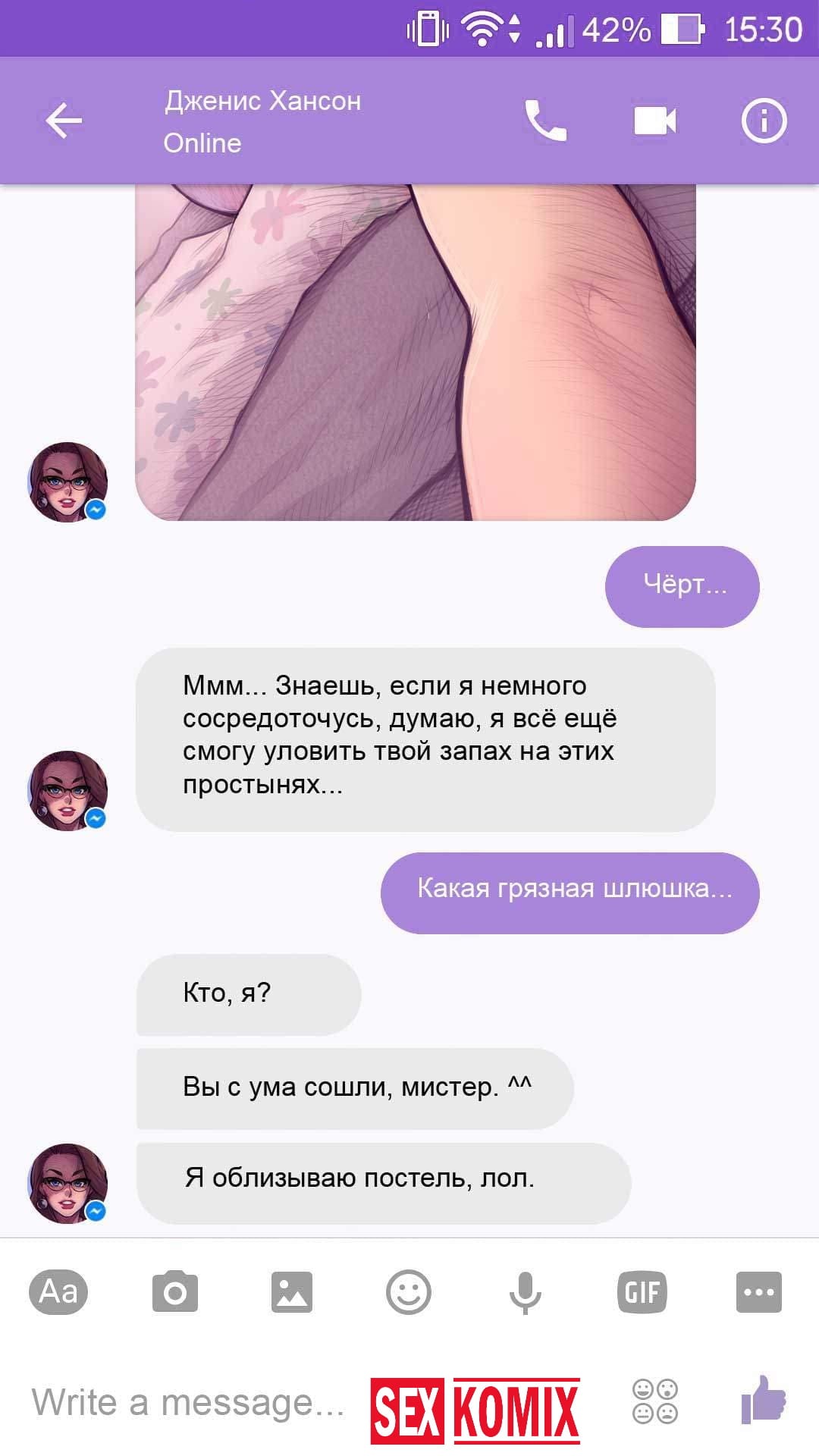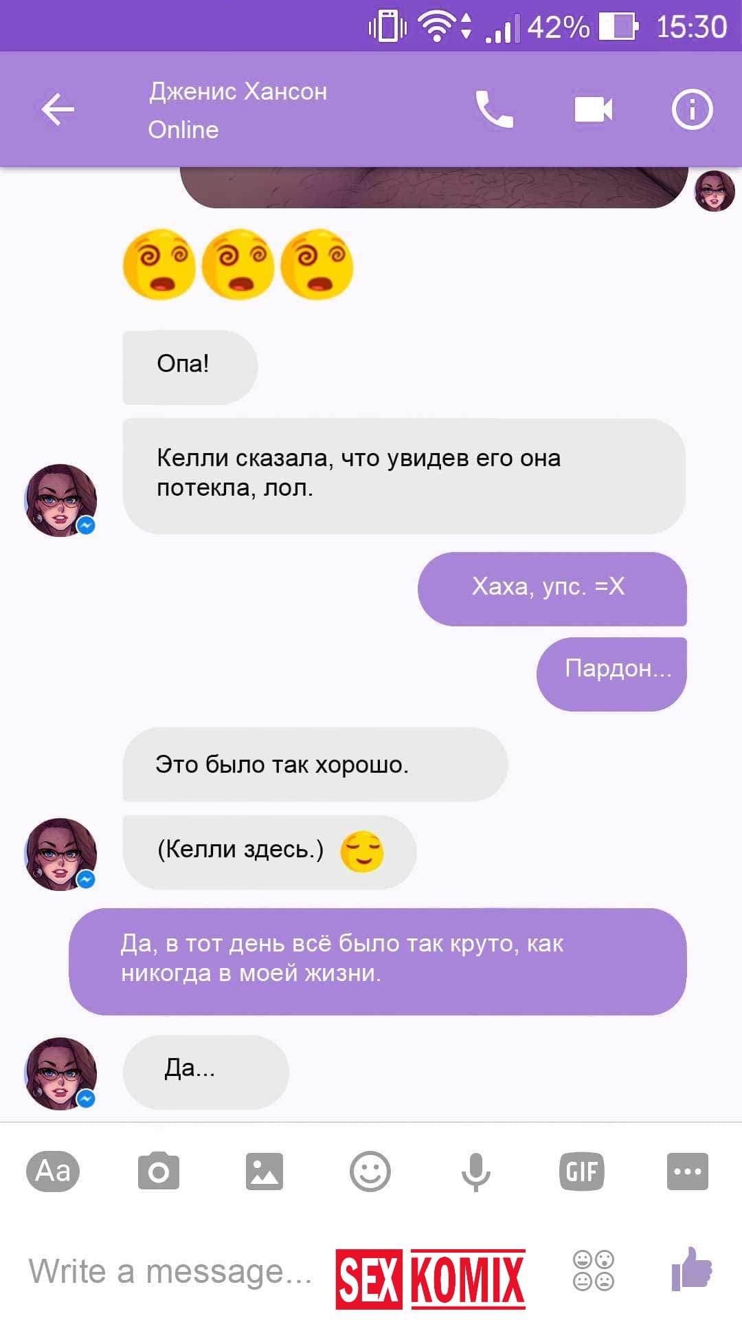 Порно комикс Чат с Дженис. После того как отец Филиппа отлично по развлекся с его женой Дженис и её сестрой, он отправился домой. Из дома переписывается по чату с женой, девушка жалуется на то, что её муж её достал и постоянно раздражает. Чтобы снять напряжение Она решила заняться сексом через чат по фотографиям, она отправляла мужчине свои обнаженные фото, и в самый разгар к ней присоединилась и её сестра. И фото стали ещё горячее, девушки начали разврат гладить друг другу и целовать нежные тела. Мужчина перевозбудился и кончил на их обнаженные фото.