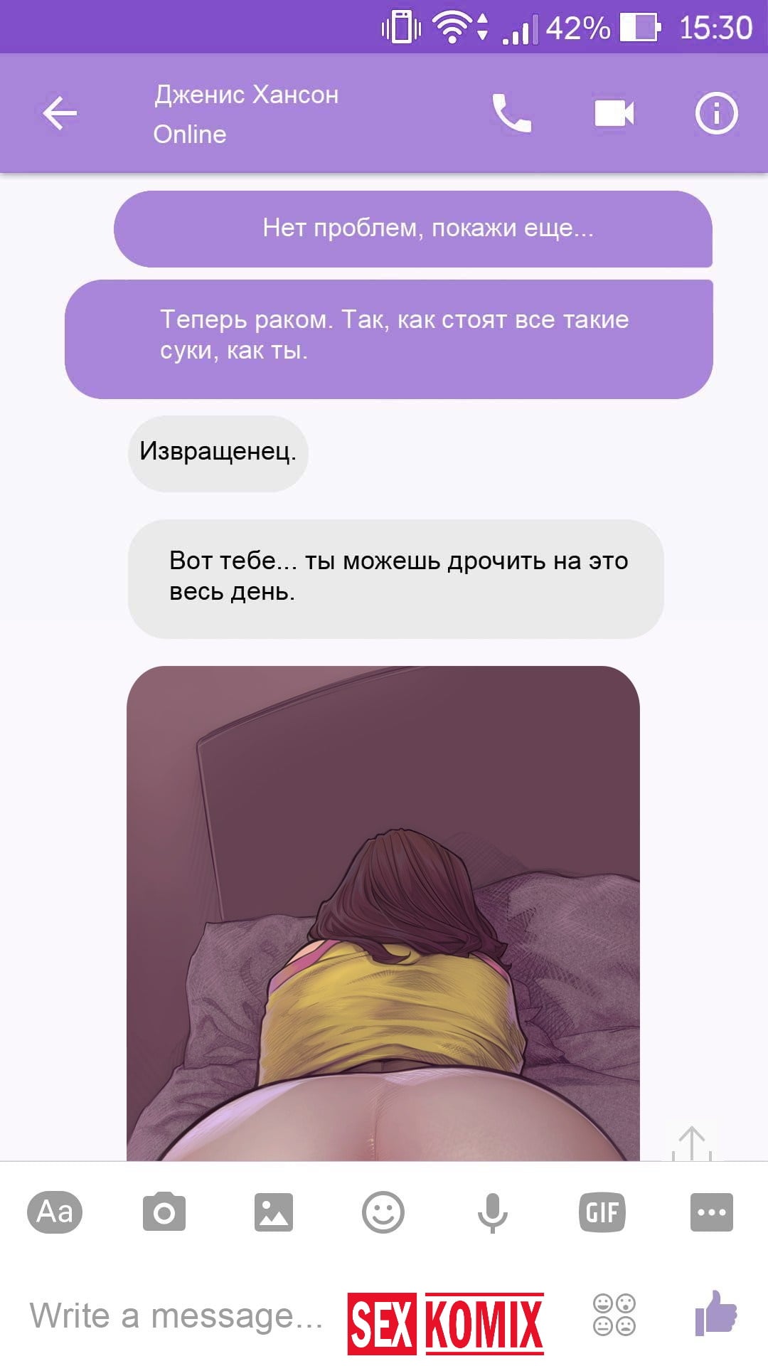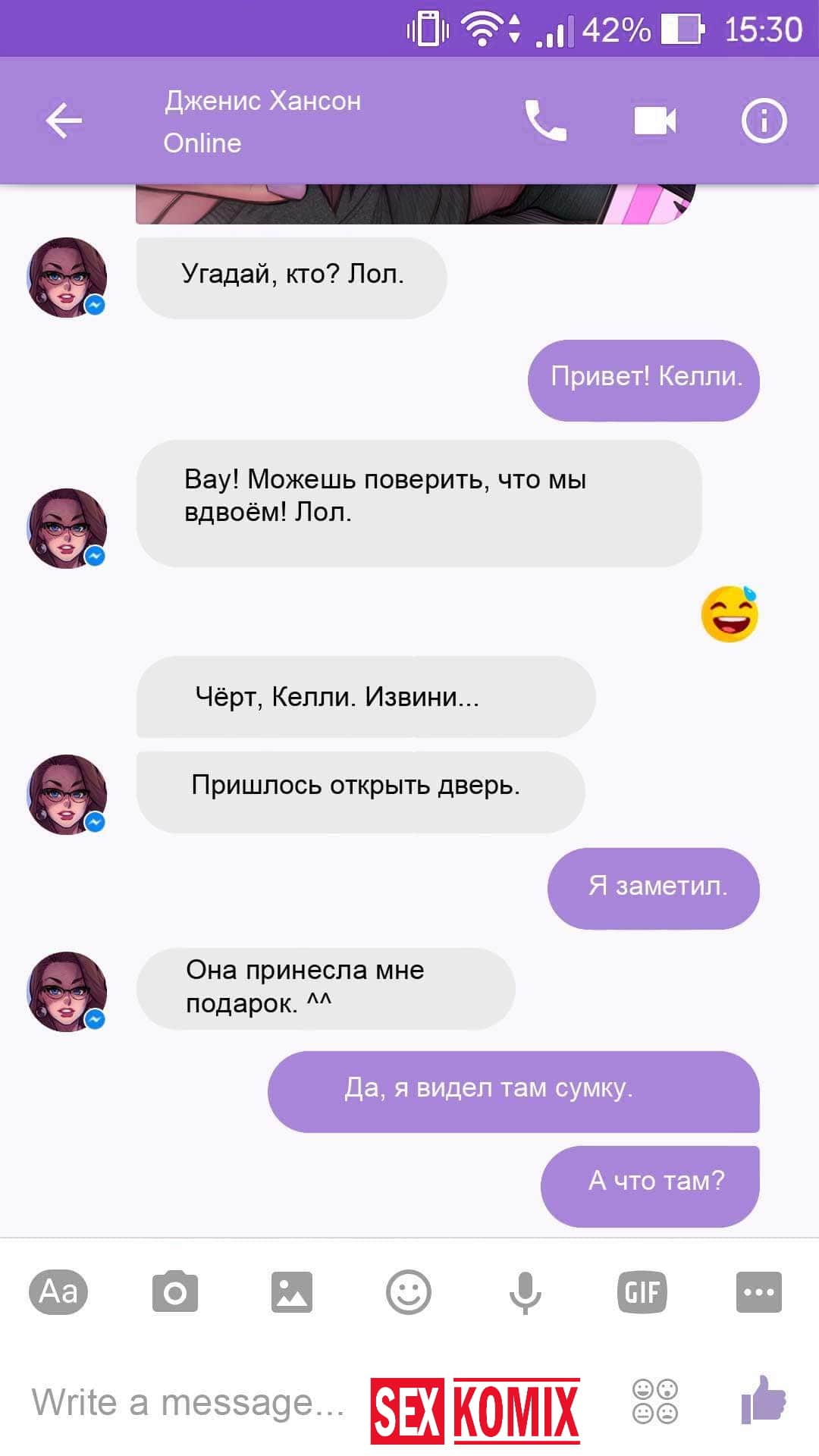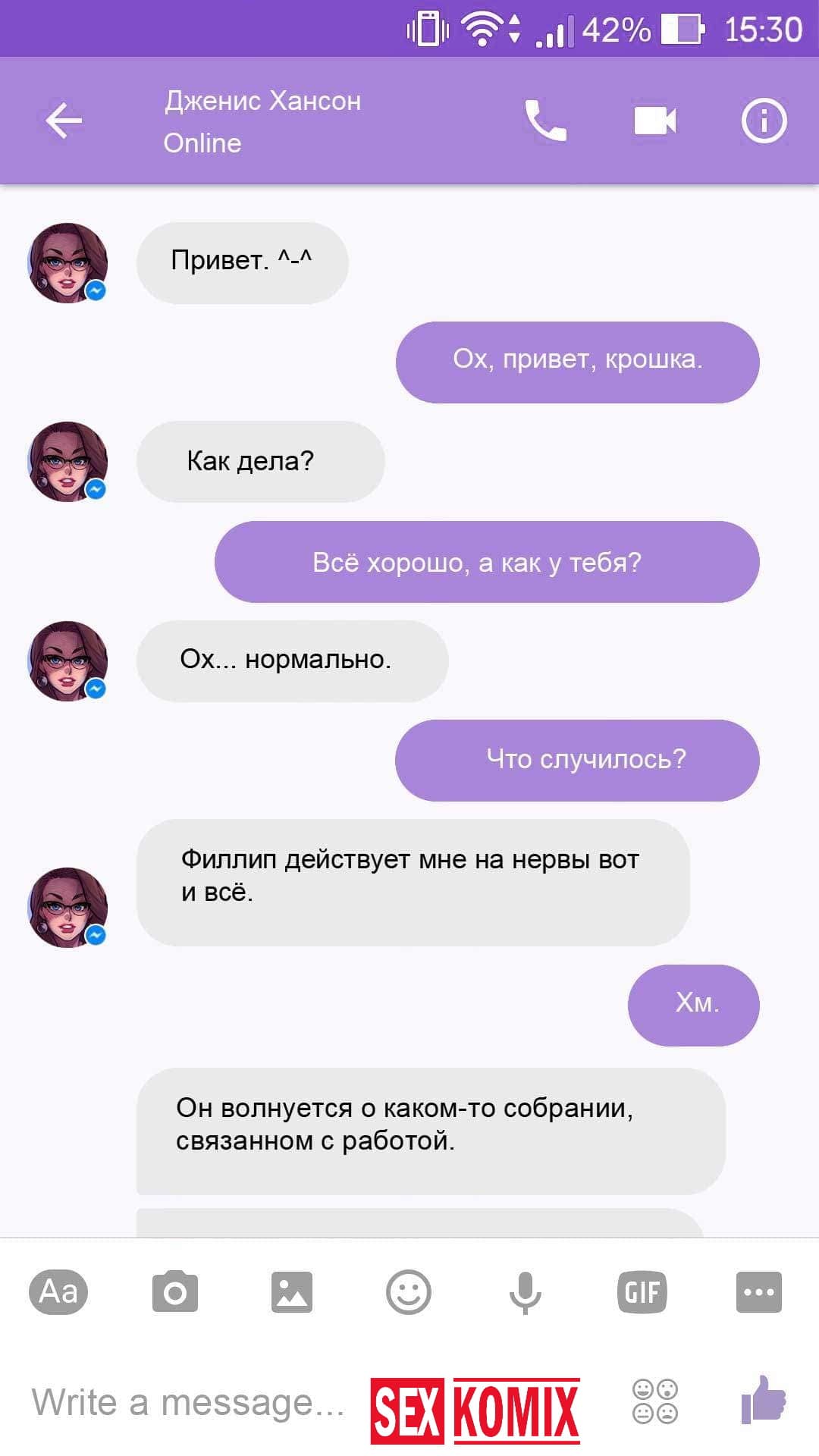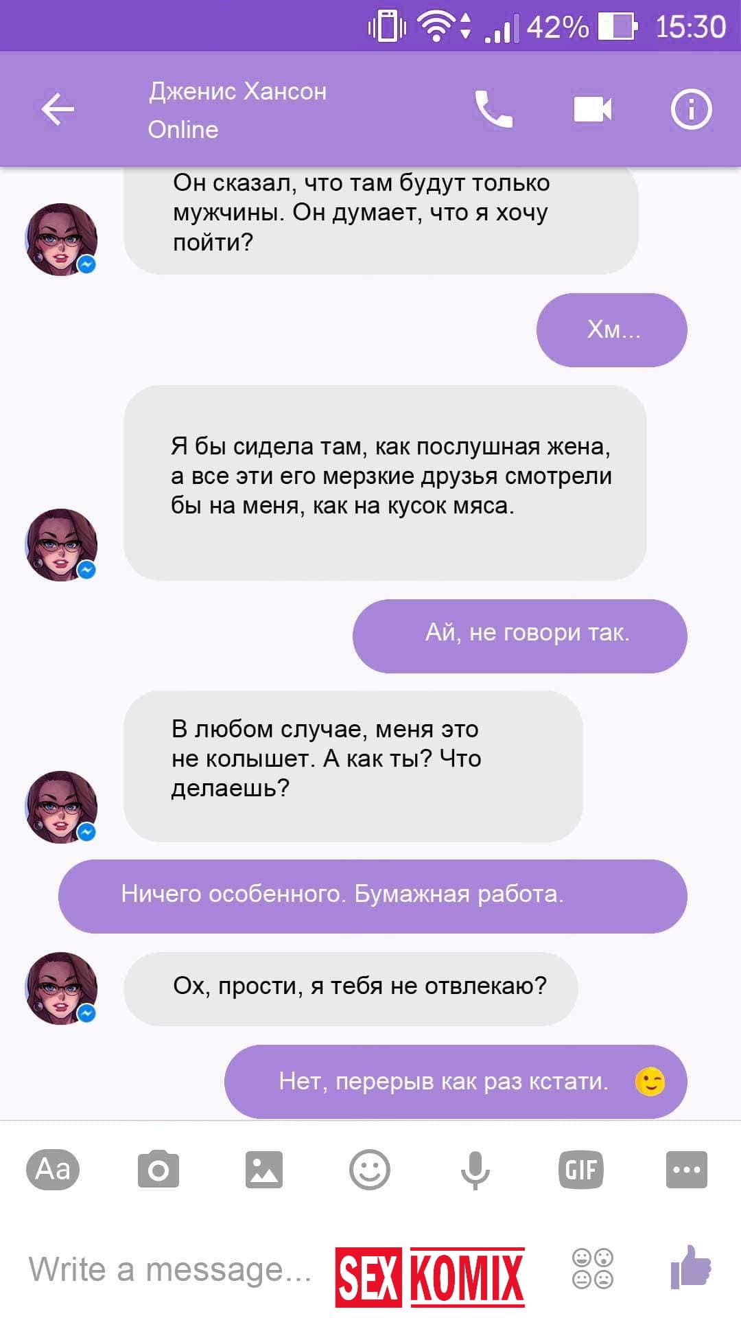 Порно комикс Чат с Дженис. После того как отец Филиппа отлично по развлекся с его женой Дженис и её сестрой, он отправился домой. Из дома переписывается по чату с женой, девушка жалуется на то, что её муж её достал и постоянно раздражает. Чтобы снять напряжение Она решила заняться сексом через чат по фотографиям, она отправляла мужчине свои обнаженные фото, и в самый разгар к ней присоединилась и её сестра. И фото стали ещё горячее, девушки начали разврат гладить друг другу и целовать нежные тела. Мужчина перевозбудился и кончил на их обнаженные фото.
