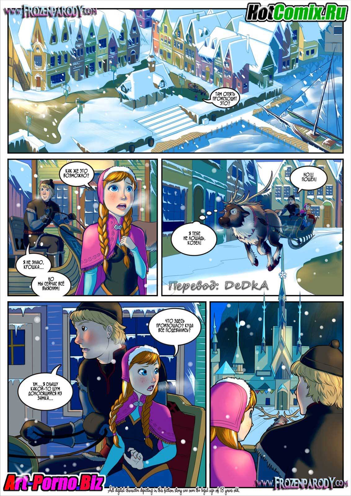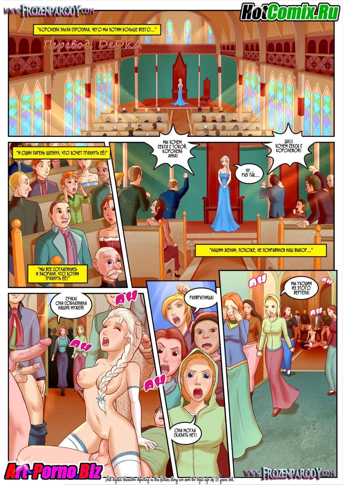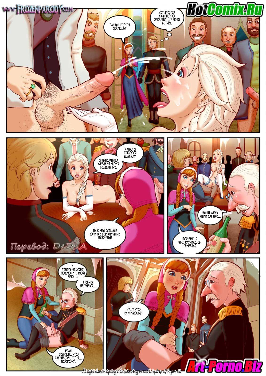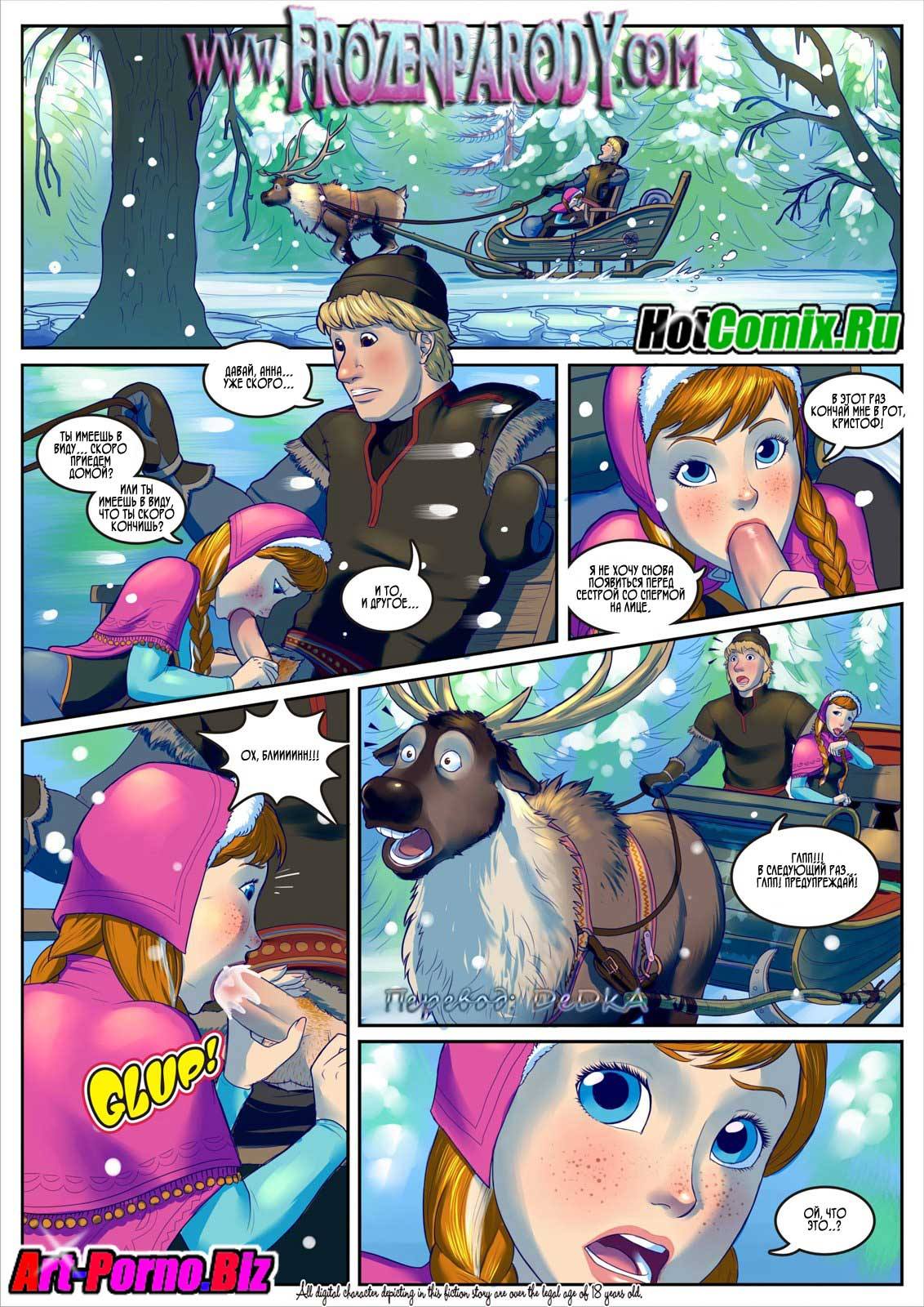 Порно комиксы Холодное сердце Часть 1. Парень извозчик согласился довезти молодую девушку до города, так как она вся промерзла в лесу совсем одна. Но по дороге он попросил сделать ему миньет, что бы согреться в пути. Когда девушка прибыла в город, она пошла во дворец и увидела оргию с участием принцессы. Но и молодая красотка не растерялась, она присоединилась к людям в тронном зале и занялась сексом с двумя не знакомыми парнями. А уже позже добралась до принцессы и она начали целоваться. Девушка занялись отличным лесбийским сексом.