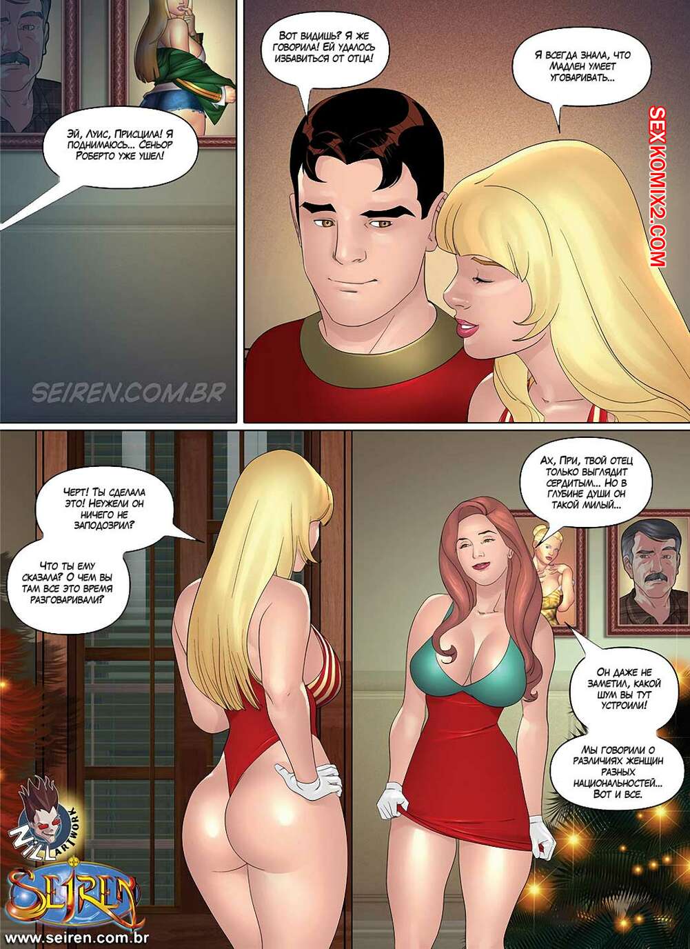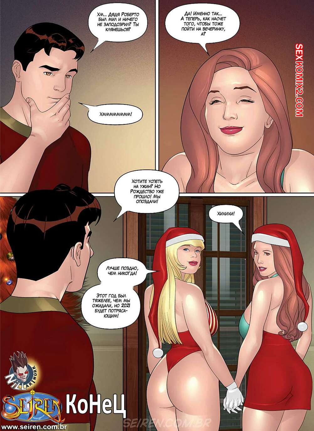Порно комикс Горячая кузина. Часть 26 Две красотки решили сделать парнишке сюрприз. Они позвали его к себе и встретили его в рождественских костюмчиках, красотки начали сосать у парня его большой хуй, после чего предложили хорошенько их выебать.