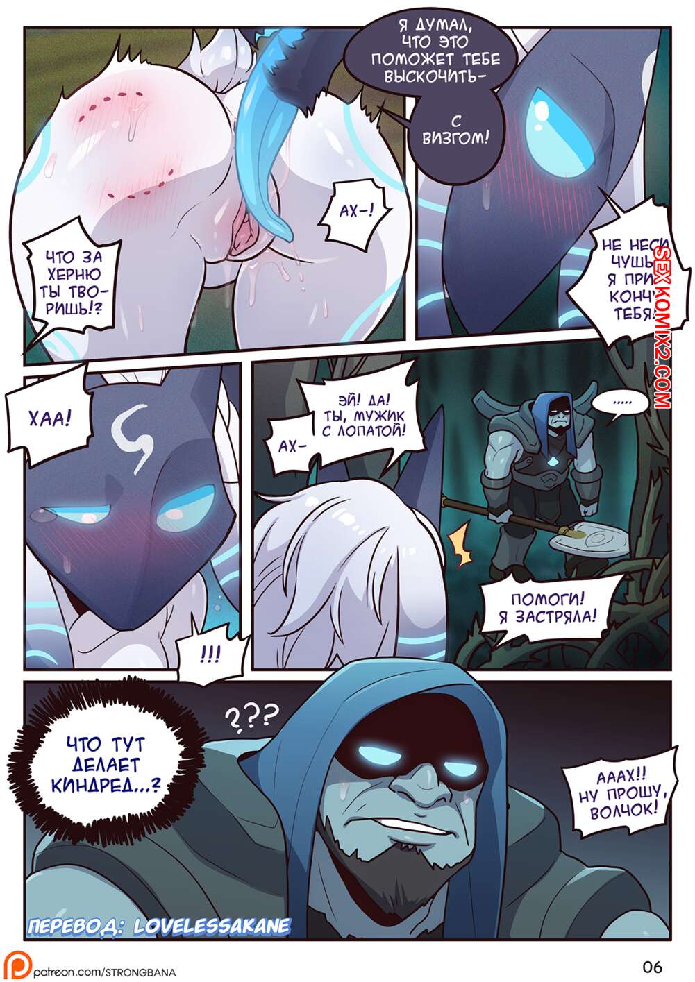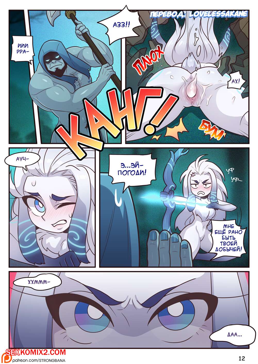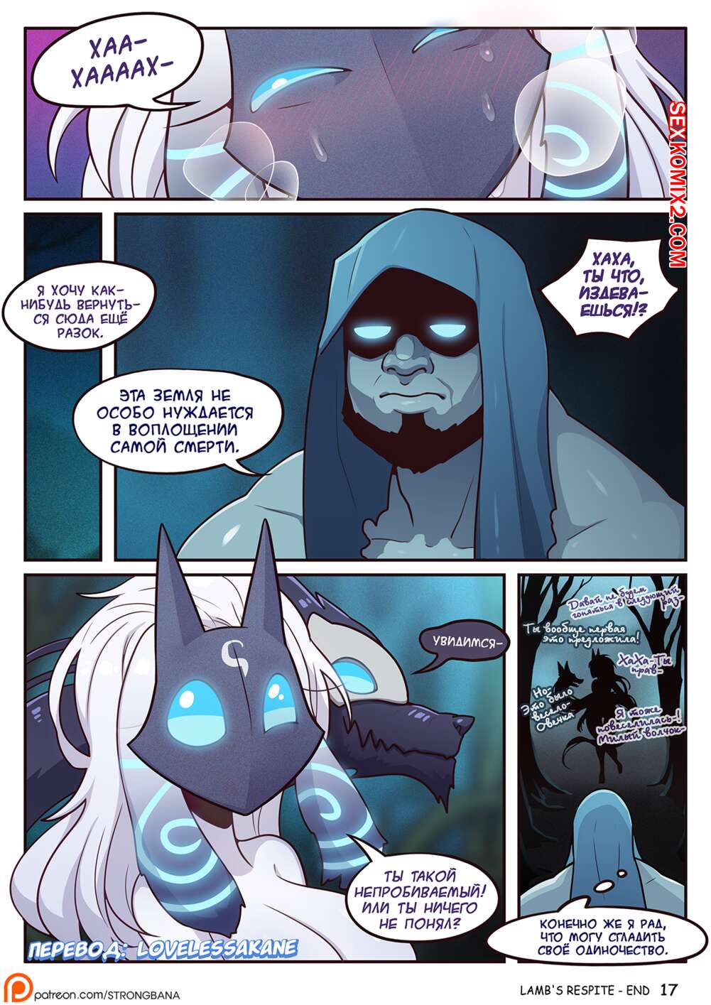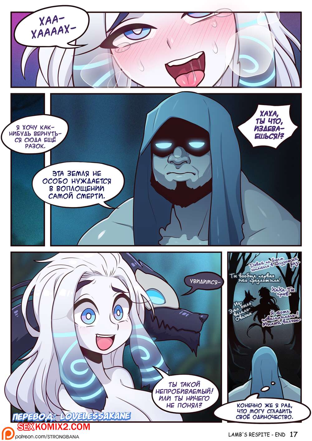 Порно комикс Милость Овечки. Lambs Respite. Strong Bana Существо в темном лесу ночью напало на обнаженную красавицу. Он стал лизать ее пизду своим большим гибким язычком, а потом раком загнул красотку и хорошо трахнул, кончив ей в пизду.