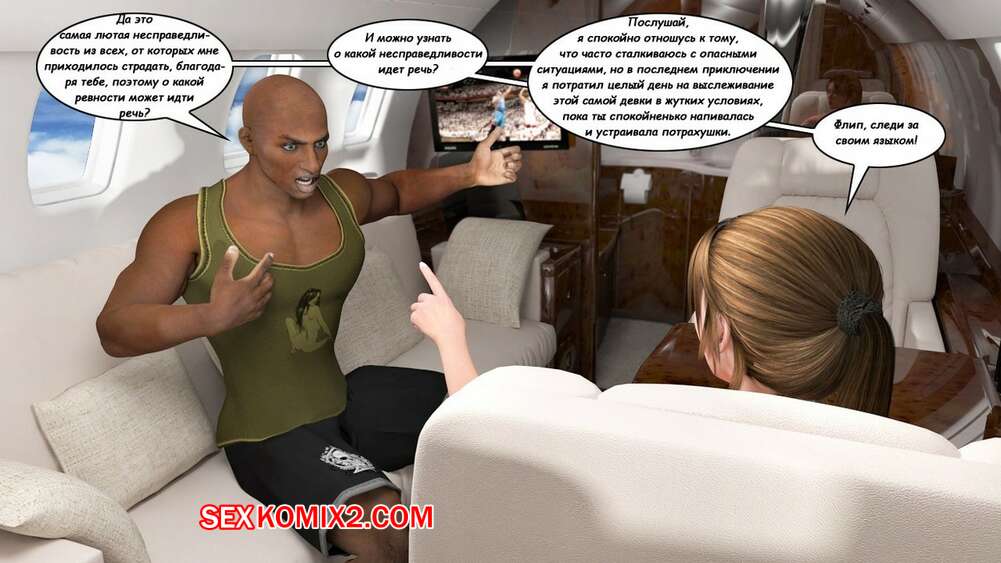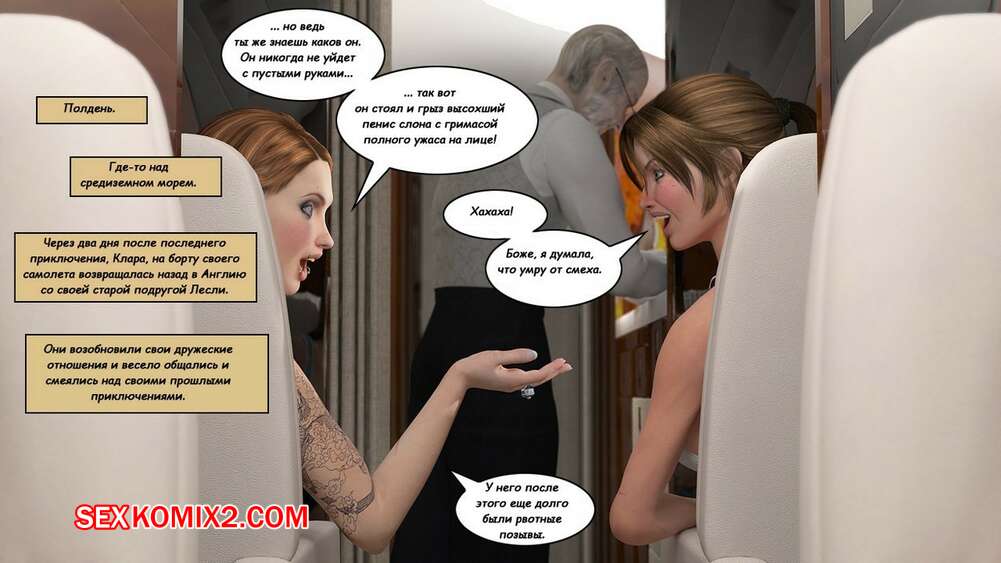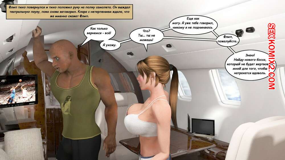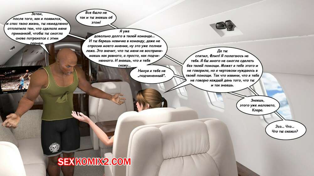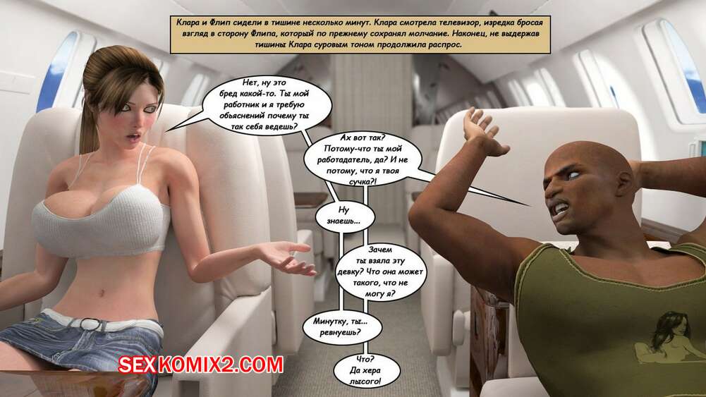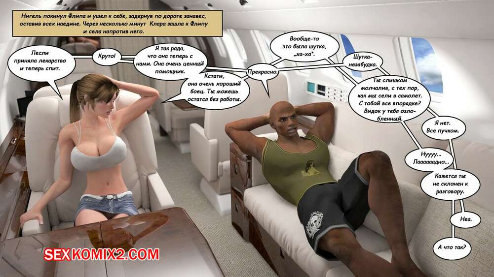 Порно комикс Клара Рэвенс. Часть 3. Путь домой По дороге назад с приключение, нашей красотке героине и ее черному дружку приспичило потрахаться прямо в самолете. Они дождались, когда рядом никого не будет и тогда черный парень поставил сучку на колени и достал ей свой хуй.