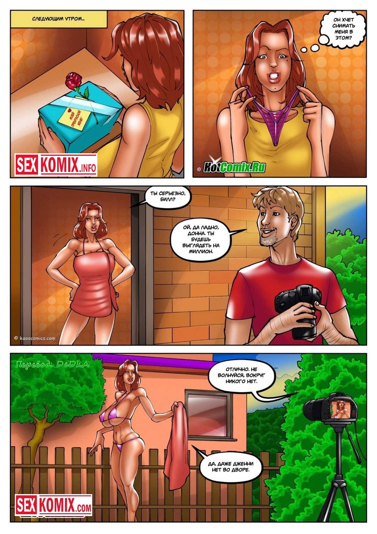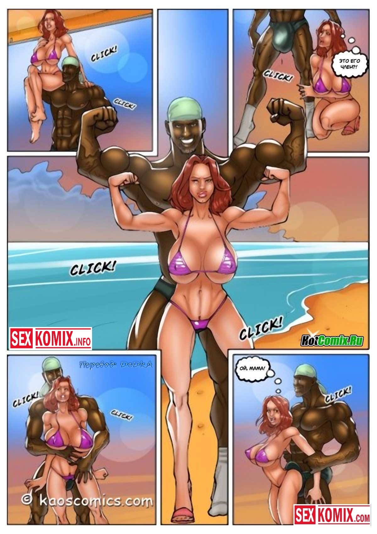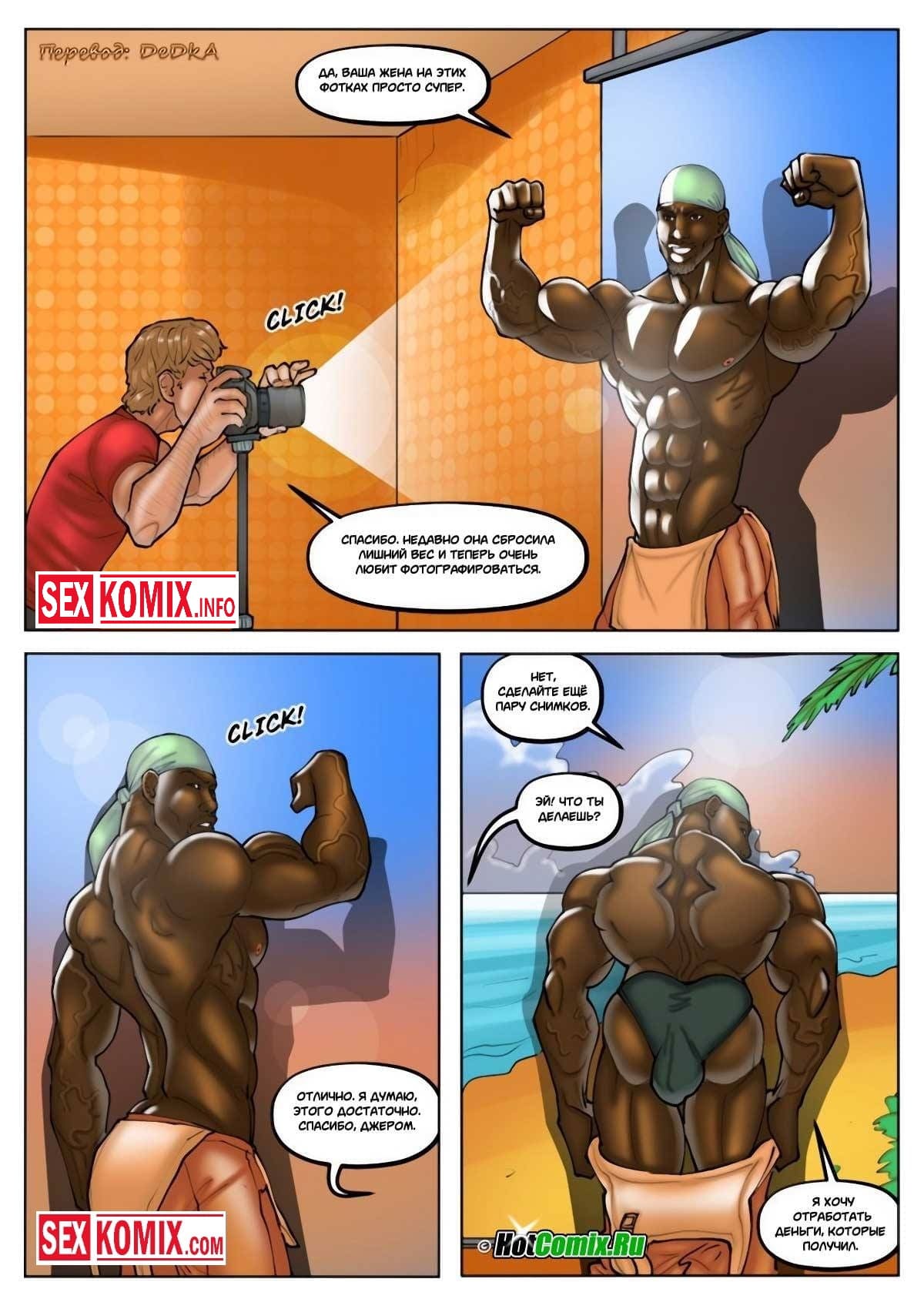 Порно комикс Белые жёны и чёрные садовники. Часть 2. Рыжая красотка наняла фотографа для фото сессии, пока парень её снимал, в окно подсматривал чернокожий садовник. Он увидел как она красиво позирует и почувствовал возбуждение, нужно было что-то делать. Во время перерыва садовник подошёл к фотографу попросил сфотографировать его, тот согласился. И чернокожий парень начал позировать демонстрируя своё накаченное тело. Когда красотка вернулась в комнату она потекла от горы мышц и огромного члена выпирающего из штанов садовника. Она предложила фотографироваться вместе и в это время хитрец начал прикасаться к женщине и соблазнять её.