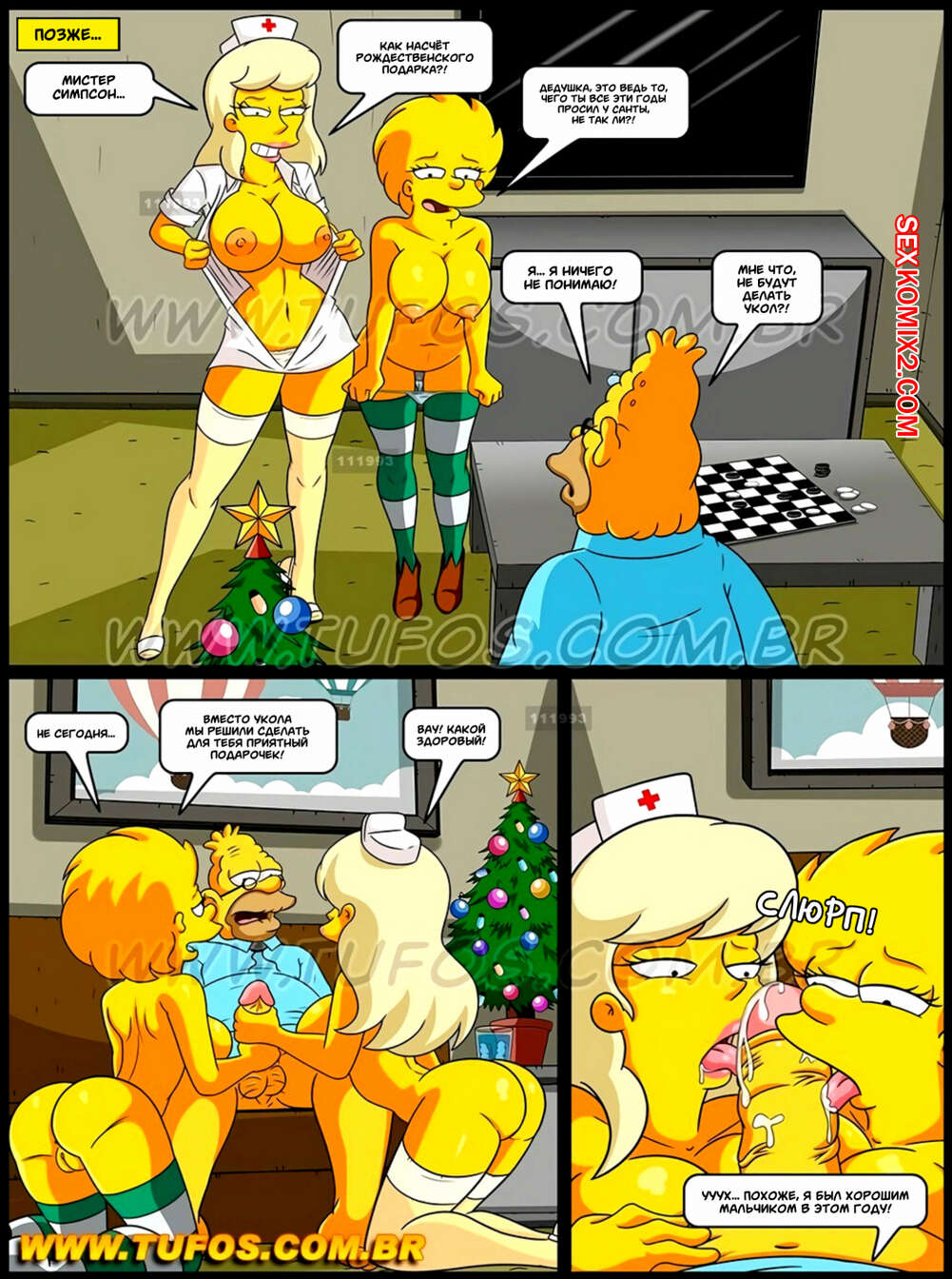 Порно комикс Симпсоны. Часть 10. Рождество в Доме престарелых Юная девушка решила пообщаться с пожилым мужиком о его бурной молодости. Тогда мужик решил показать ей свой стояк, а их в этот момент прервала горячая медсестра. Тогда сучки решили устроить ему рождественский сюрприз и сделать ему горячий тройничок.