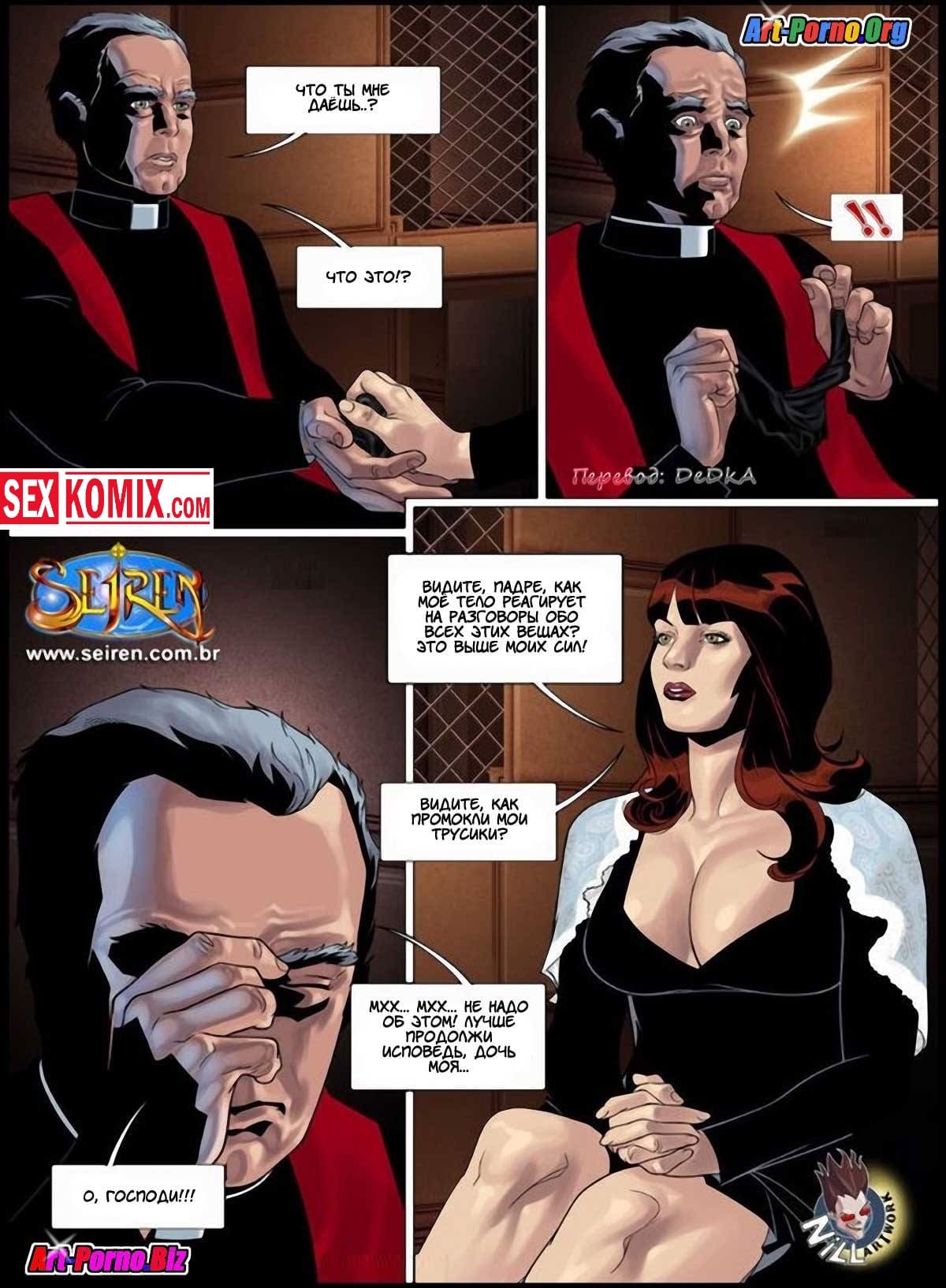 Порно комикс Несколько грешков. Часть 2. Это история о том как девушка пришла исповедаться и начала рассказывать как она соблазнила парня. Пока девушка сидела в исповедальном ложе она очень сильно возбудилась а священник сильно смутился. Ведь она во всей подробностях рассказала ему историю своей похоти: как она в компании дразнила парня надрачивая ему член пока он не кончил. На следующий день она позвонила ему пригласила его в надежде что он займется с ней сексом. Она очень сильно его хотела, хотела чтобы он отымел её в разных позах. Хотела отсосать у него. Когда это всё услышал священник он попросил её покаяться но девушка уже не могла остановится и продолжала свой рассказ во всех подробностях.