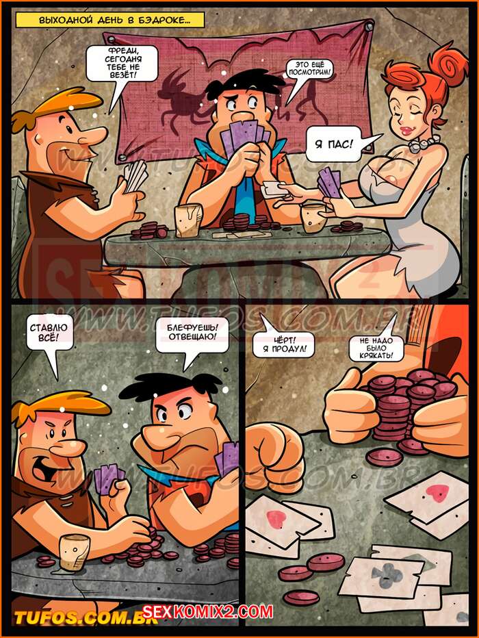 Порно комикс Флинстоуны. Часть 12. Все на кон в покер Семейка решила поиграть в карты и ставки были слишком высоки. В итоге вся азартная играла переросла в дикую страсть и они устроили мощную групповуху прямо на игральном столе.