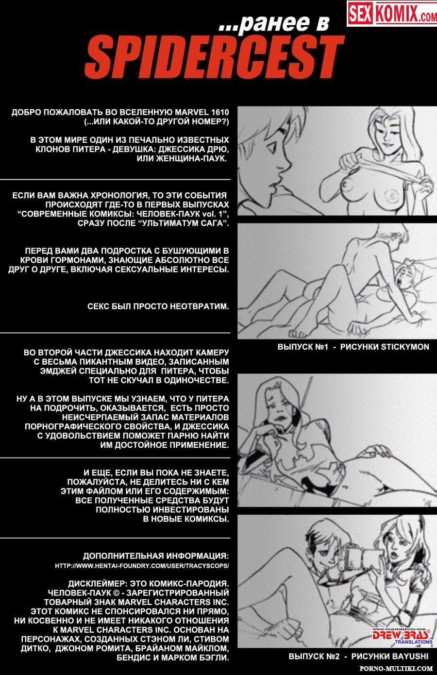 Порно комикс Совершенный человек паук. Часть 3. После целой ночи горячего секса между Питером Паркером и его двойника женского пола. Наступило утро, но наши супер герои все ещё полны сил и готовы к новому сексу. Девушка решила показать человеку пауку, что она записывала на видео. Это был секс сразу с тремя парнями, она обрабатывала член каждого очень тщательно. Питер удивился, как она на такое пошла. Девушка пообещала, что в следующий раз позовет и его на оргию с женщиной пауком. И они в очередной раз занялись сексом, любовники сами сбились со счету.