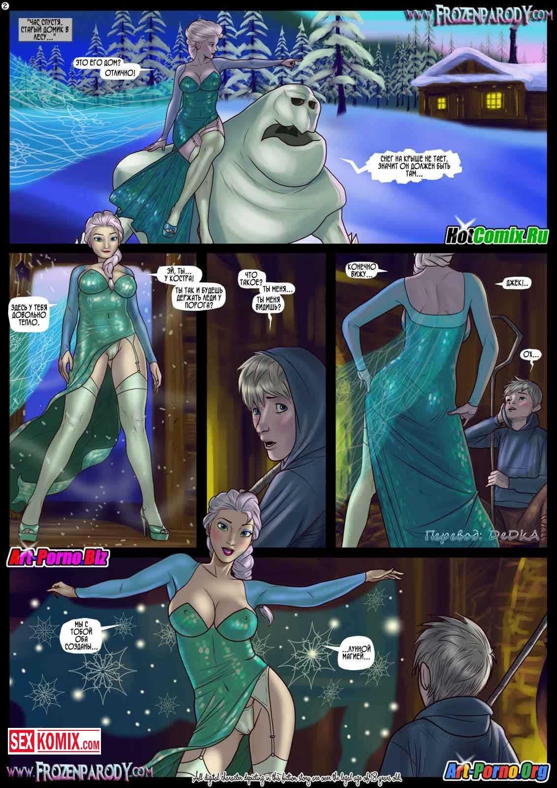 Порно комикс Холодные пародии. Эльза и Джек. Сексуальная волшебница по имени Эльза долго ищет своего любимого в заснеженном лесу, она призвала себе на помощь ледяного великана, и тот указал девушке путь. Он привел её к хижине, где был Джек, он очень обрадовался, когда увидел красотку и набросился на неё с порога. Девушка попросила его не торопиться, посадила его на кровать и показала стриптиз. Потом подобралась поближе и сделала горячий миньет, она взяла в рот уже стоящий член и хорошо его отсосала.