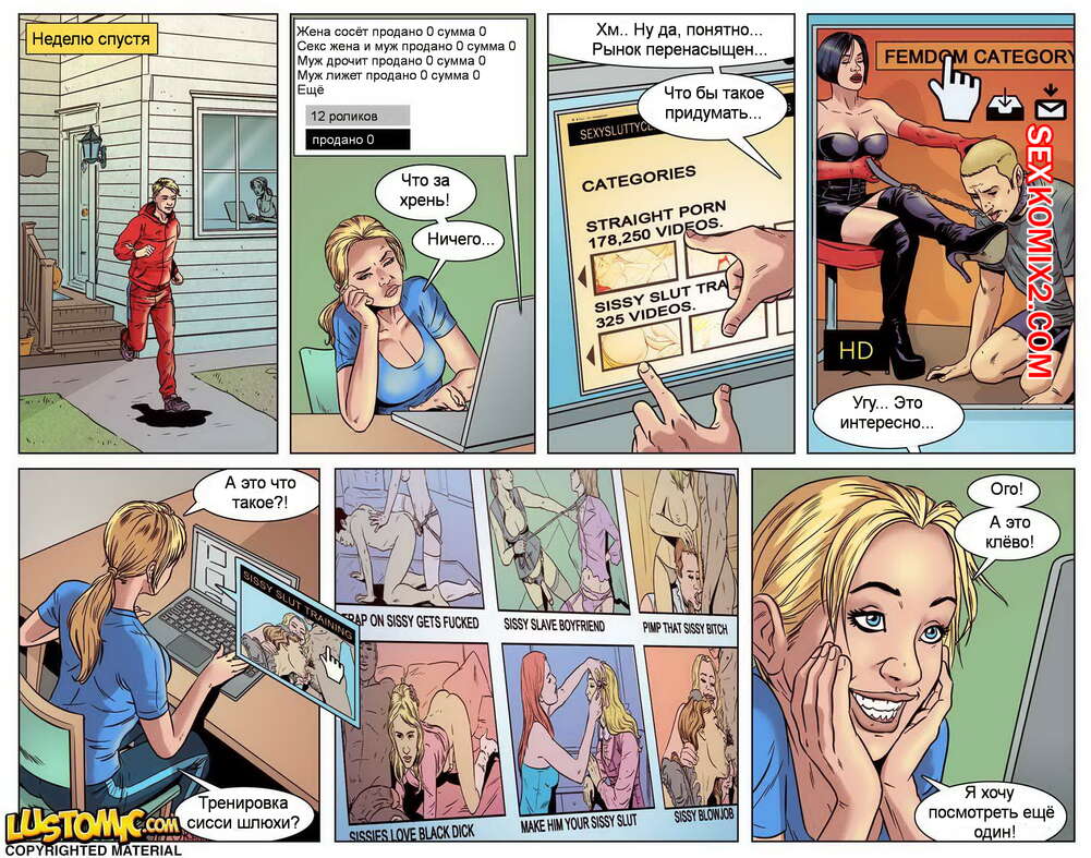 Порно комикс Сисси порнозвезда. Часть 1. Sissy Porn Star. Lustomic У горячей блондинки и ее мужа возникли проблемы с деньгами, поэтому она решила сама их заработать, отправившись в порно. Сучка стала снимать видео со своей подружкой с хуем, а также стала ебаться с другими мужиками за большие деньги.