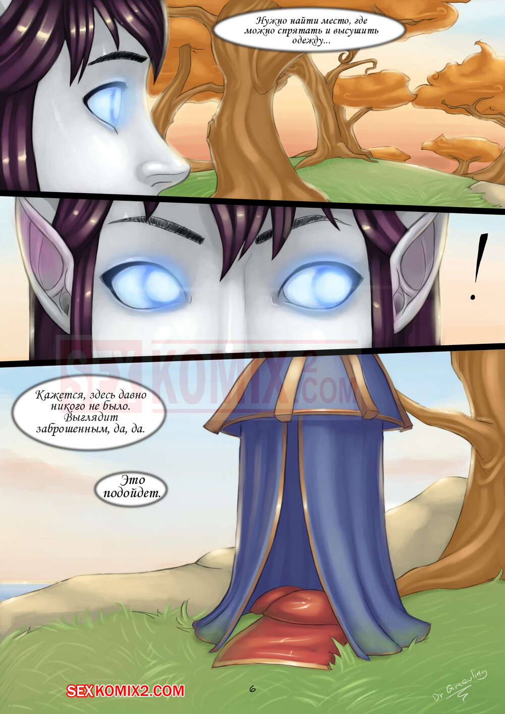 Порно комикс World of Warcraft. Эпические Путешествия и Случайные Встречи. Часть 1. Двое парней застали горячую голую красотку и решили с ней повеселиться. Они стали ласкать ее пизденку, а она у них хорошенько отсосала, после чего парни ее классно выебали.