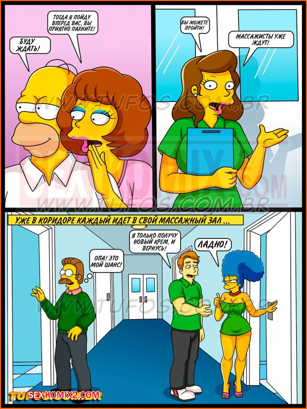 Порно комикс Симпсоны. Часть 36. Перепихон в массажном доме. Гомер и Мардж заделались в свингеры. Договорились с соседями посетить вместе массажный салон и устроили там соседскую оргию.