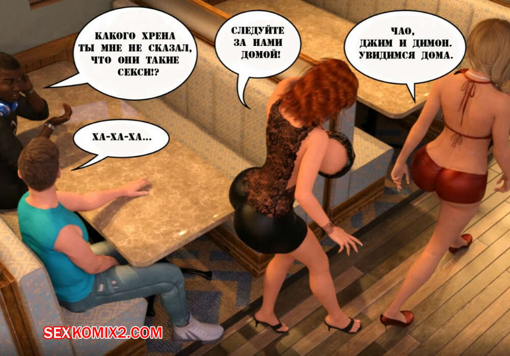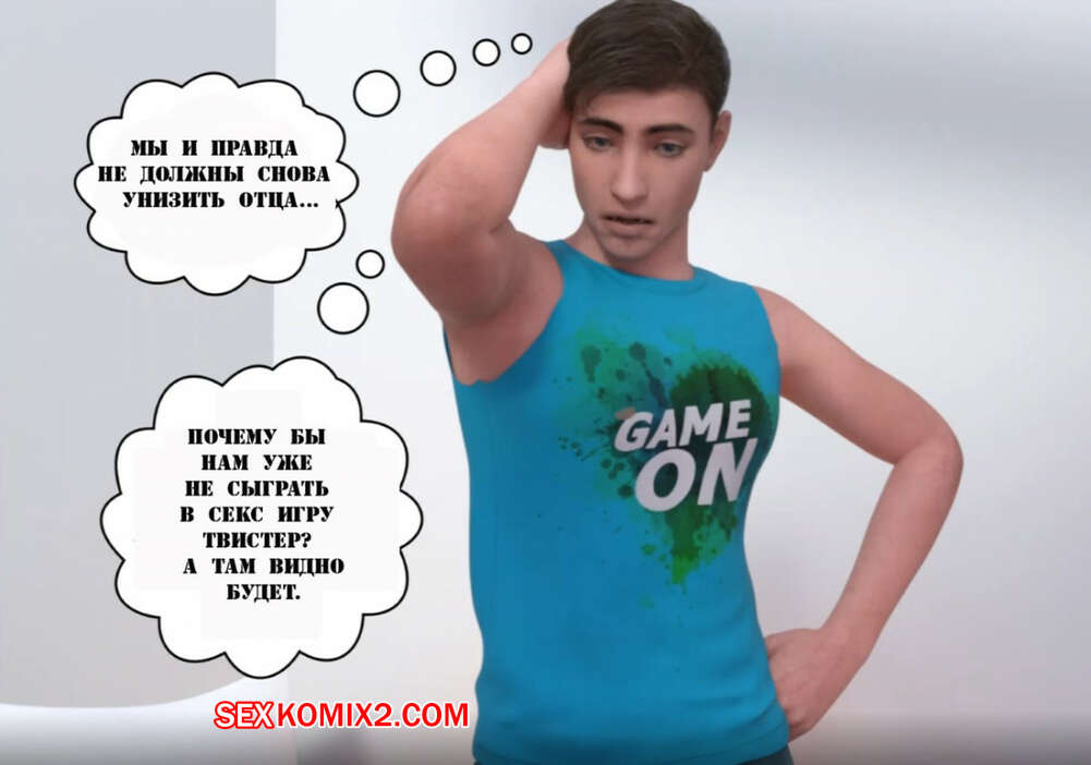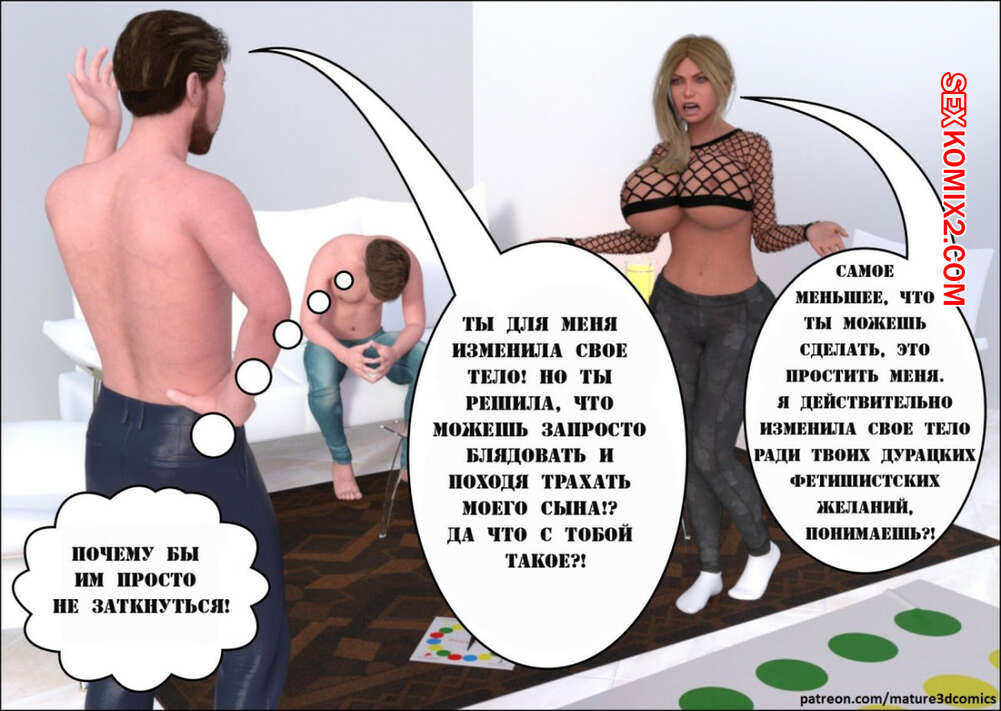 Порно комикс Сексуальная игра в Твистер. Часть 3 Две горячие милфы решили поиграть полуголые в твистер на глазах у мужа и сына одной из них. У парней сразу встал хуй, поэтому красотки решили помочь им расслабиться и стали сосать их большие хуи, после чего дали себя хорошенько выебать.