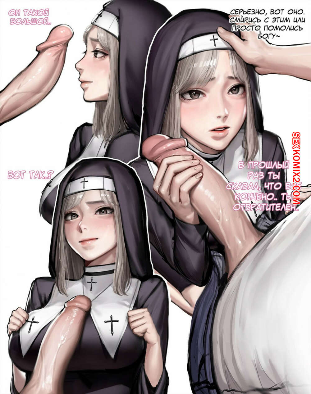 Порно комикс Монашка. Kidmo Горячая монашка блондинка устала жить скучной жизнью и наконец захотела повеселиться. Она встретилась с парнем и сразу стала сосать его большой хуй, после чего улеглась с ним на кровать, где он ее хорошенько выебал в задницу.