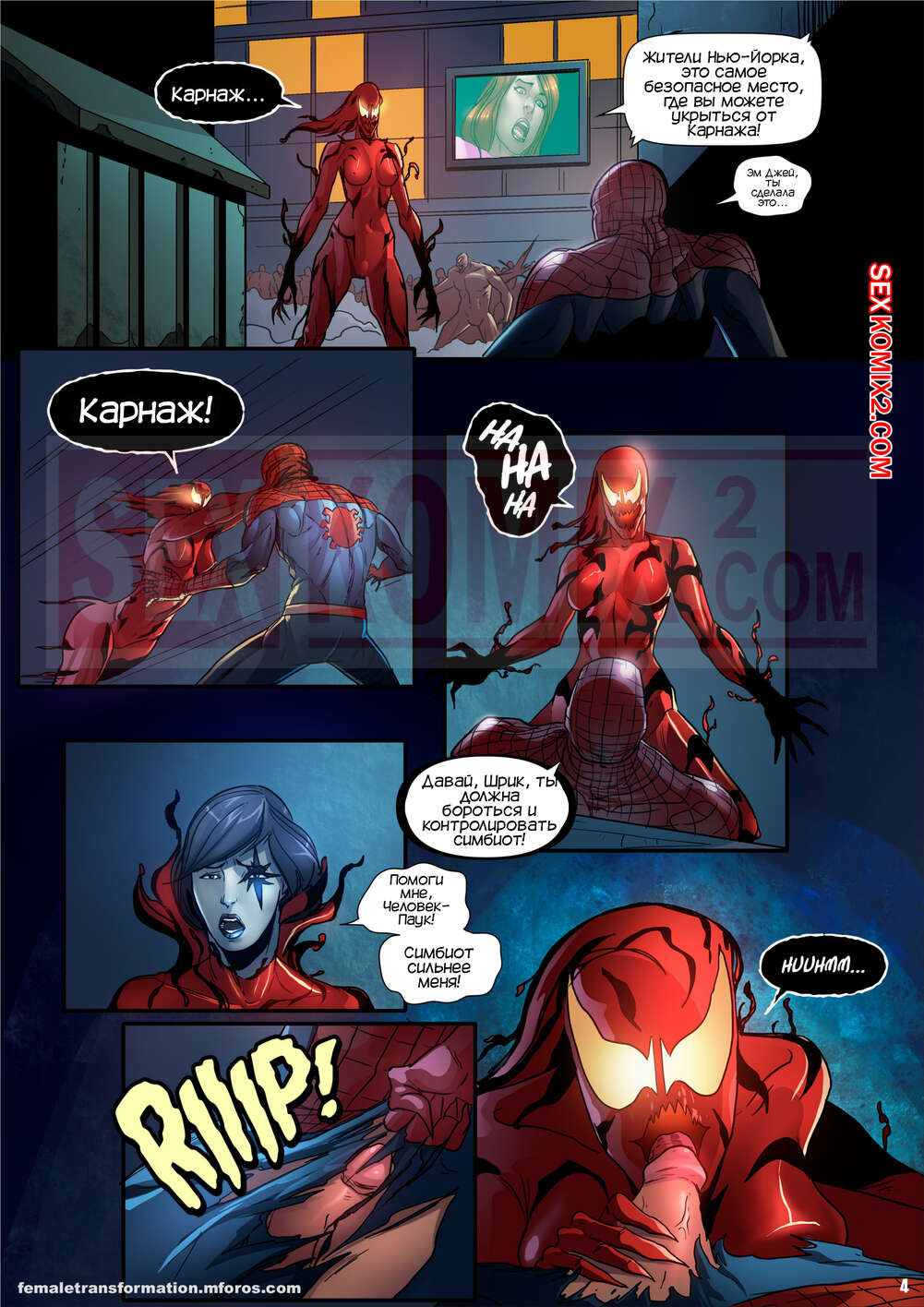 Порно комикс Веном. Королева симбиот. Часть 1. Symbiote Queen. 6Evilsonic6 На город напал симбиот Карнаж и стал захватывать жителей. Пока ЧеловекПаук боролся с красоткой, на которую напал Карнаж, его подругу Мэри Джейн схватили и начали трахать ее в ротик и пизду, желая сделать королевой Карнажа.