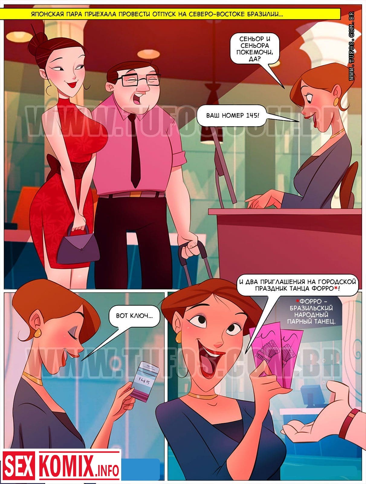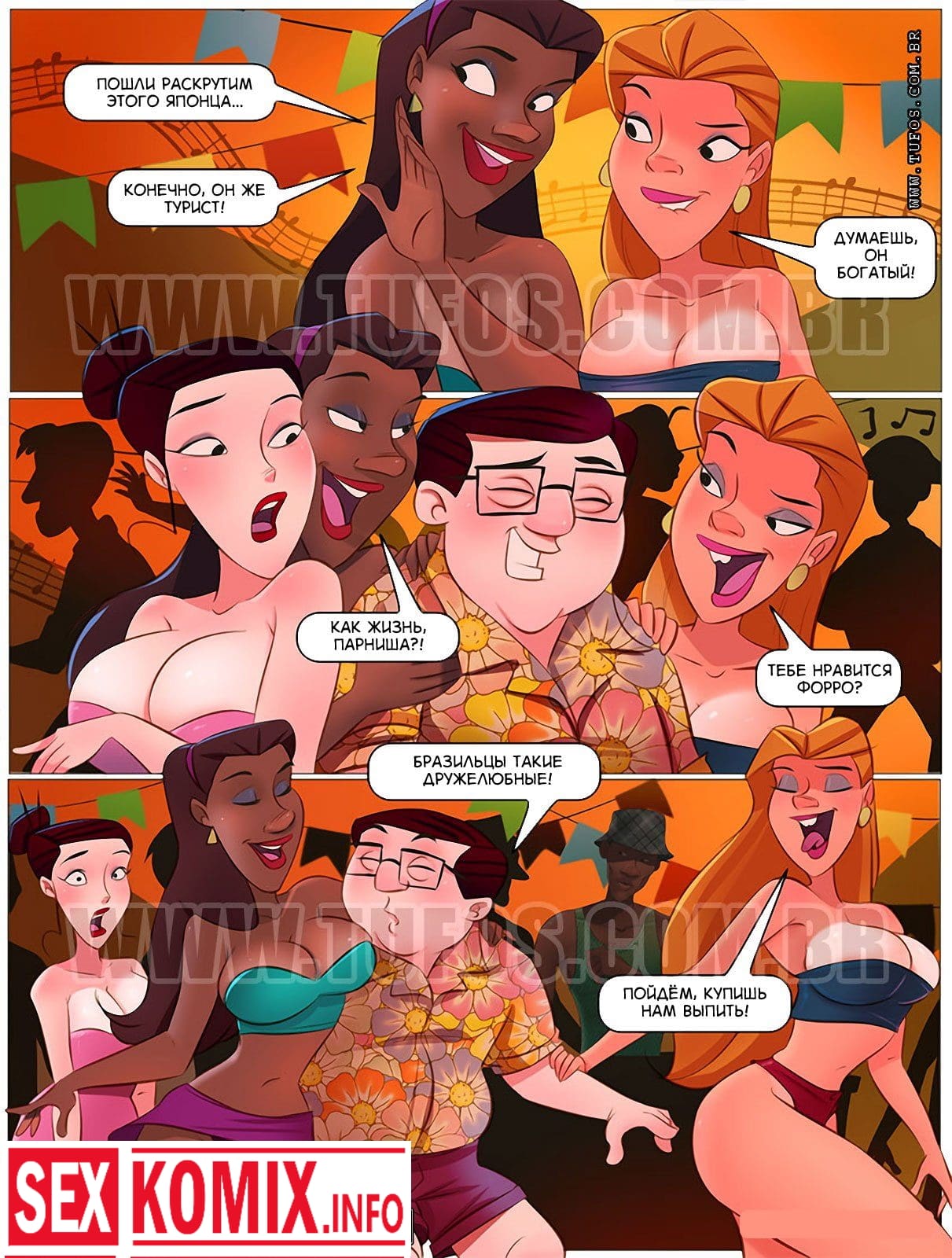 Порно комикс Негритос Пиконе. Часть 4. Горячий бразильский танец. Так богатая пара из Японии приехала на северо-восток Бразилии, чтобы познакомиться с тамошней культурой. На городском празднике танца японца окрутили местные шлюхи, увели его в бар и в два счёта пропили все его деньги. А в это время оставшаяся без присмотра японка случайно напоролась на огромный член негритоса Пиконе. Всеми дырами по очереди. Ну, так совсем, случайно получилось у неё. В общем, познакомились японцы с культурой.