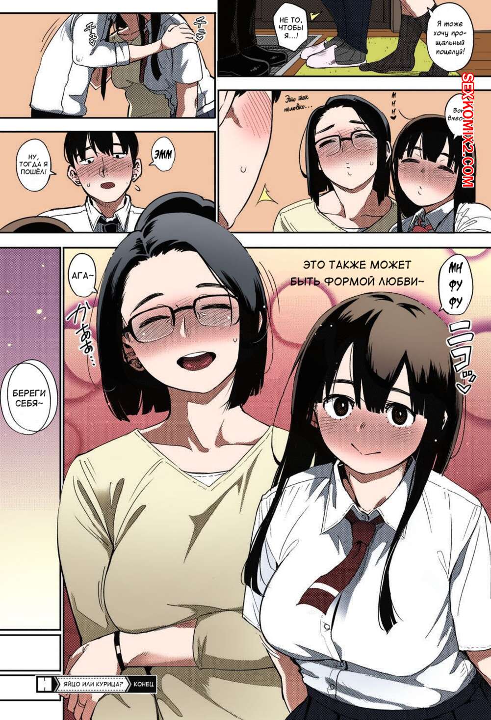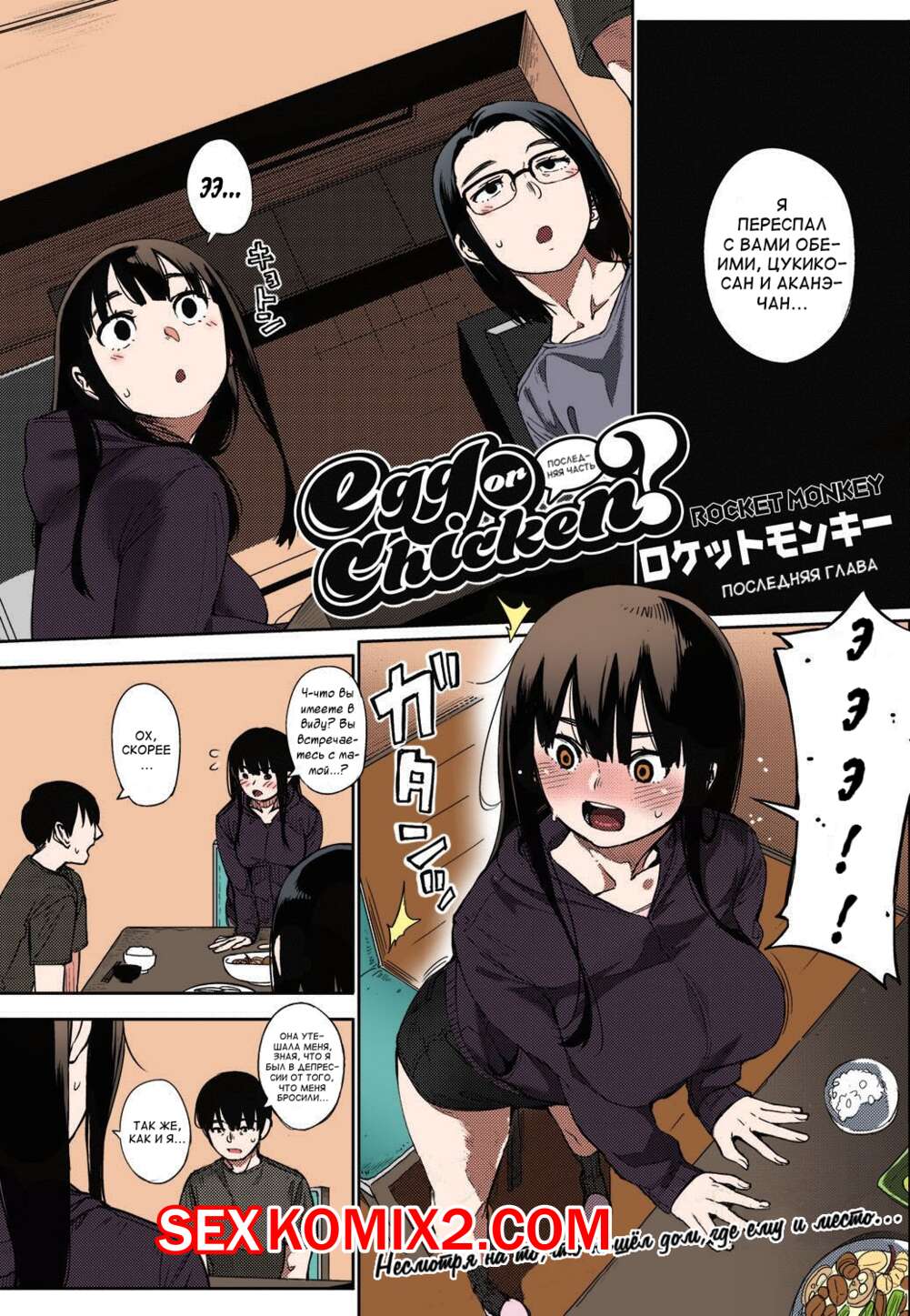 Порно комикс Яйцо или курица. Часть 3. Egg Or Chicken На этот раз милфа решила повеселиться с молодым пареньком и позвала свою дочь присоединиться к ним. Они вместе стали отсасывать большой хуй парня, а затем дали ему по очереди себя выебать.