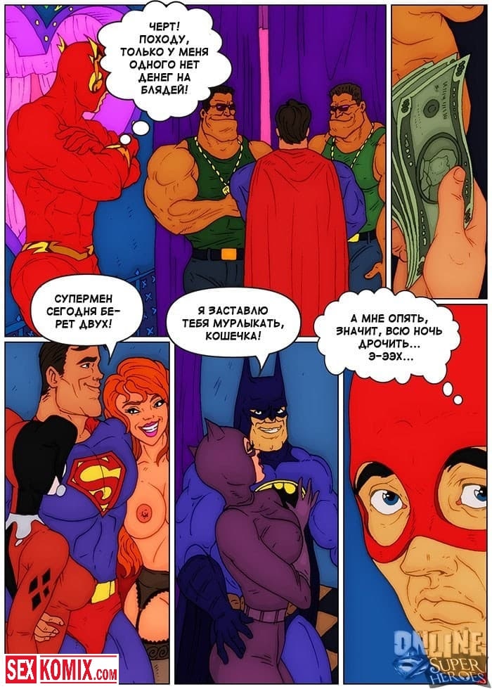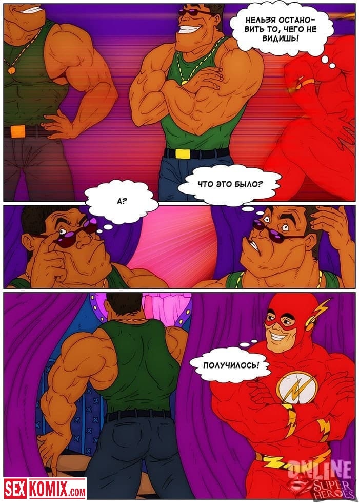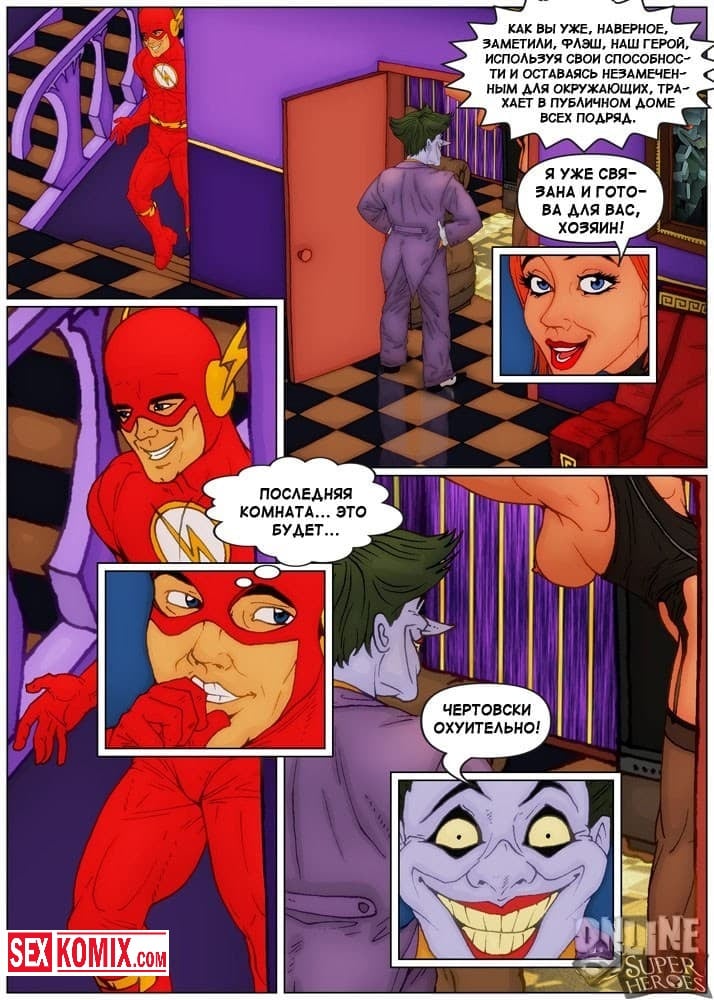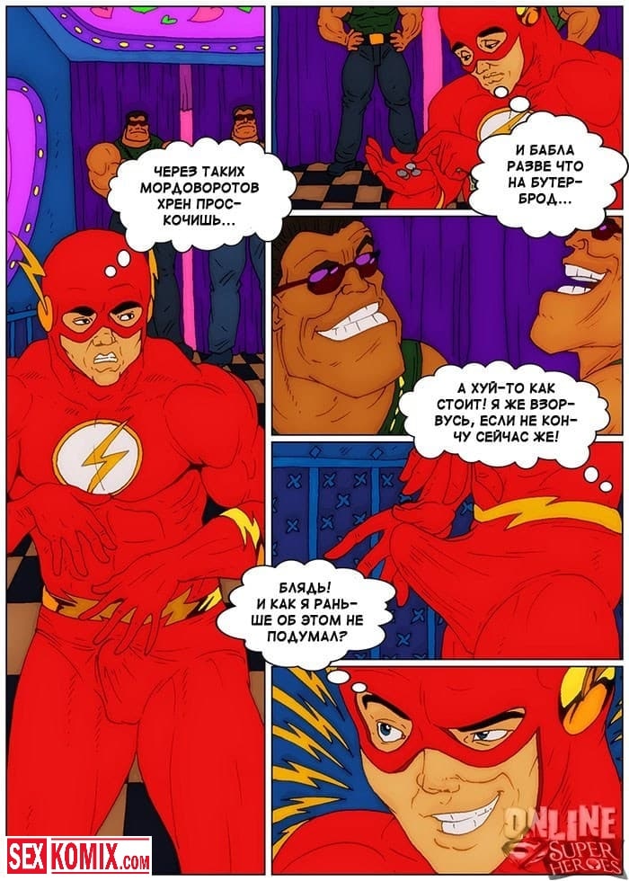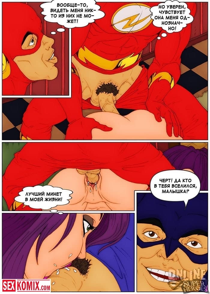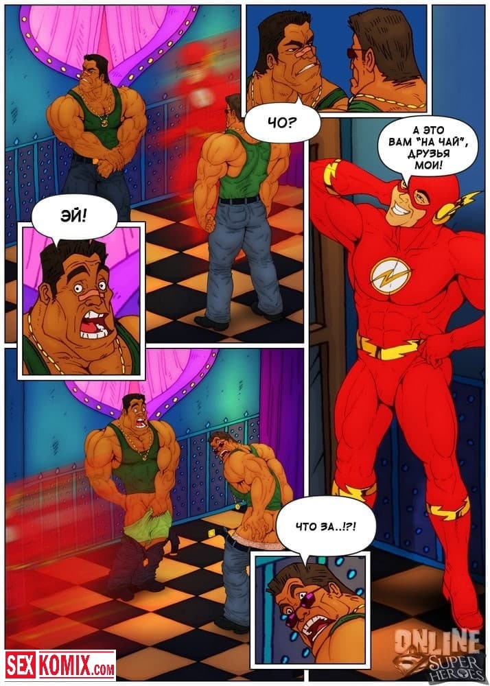 Порно комикс Приключения Флэша в борделе. Барри узнал, что в городе открылся бордель для супергероев и хотел туда сходить. Когда он пришёл, на входе его встретила двое здоровенных охранников, которые не пустили его заведение потому, что у него не было денег. Поскольку флэш обладает очень быстрой скоростью, он пробежал мимо них, что они его даже не заметили. И после заходил в каждую комнату с шлюхами, и быстро трахал их, что они даже не успевали понять, что происходит.
