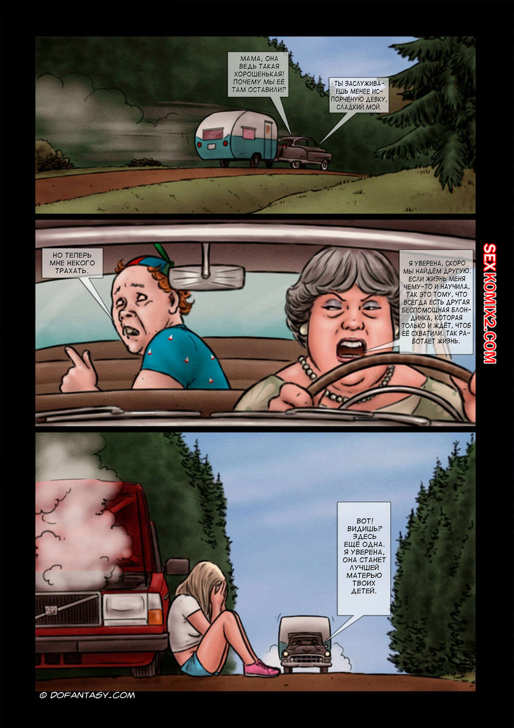 Порно комикс Маменькин сынок. Часть 3. Mamas baby boy Милфа ехала со своим сыном за городом и они решили подвезти молодую красотку блондинку. Пока она отвлеклась, парень набросился на нее сзади. Они связали ее и парень стал ее трахать.