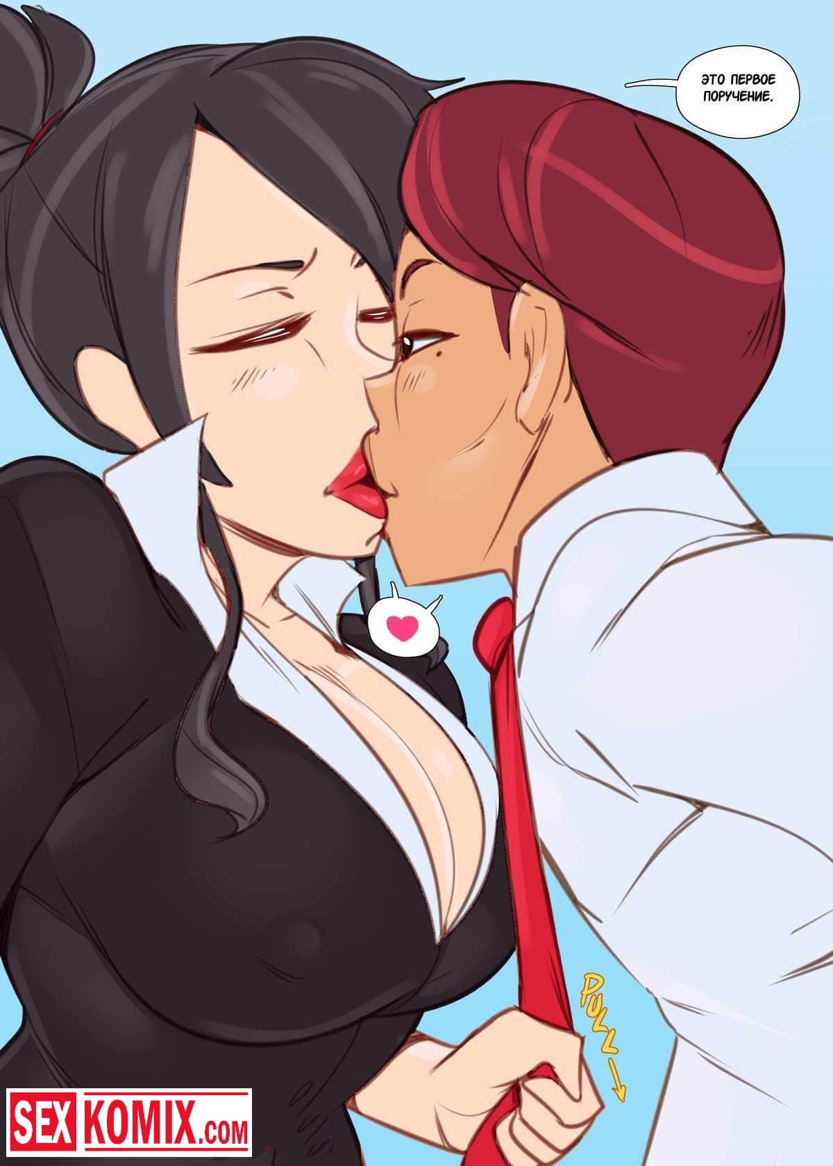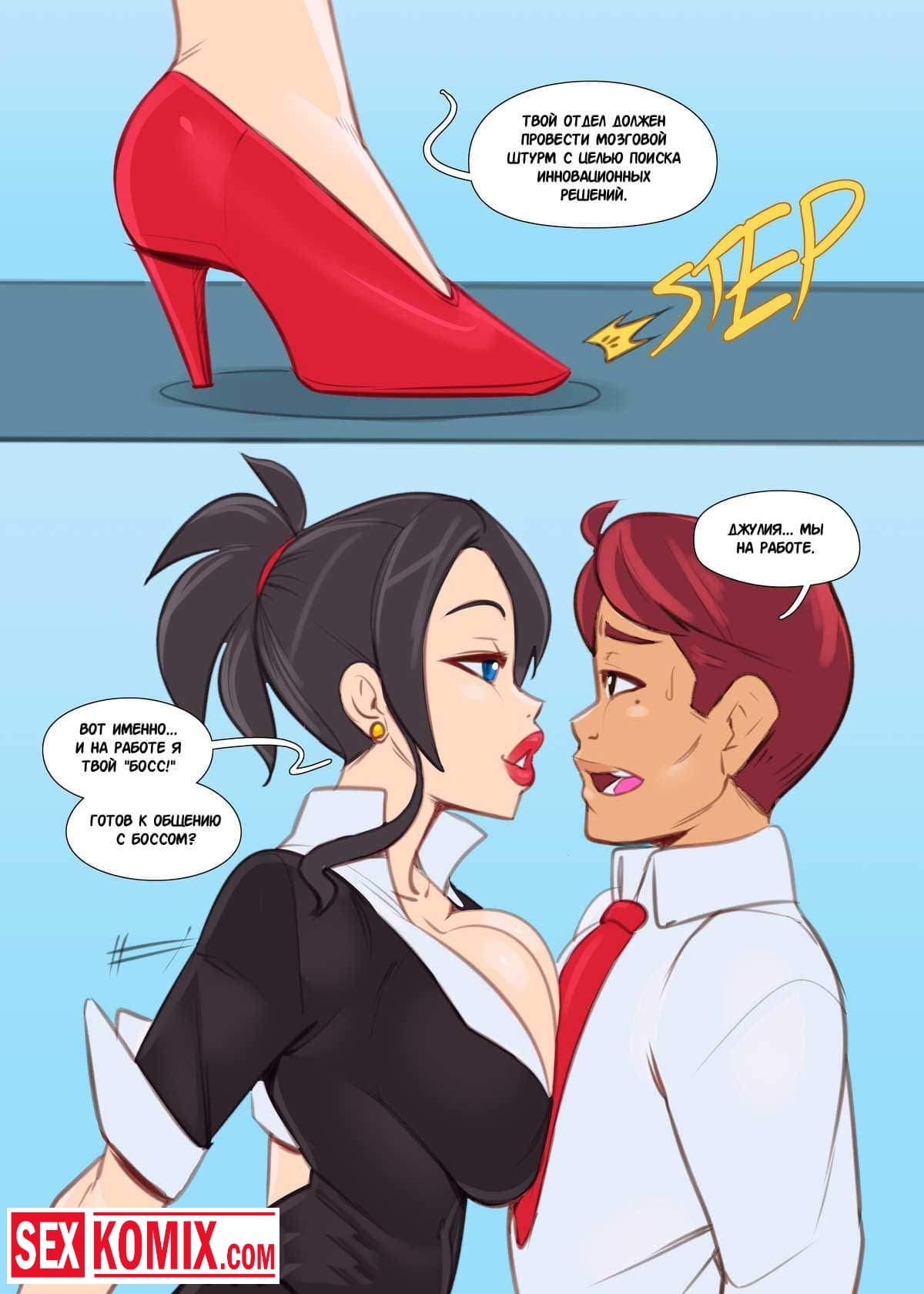 Порно комикс Крутой босс. Очень сексуальная женщина босс увидев годовой отчет сильно разозлилась и вызвала к себе главного аналитика. Симпатичный парень же прибежал в кабинет своей начальнице, когда она начала его ругать. Он подумал, что его уволят, пока женщина кричала из ее лифчика выпала грудь и видно сосок. Увидев его парень возбудился, его член, женщина заметила возбуждение своего подчиненного и решила наказать его нестандартным способом. Она попросила заняться с ней горячим сексом на ее большом столе.