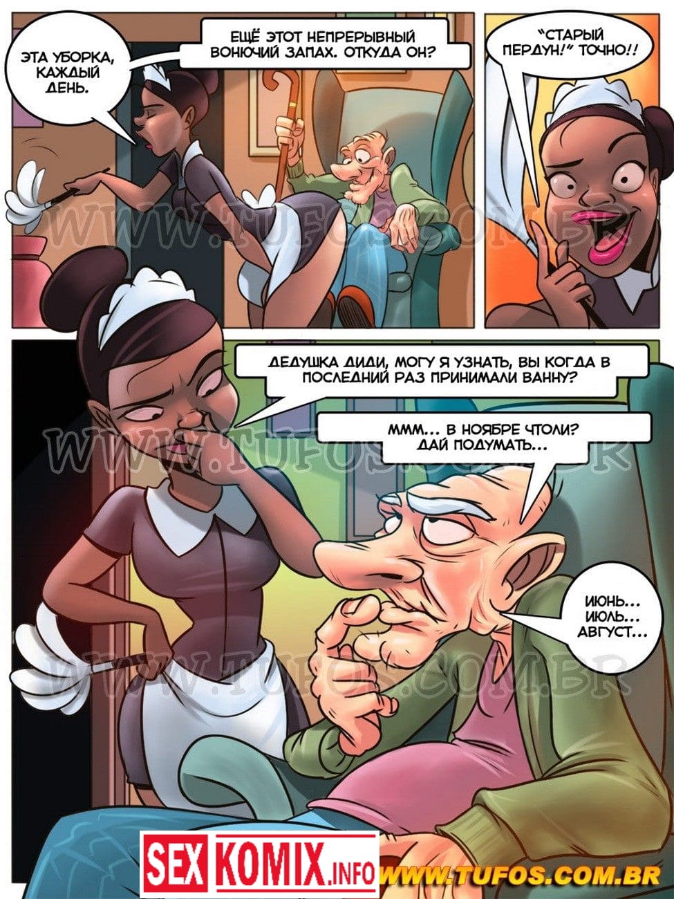 Порно комикс Похотливая семейка. Часть 7. Купание дедушки. И вновь очередная часть долгожданной истории. Комикс покажет вам, как во время уборки домработница Клеуза почувствовала ужасный запах, исходивший от дедули. Недовольная горничная, поворчав, ведет грязнулю в ванную комнату. К неожиданности Клеузы во время мытья у старого встал член. Мулатка посмеялась над возбужденным стариком, но даже не могла представить, что он её хорошенько трахнет.