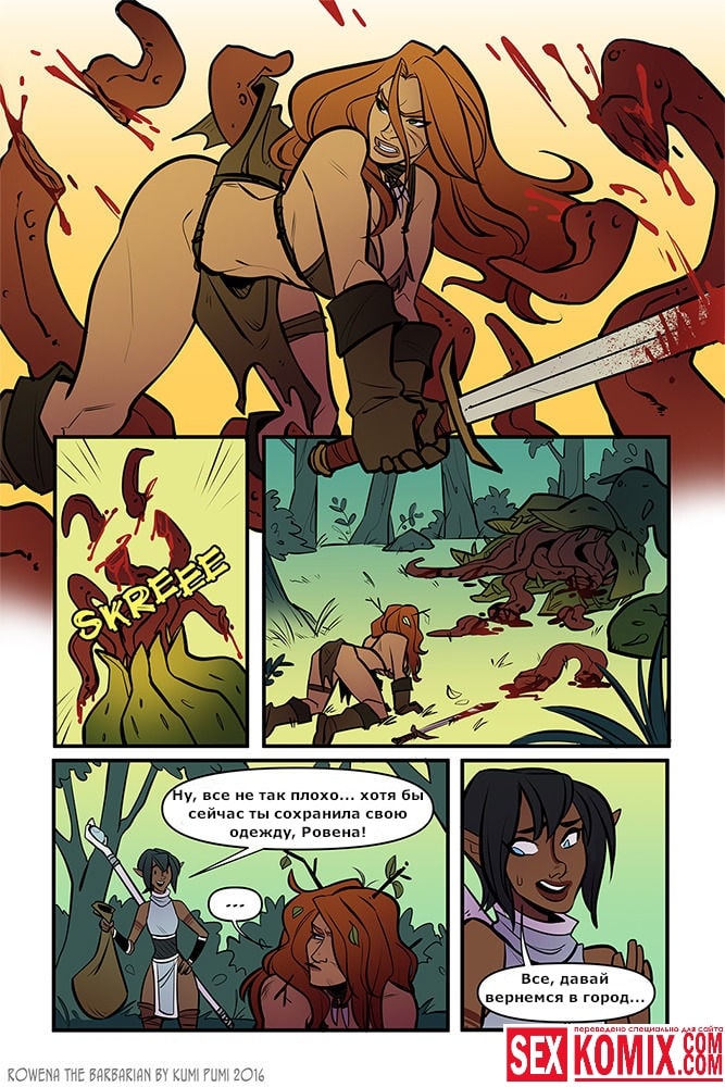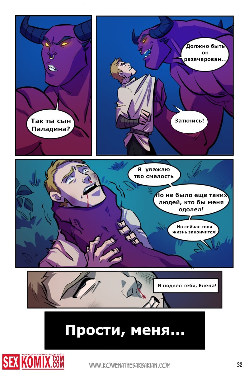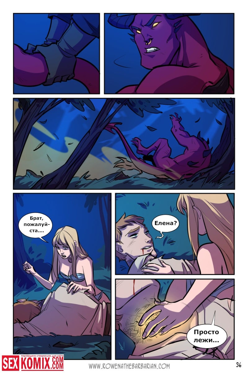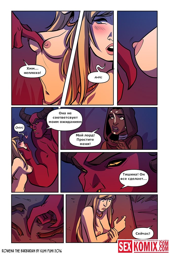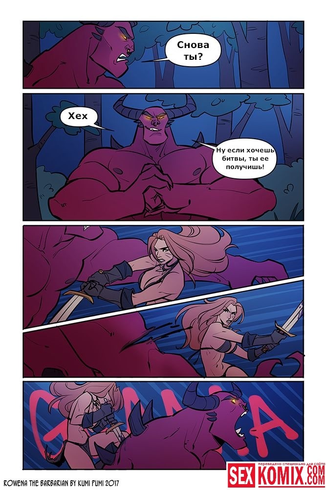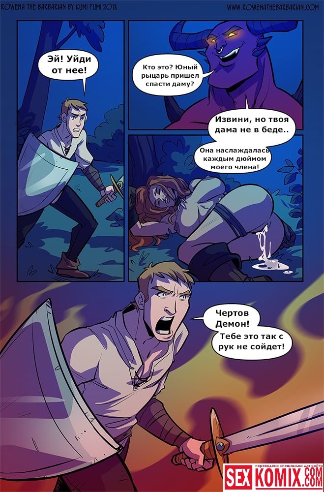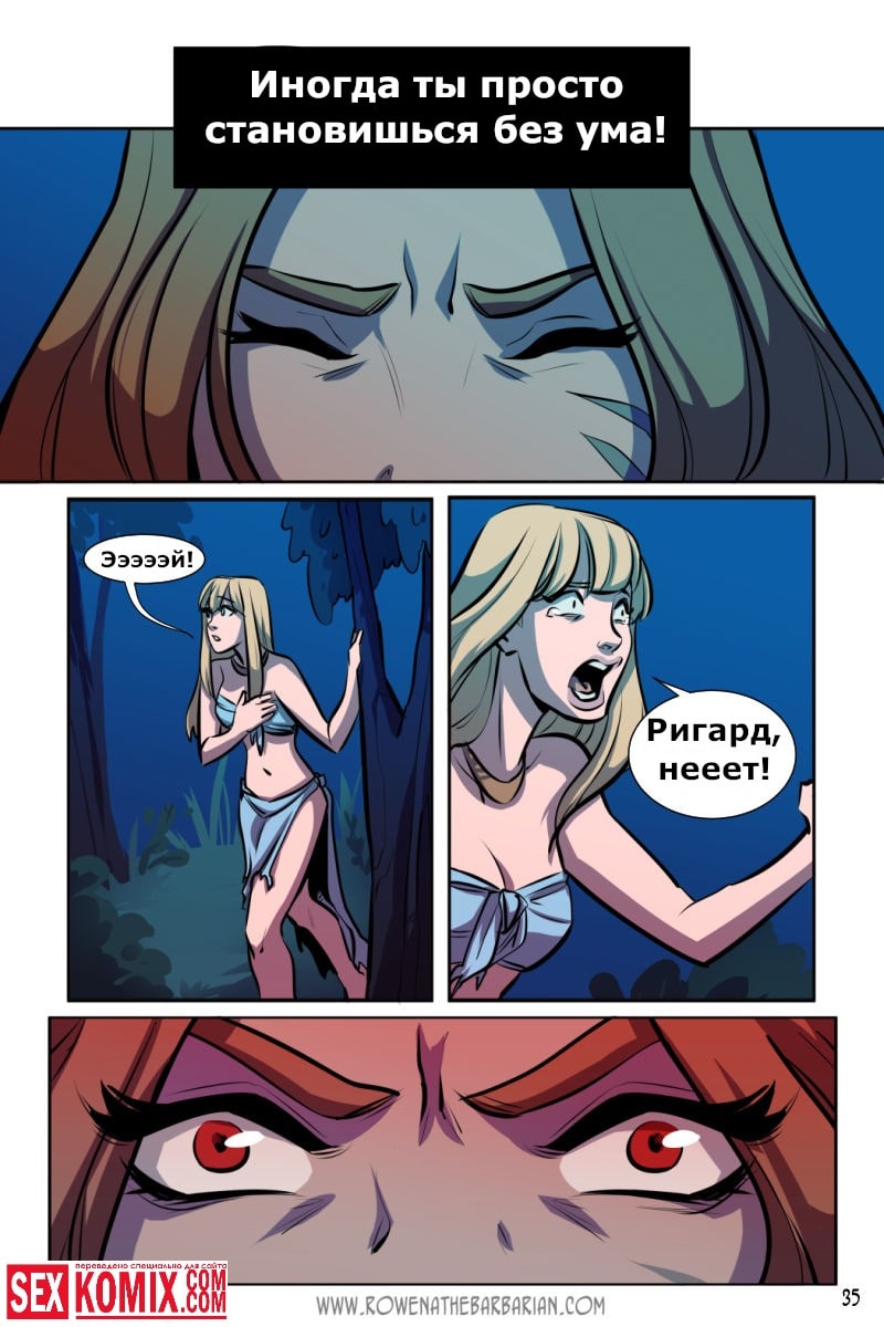 Порно комикс Ровена Варвар. Две путешественницы встретили в таверне мужчину, который просил помощи, т.к неизвестные похитили его сестру. Девушки согласились помочь. Найдя в лесу пленницу, они увидели что девушка привязана к камню и над ней хотят совершить обряд. Извне появился демон с большим членом и решил лишить девушку девственности. Тут началась битва, и демон захватил одну из путешественниц и трахнул её своим огромным членом.