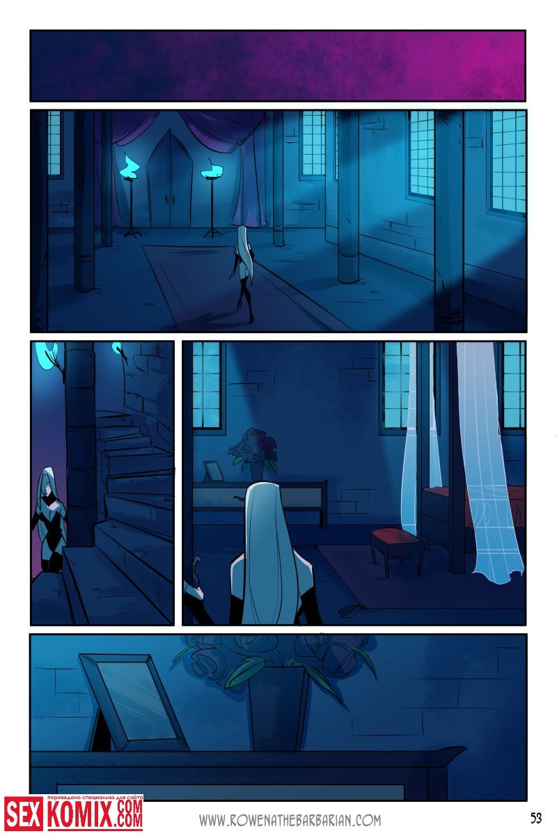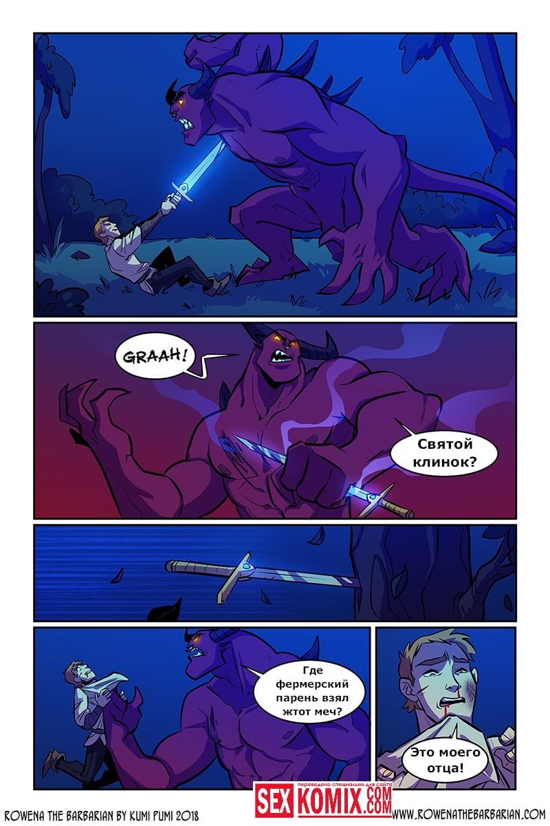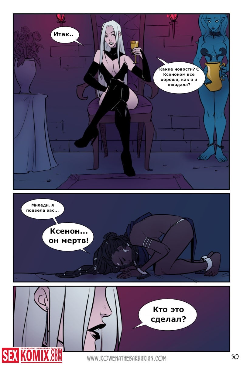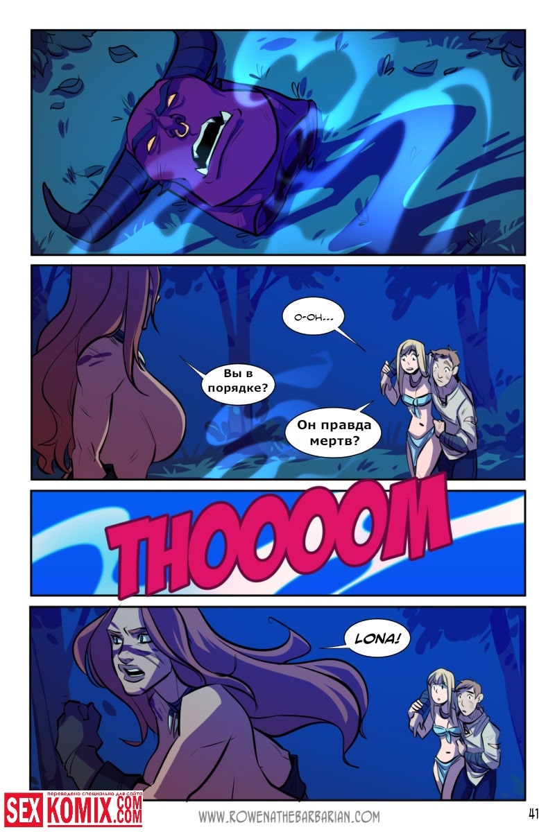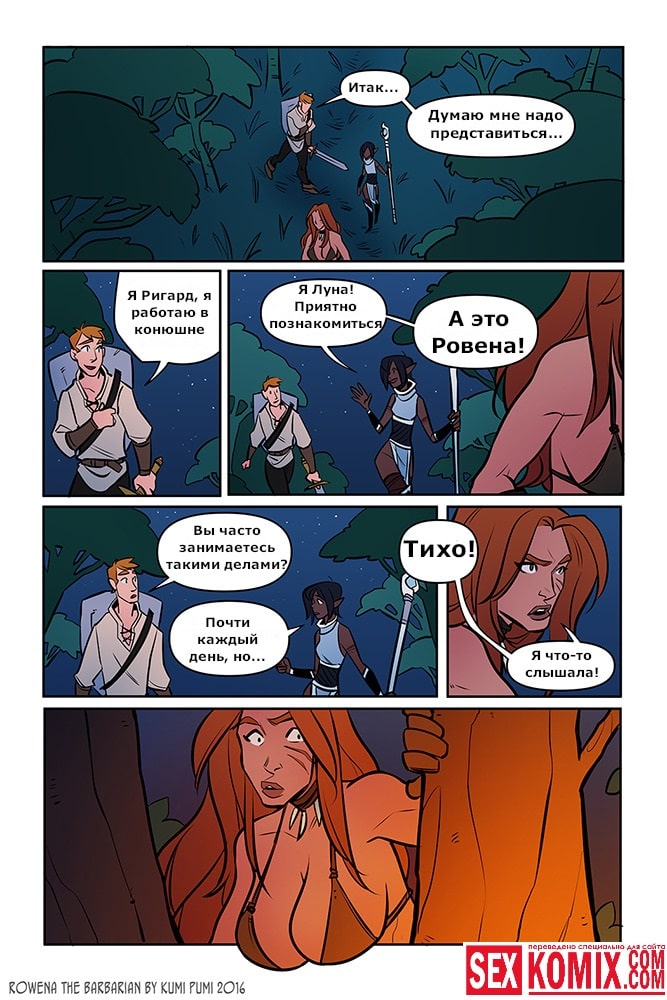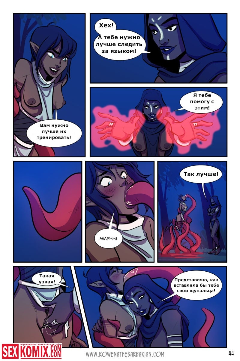 Порно комикс Ровена Варвар. Две путешественницы встретили в таверне мужчину, который просил помощи, т.к неизвестные похитили его сестру. Девушки согласились помочь. Найдя в лесу пленницу, они увидели что девушка привязана к камню и над ней хотят совершить обряд. Извне появился демон с большим членом и решил лишить девушку девственности. Тут началась битва, и демон захватил одну из путешественниц и трахнул её своим огромным членом.