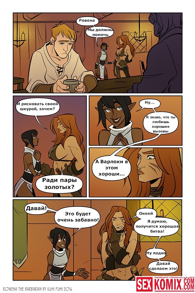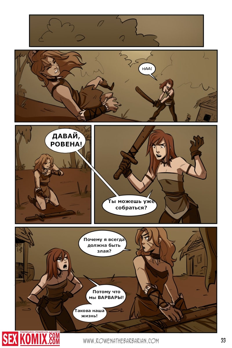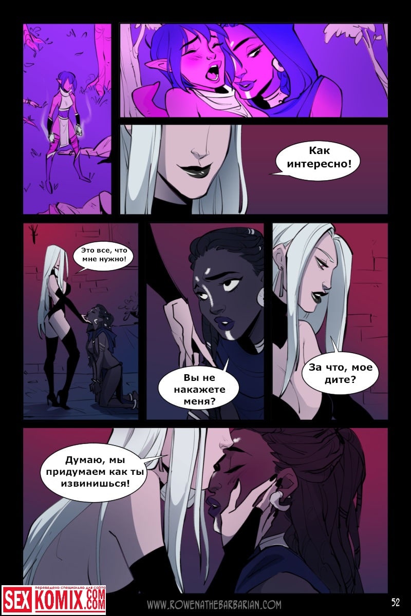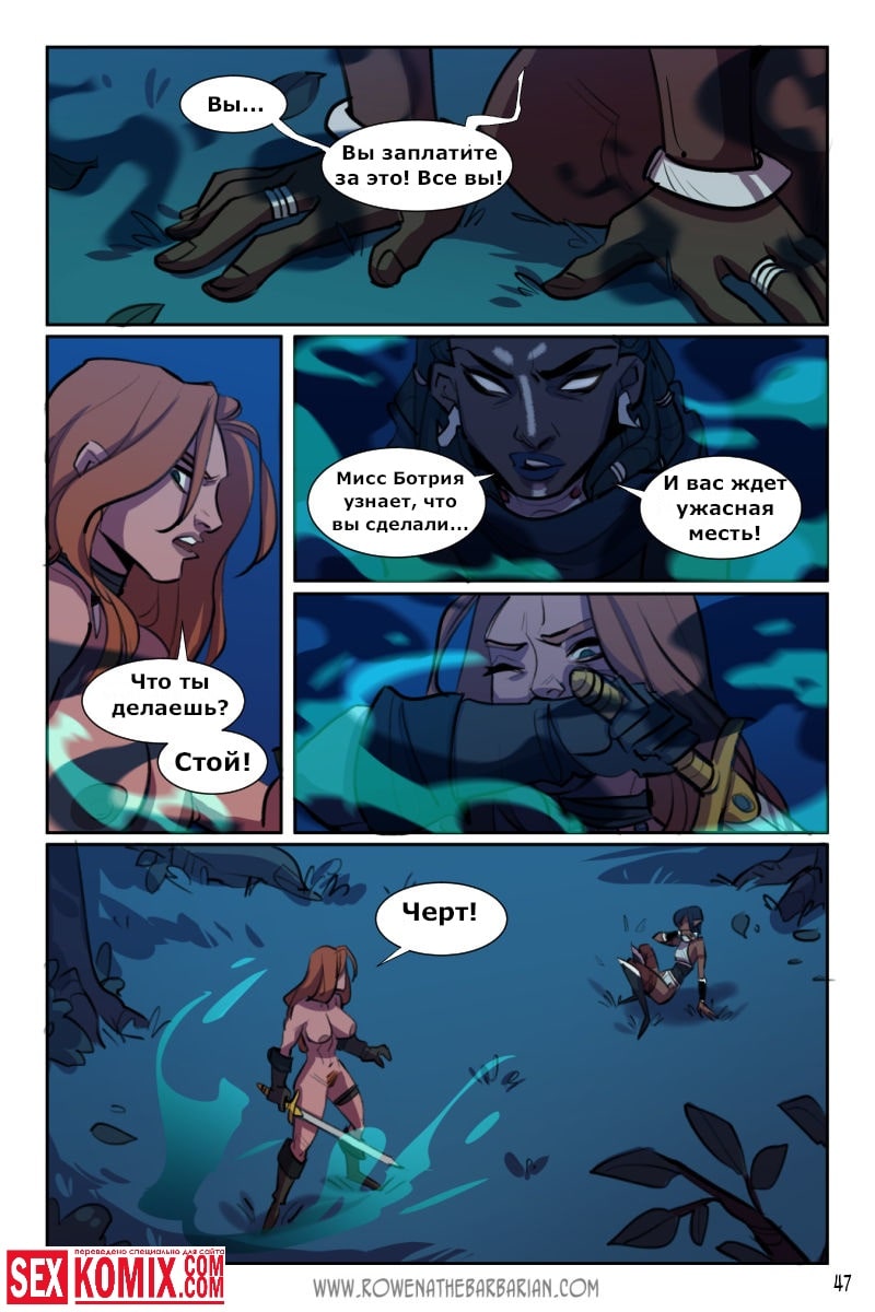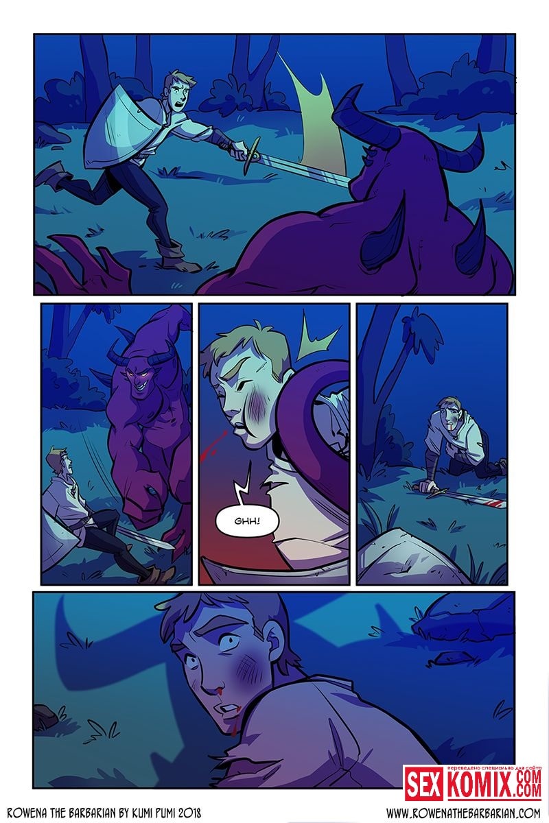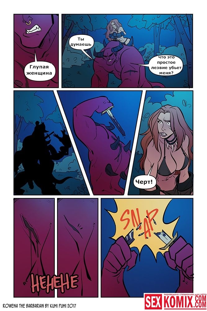 Порно комикс Ровена Варвар. Две путешественницы встретили в таверне мужчину, который просил помощи, т.к неизвестные похитили его сестру. Девушки согласились помочь. Найдя в лесу пленницу, они увидели что девушка привязана к камню и над ней хотят совершить обряд. Извне появился демон с большим членом и решил лишить девушку девственности. Тут началась битва, и демон захватил одну из путешественниц и трахнул её своим огромным членом.
