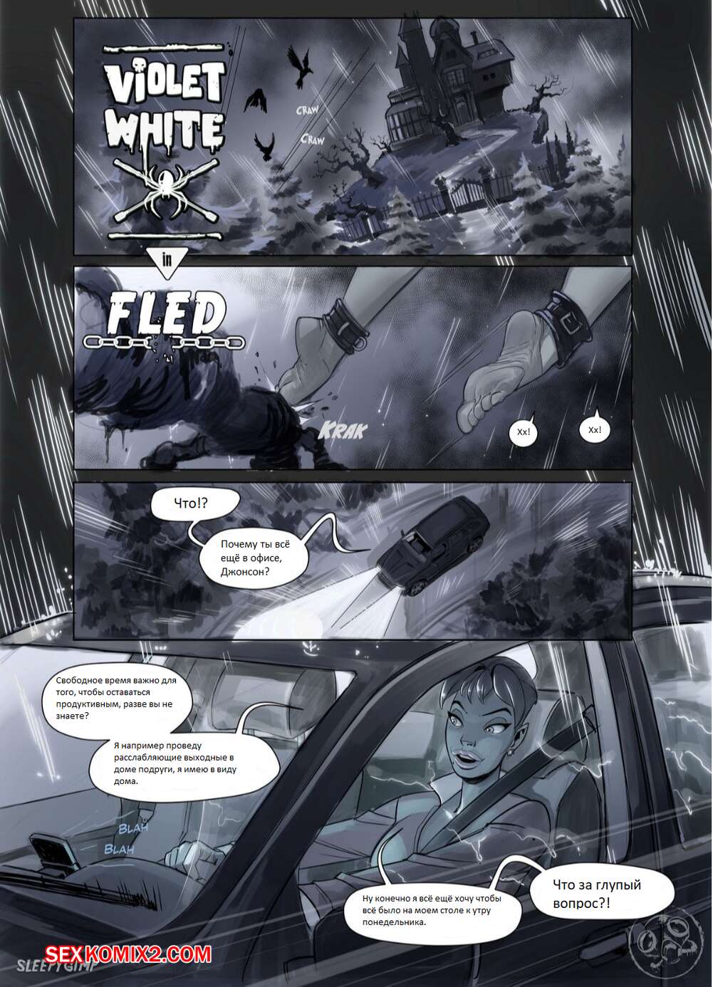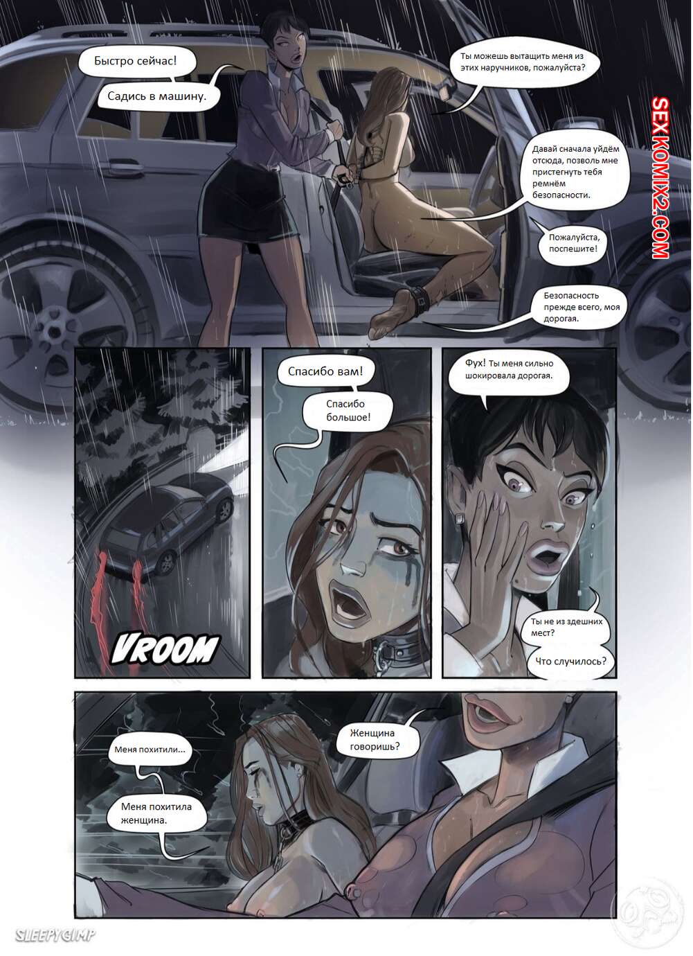 Порно комикс Виолетта. Побег. Violet white in fled. SleepyGimp Милфа брюнетка соблазнил молодую красотку и пригласила ее к себе. Там она устроила ей настоящее БДСМ шоу, но девушке удалось сбежать. Ее решила подвезти сексуальная брюнеточка, которая отвезла ее назад.