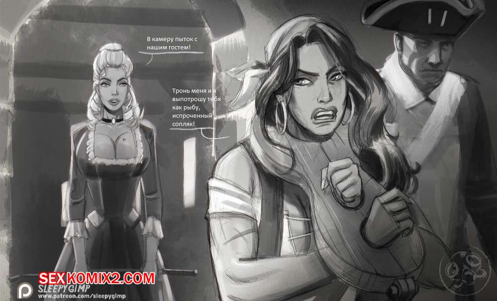 Порно комикс Пиратский допрос. Pirate interrogation. SleepyGimp Две горячие сисястые блондинки решили устроить допрос сисястой брюнетке. Они связали ее и раздели, после чего устроили ей настоящее бдсм представление, узнав у нее все, что им надо.