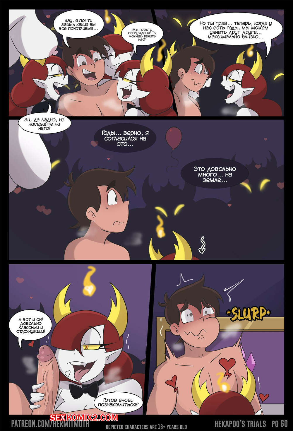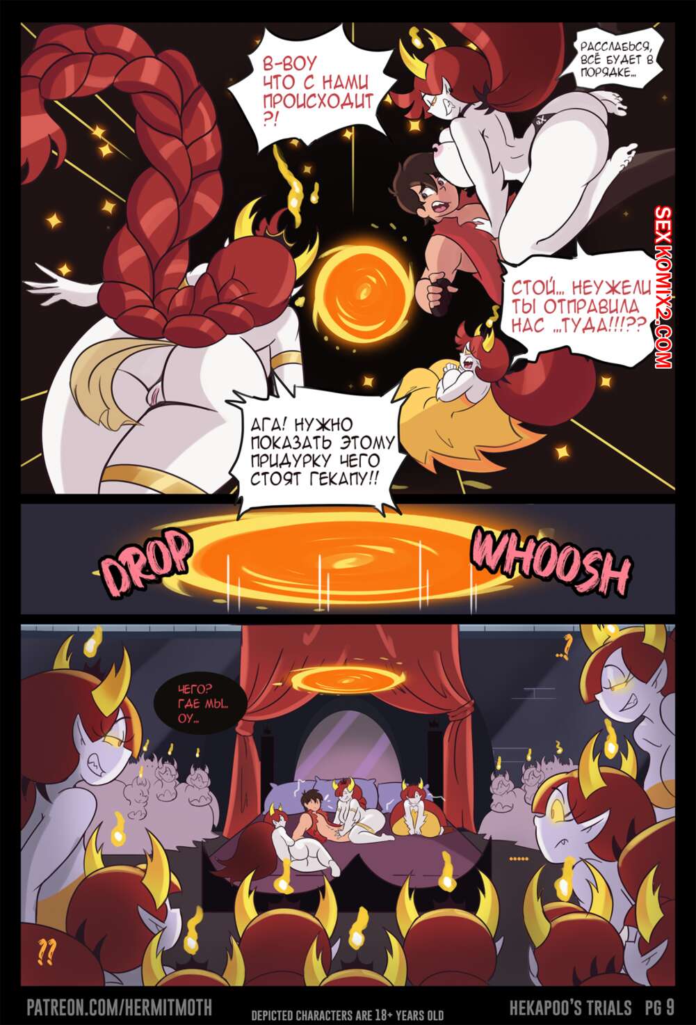 Порно комикс Стар. Испытания Гекапу. Hekapoo Trials Горячие сисястые красотки брюнетки решили повеселиться с парнем. Они уложили его на постель и стали сосать его большой хуй, после чего дали ему себя хорошенько выебать, получив огромное удовольствие.