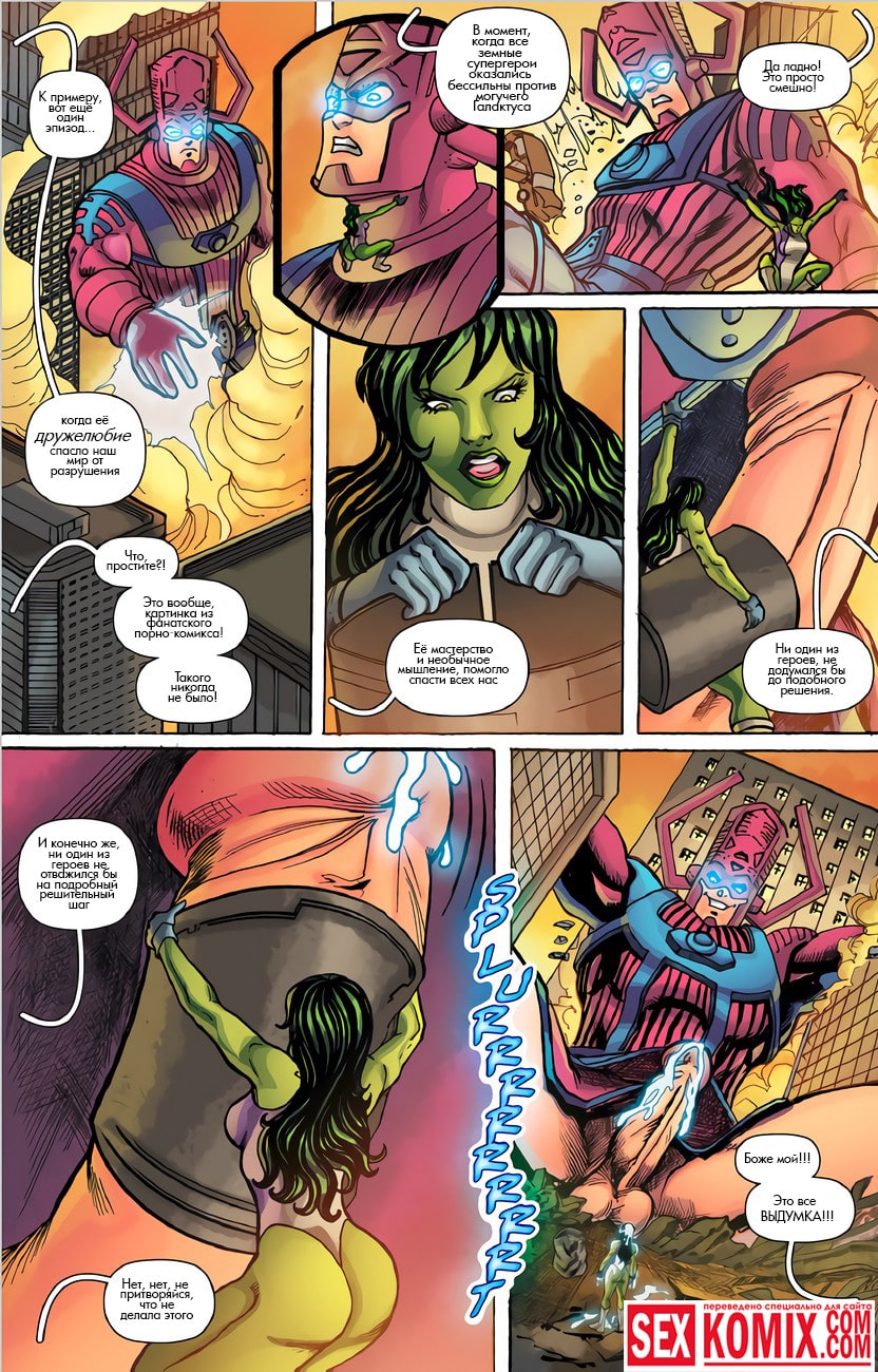 Порно комикс Она Халк. Власти страны решили призвать к ответу женщину Халка в суде. Они обсуждали вопрос её распутного поведения и сексуальная вызывающего костюма. Так как она является супергероем, ей нужно одеваться менее вызывающе, также суде были предоставлены фотографии и видеозаписи, того как она занимается сексом с разными супергероями и выкладывает это социальных сетях.