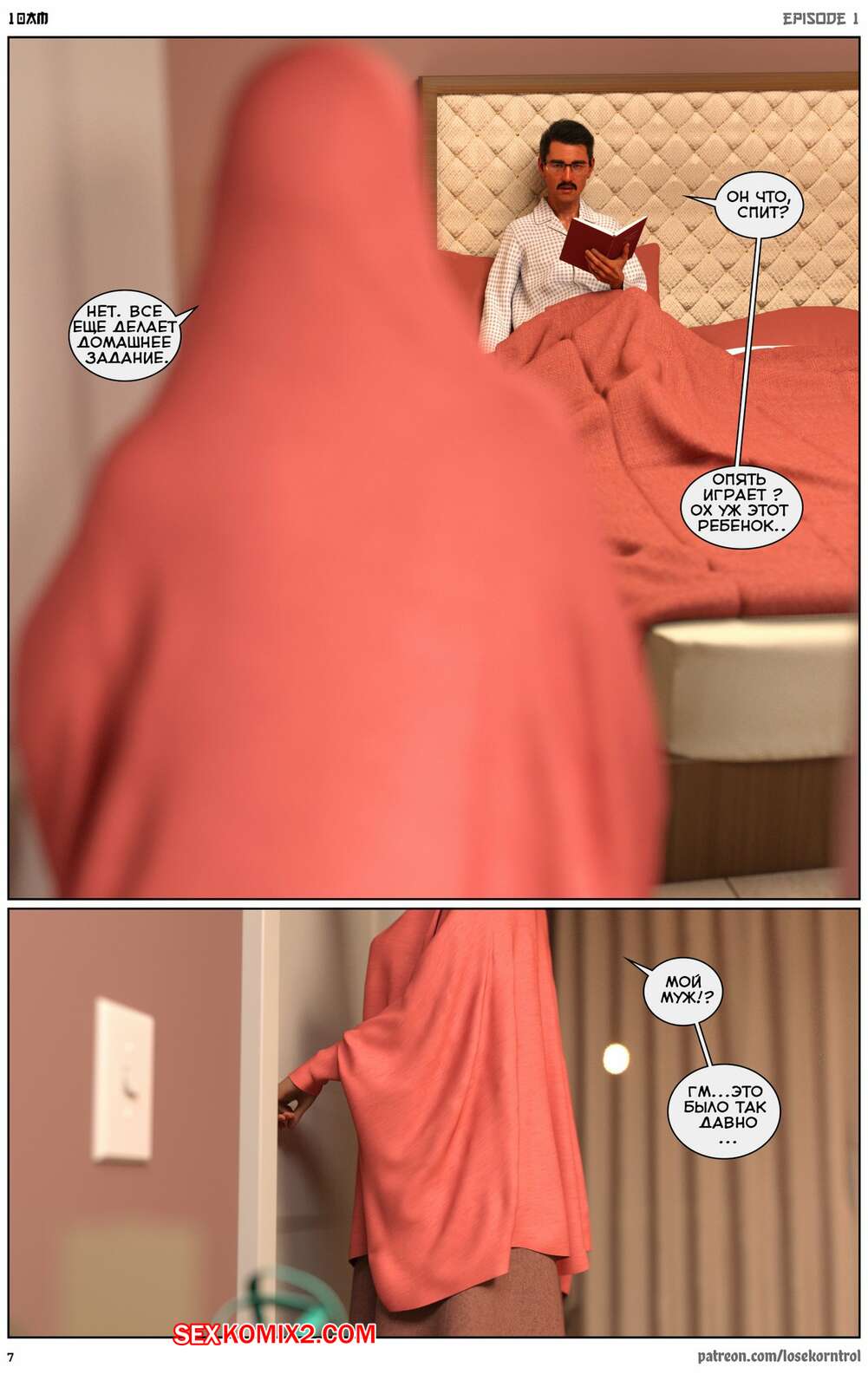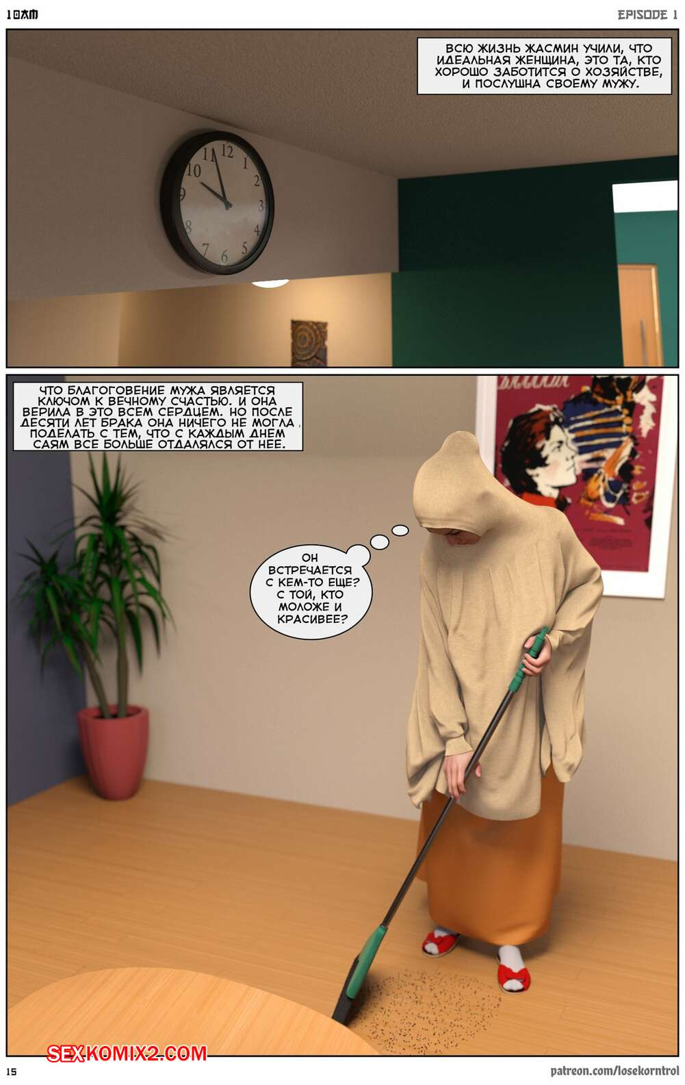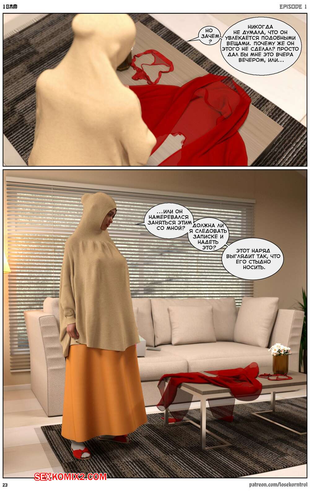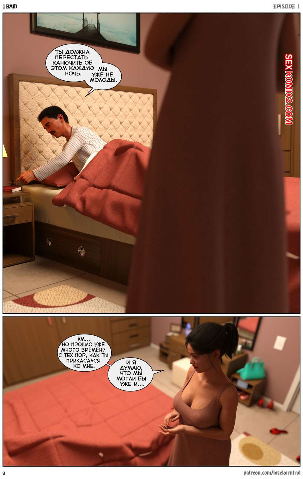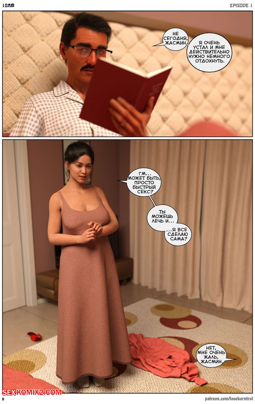 Порно комикс 10 утра. 10 am. LoseKorntrol Горячая сисястая милфа брюнетка постоянно возбуждена и пытается потрахаться со своим мужем, но он не обращает на нее внимания. Девушка сшила тебе сексуальный наряд и решила немного развлечься.