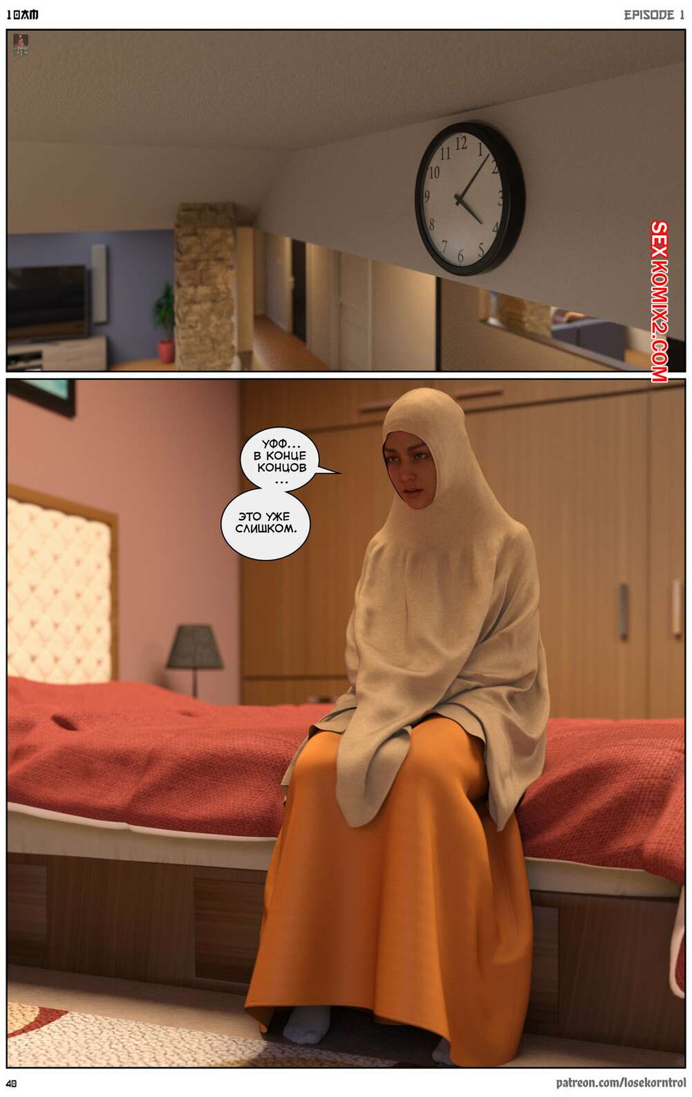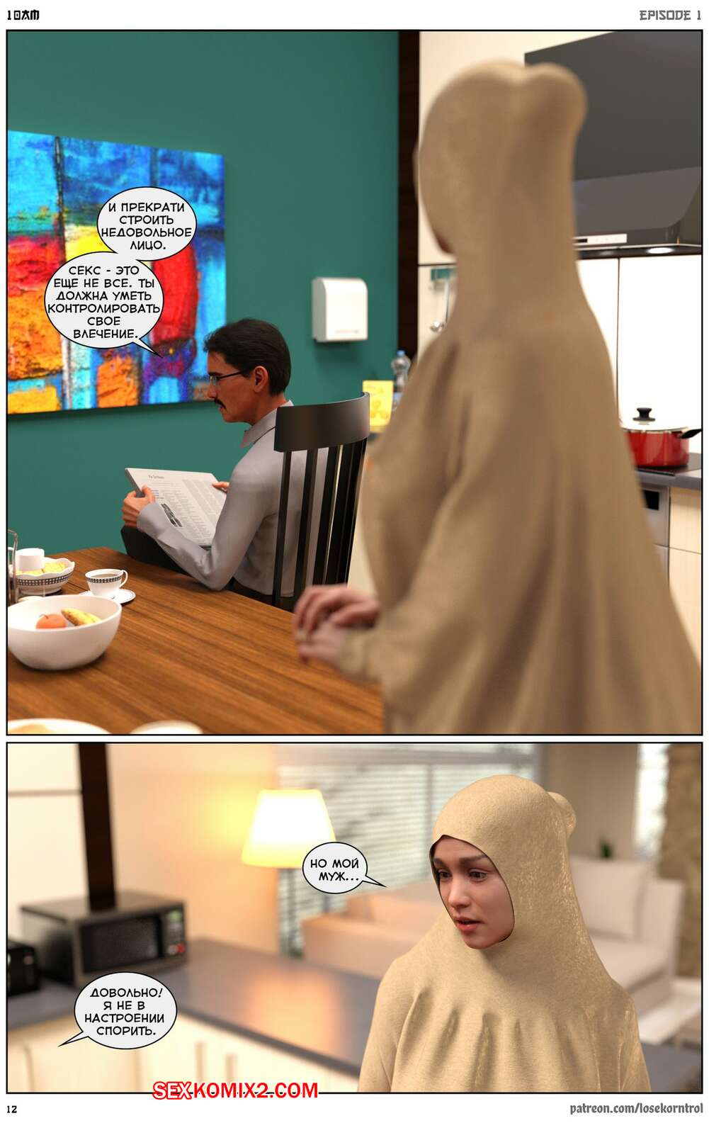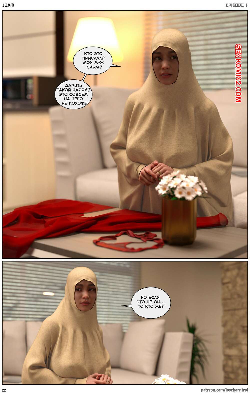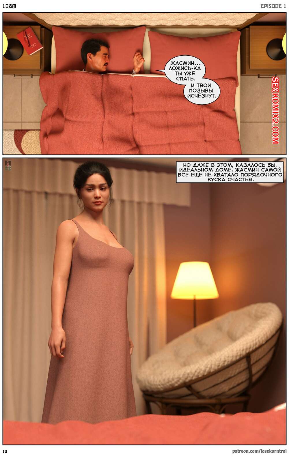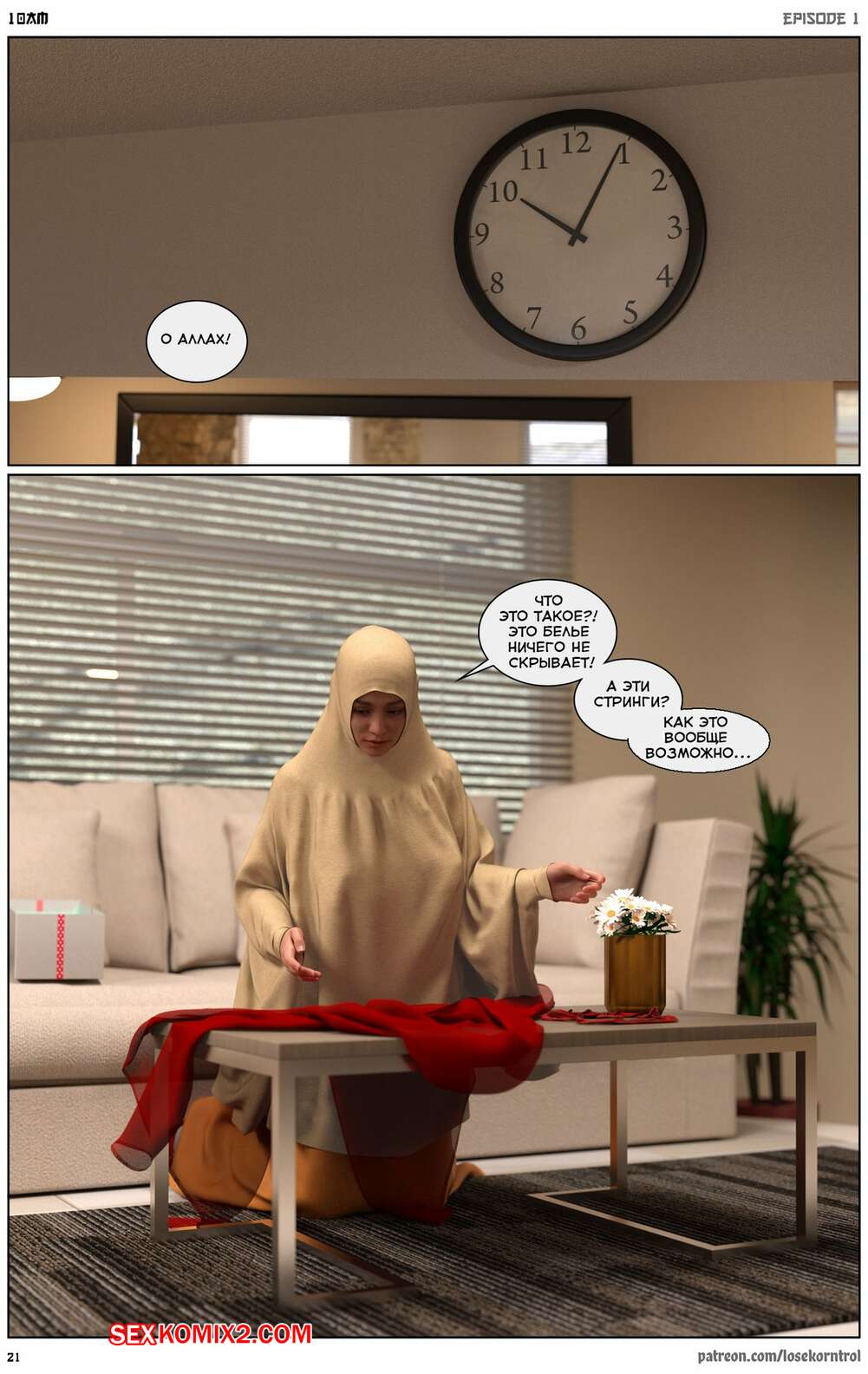 Порно комикс 10 утра. 10 am. LoseKorntrol Горячая сисястая милфа брюнетка постоянно возбуждена и пытается потрахаться со своим мужем, но он не обращает на нее внимания. Девушка сшила тебе сексуальный наряд и решила немного развлечься.