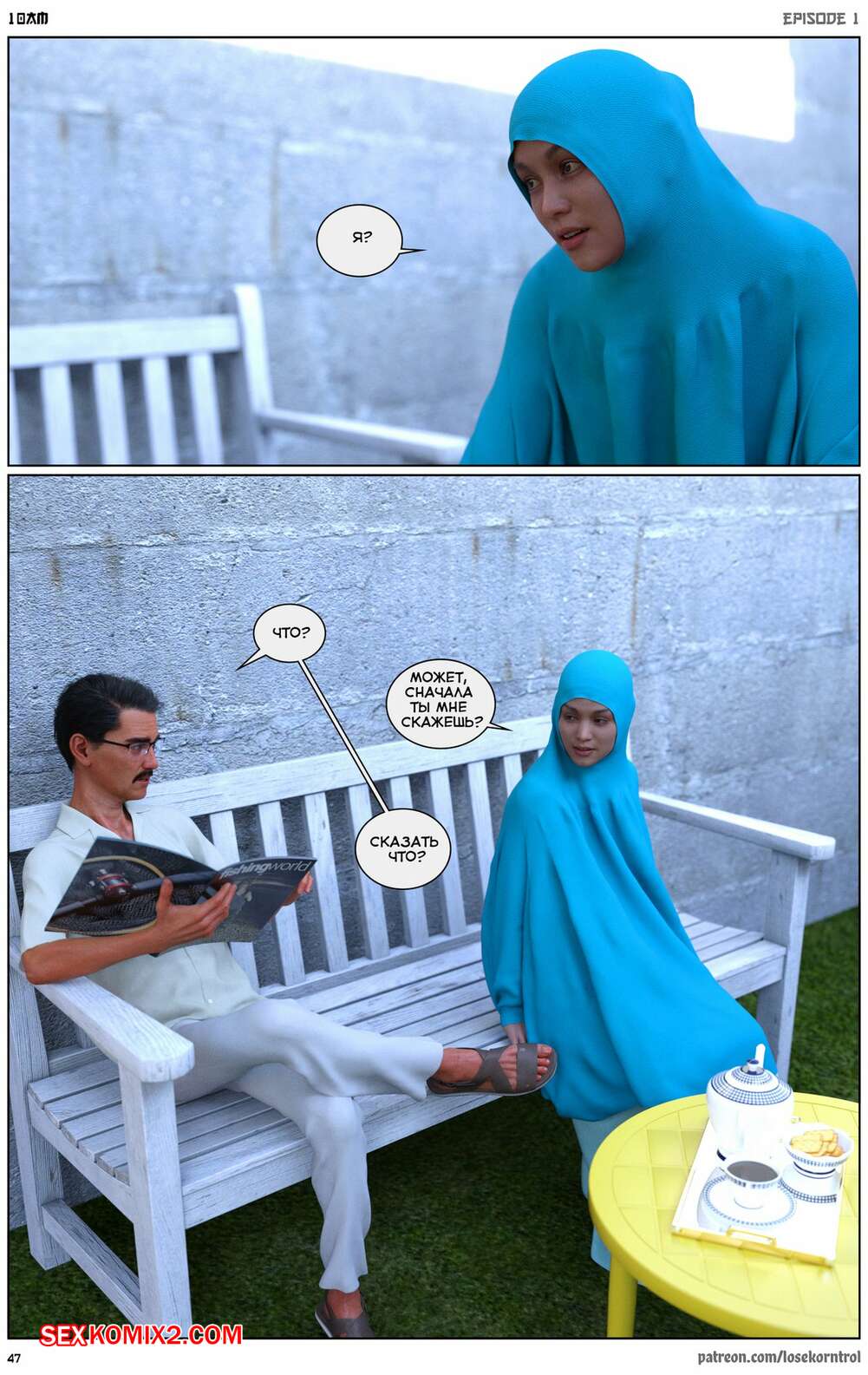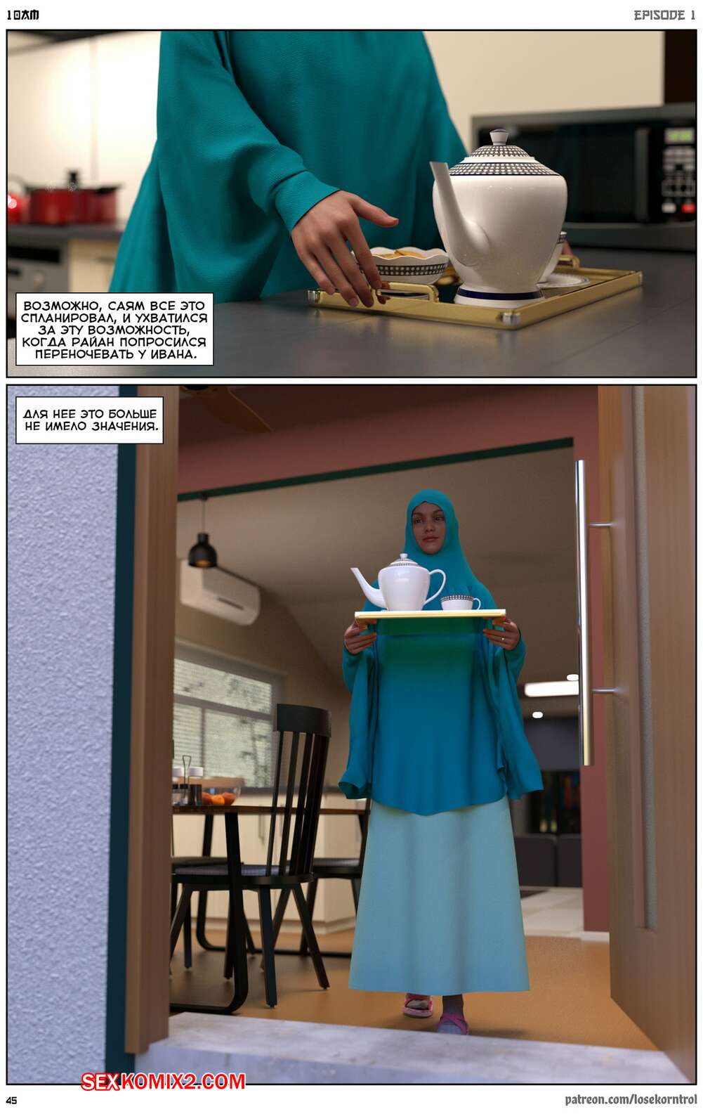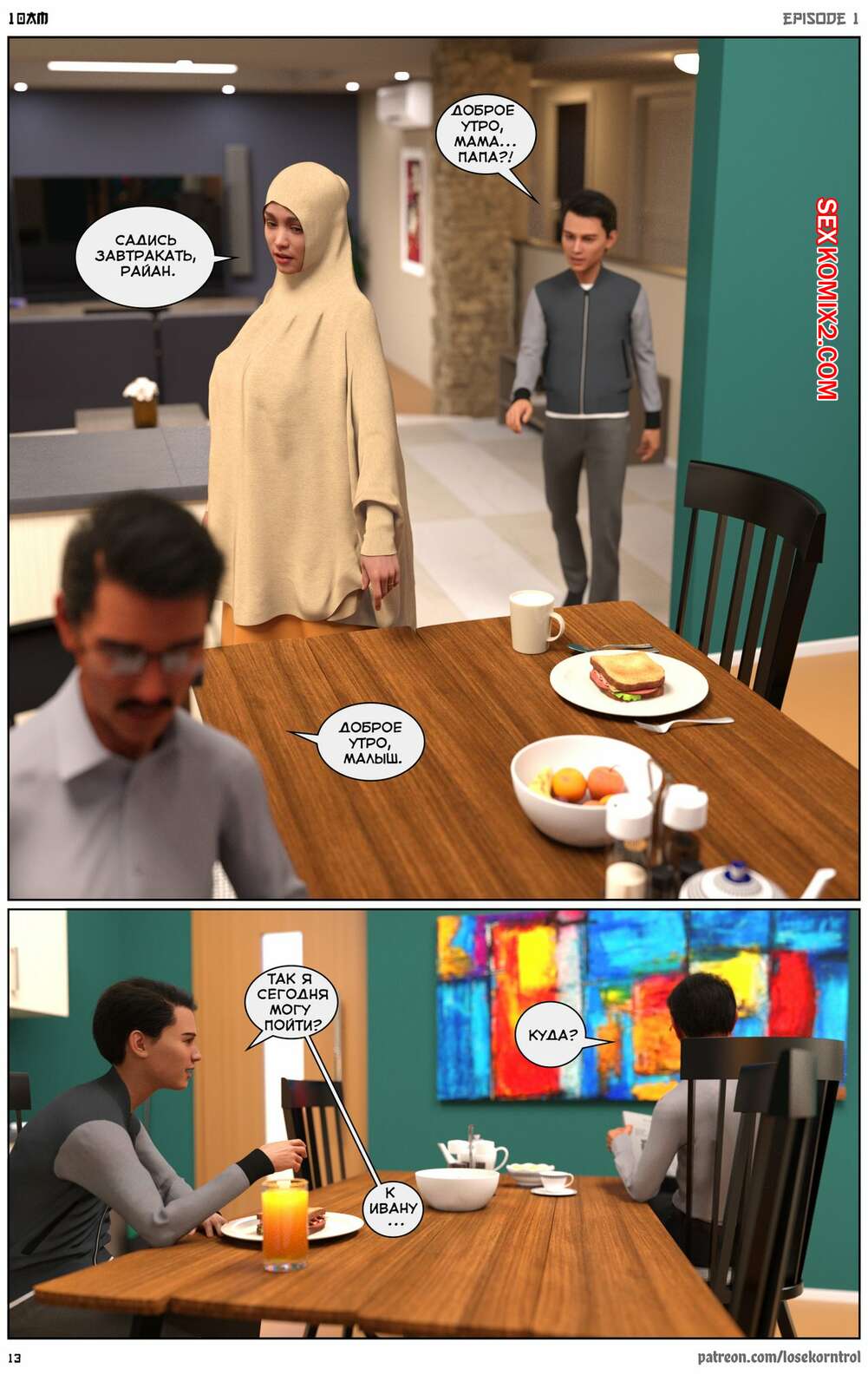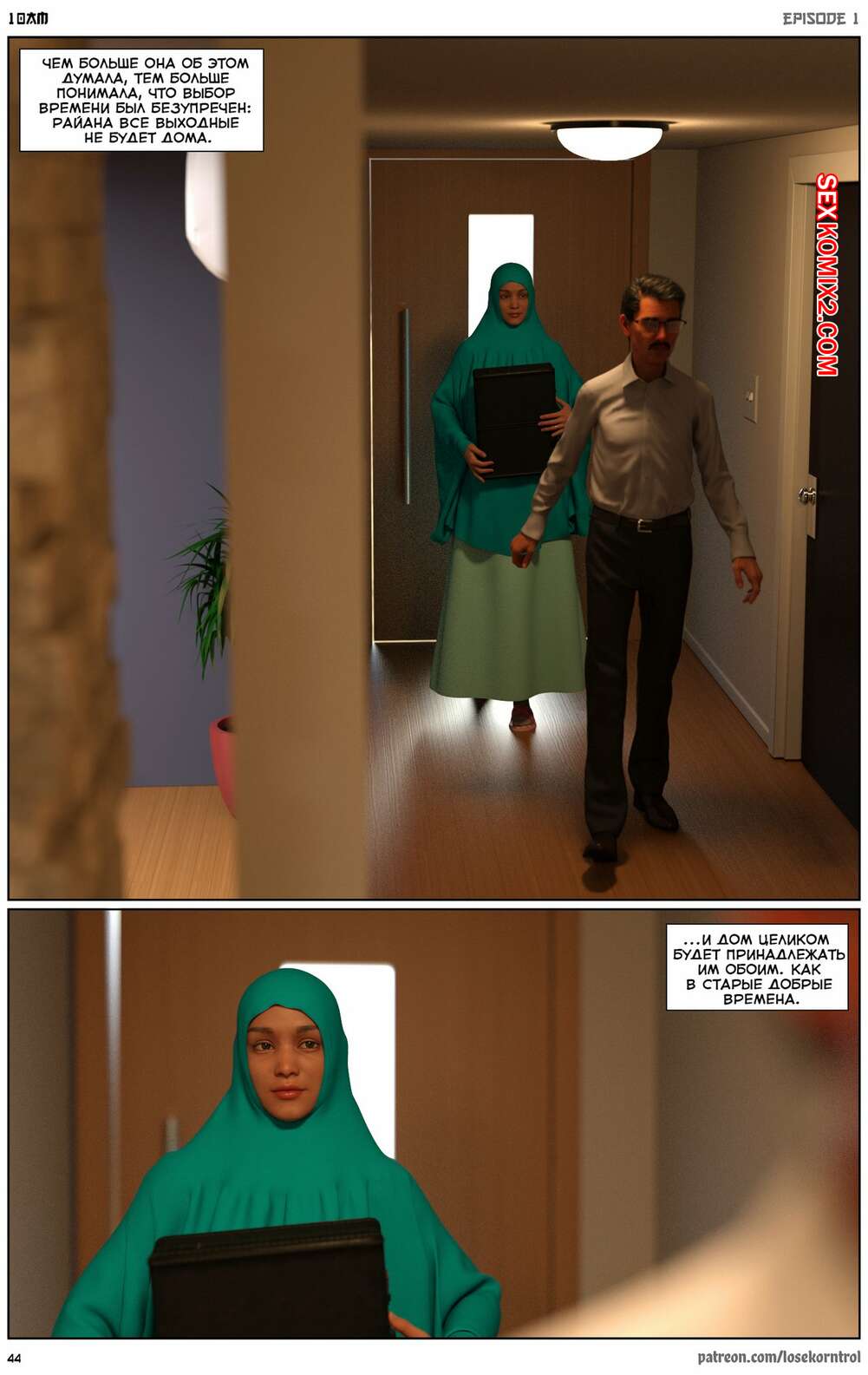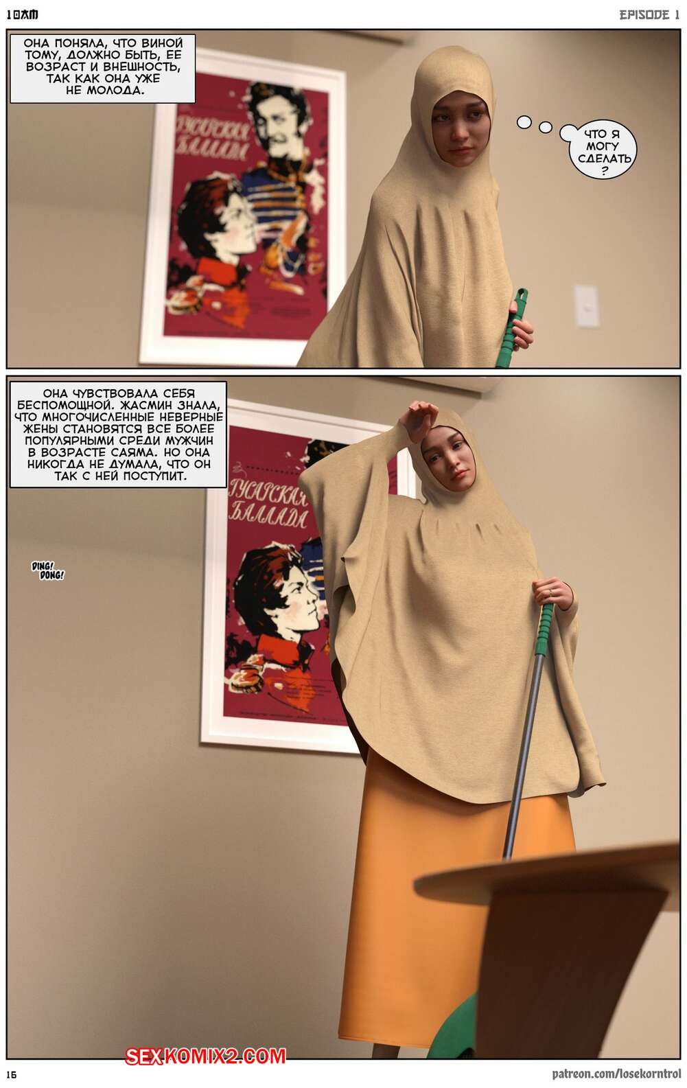 Порно комикс 10 утра. 10 am. LoseKorntrol Горячая сисястая милфа брюнетка постоянно возбуждена и пытается потрахаться со своим мужем, но он не обращает на нее внимания. Девушка сшила тебе сексуальный наряд и решила немного развлечься.