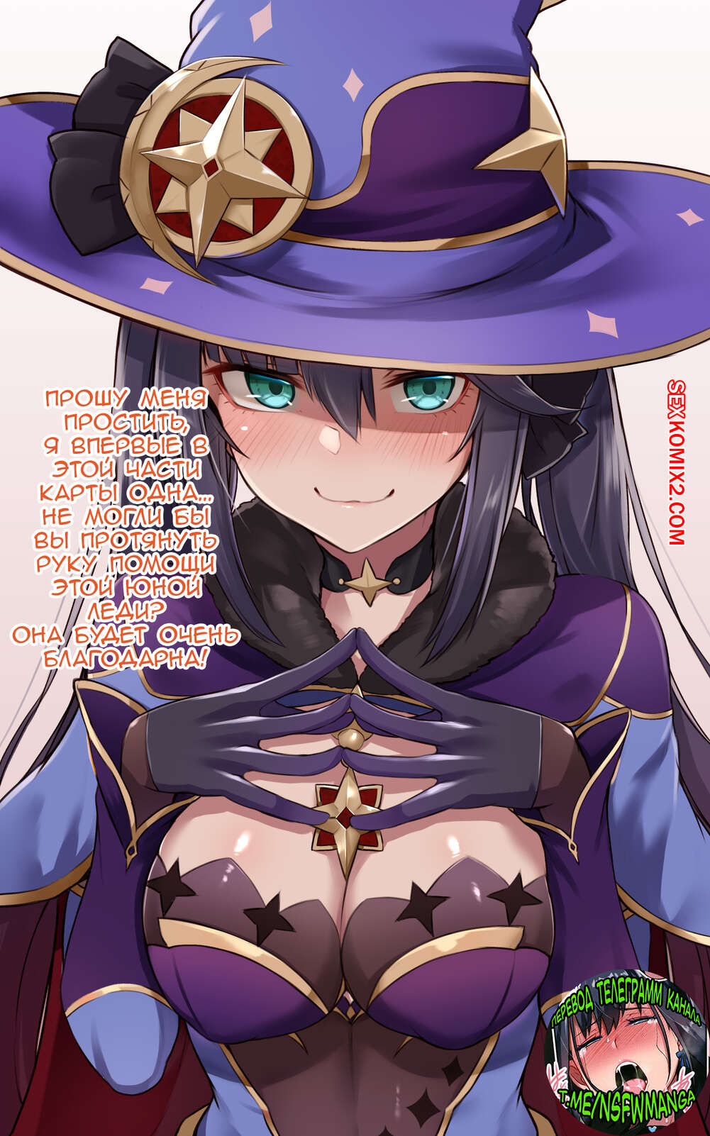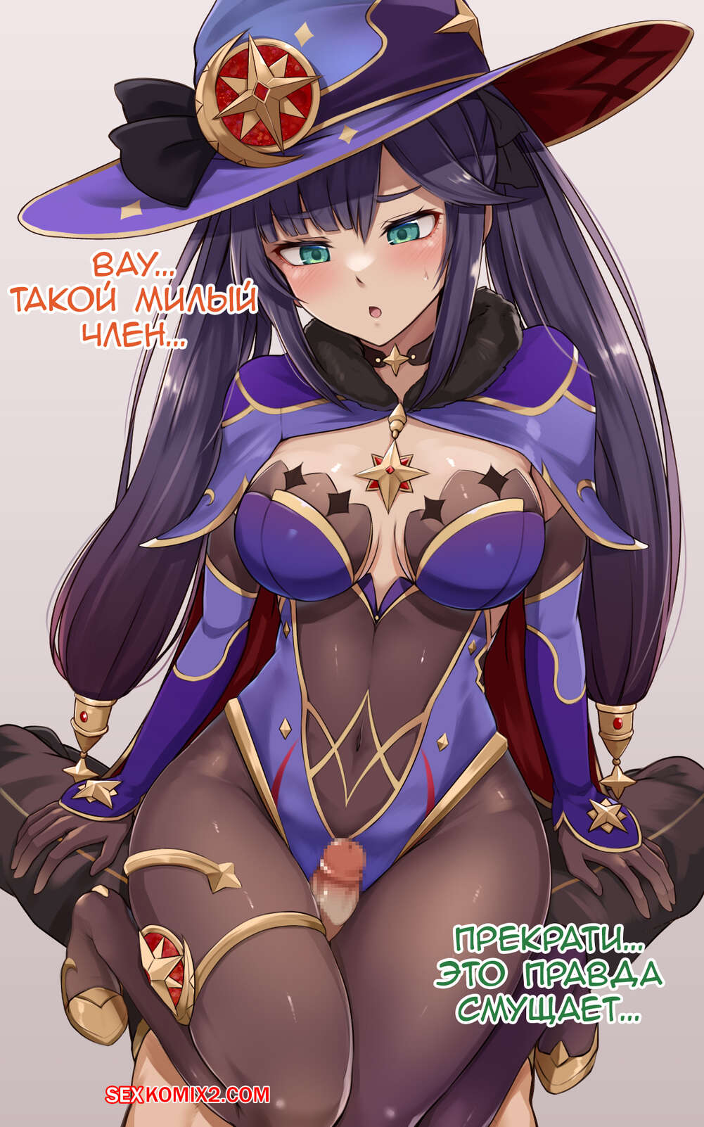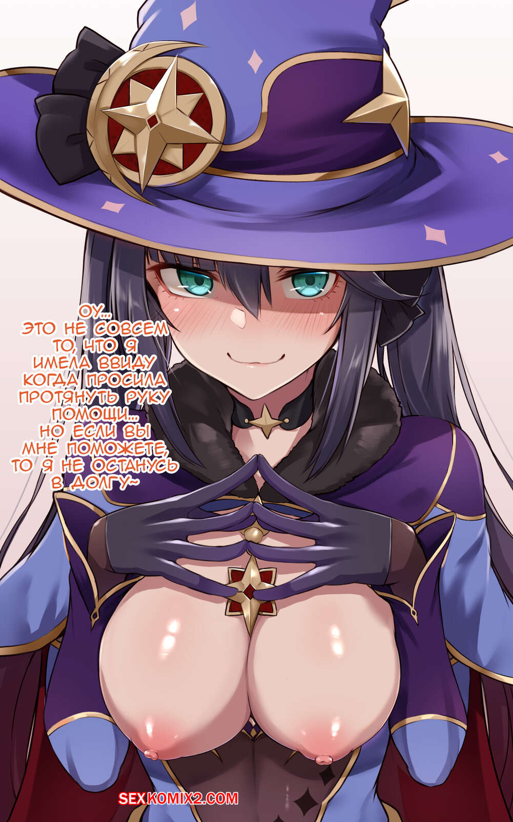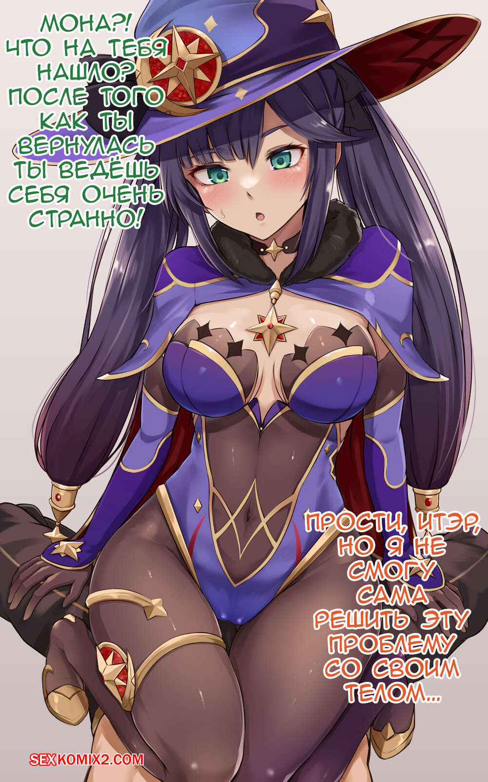 Порно комикс Genshin Impact. Мона заблудилась Горячая сисястая красотка брюнетка заблудилась и решила повеселиться с пареньком с большим хуем. Она стала ласкать его большой член и дрочить его своими ножками, заставляя парня кончить.