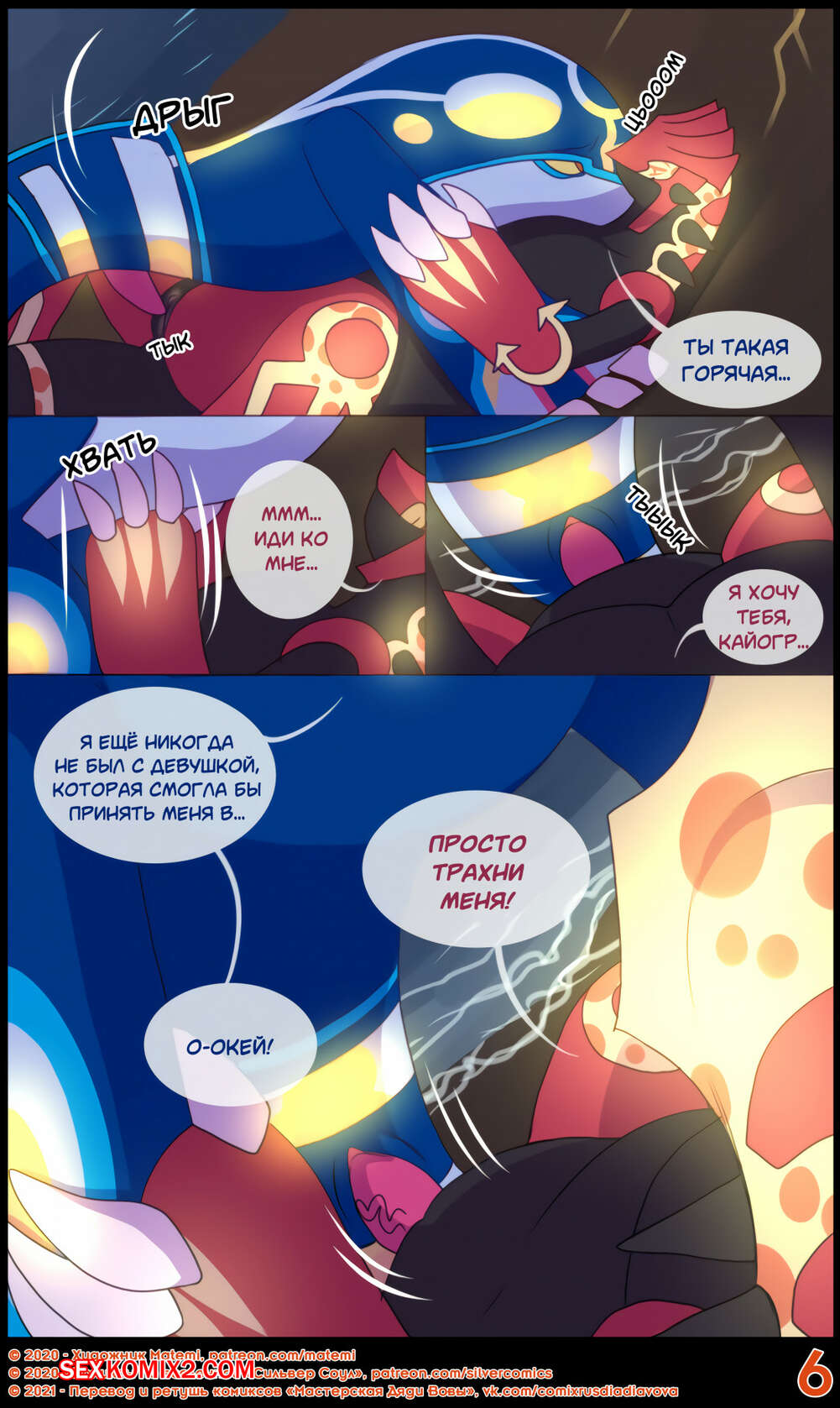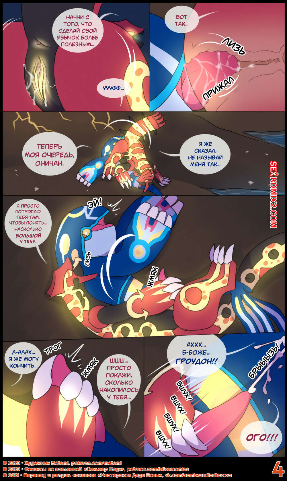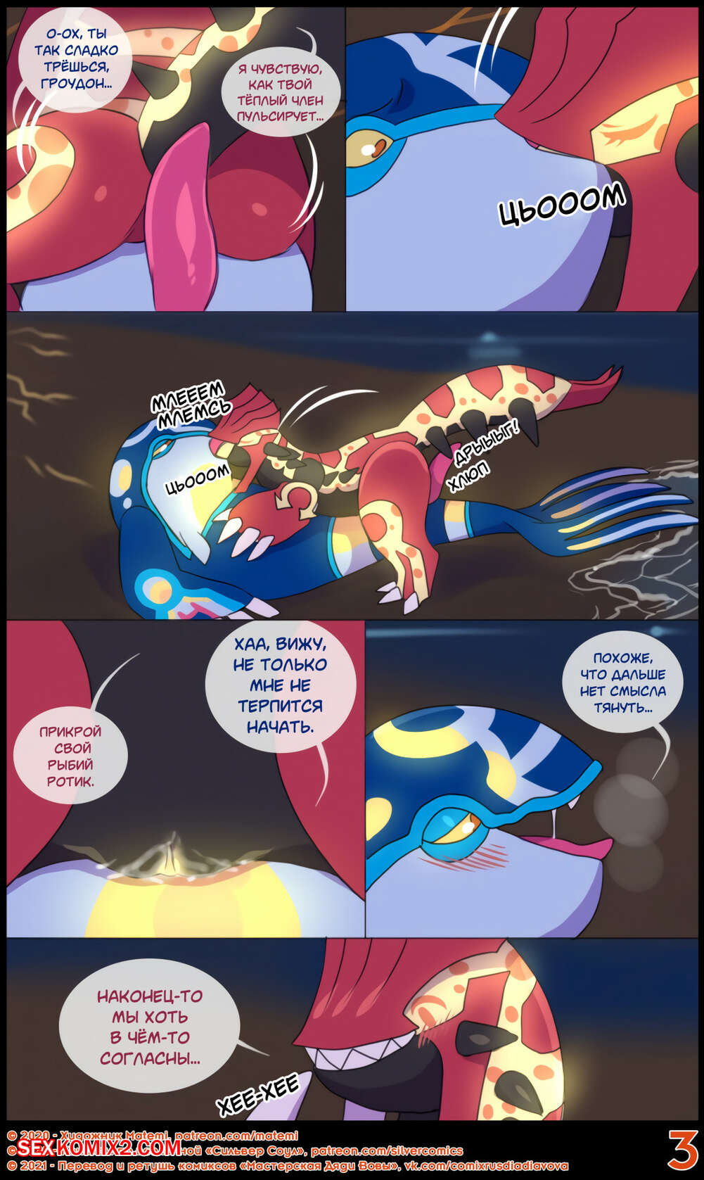 Порно комикс Сильвер. Покемоны. ПЛС. Гроудон и Кайогр Горячая сисястая красотка покемон невероятно возбудилась и решила повеселиться со своим дружком. Она разделась и стала сосать его большой хуй, после чего дала ему себя хорошенько выебать.