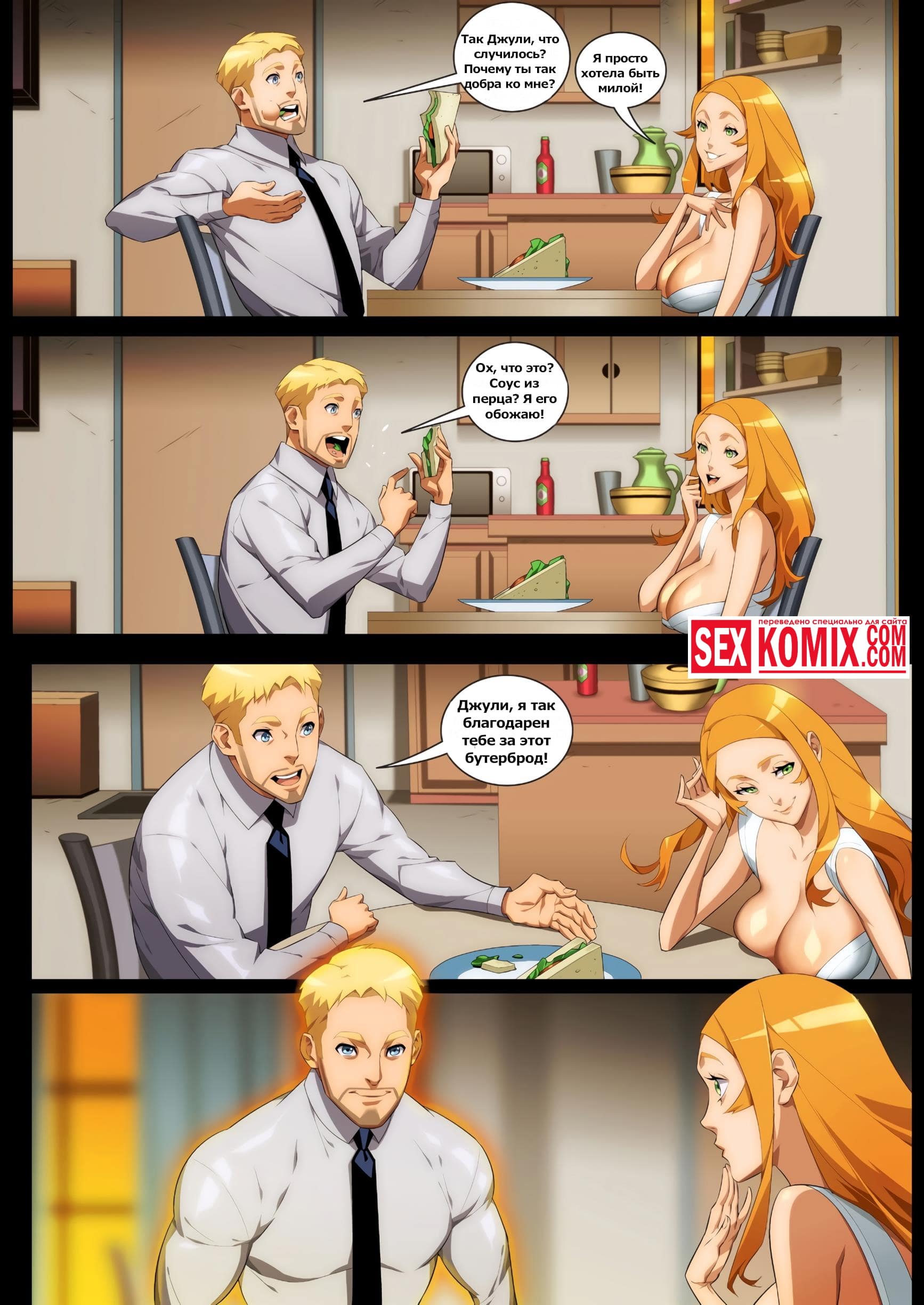 Порно комикс Энергетический соус. Муж со своей сексуальной женой постоянно ищут способ разнообразить свой секс. Им случайно попадается соус, после которого они становятся крупнее и сильнее, это сразу добавляет остроты их отношения. Теперь супруги увеличивают друг друга и занимаются сексом.